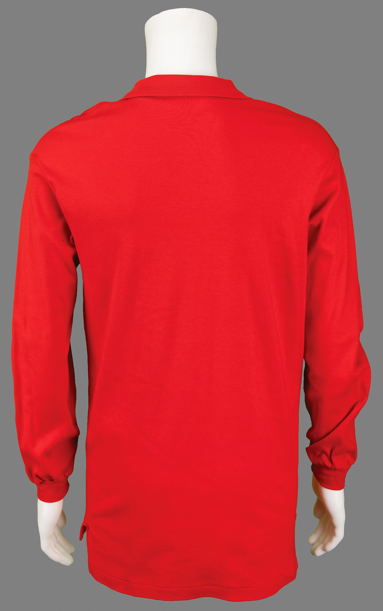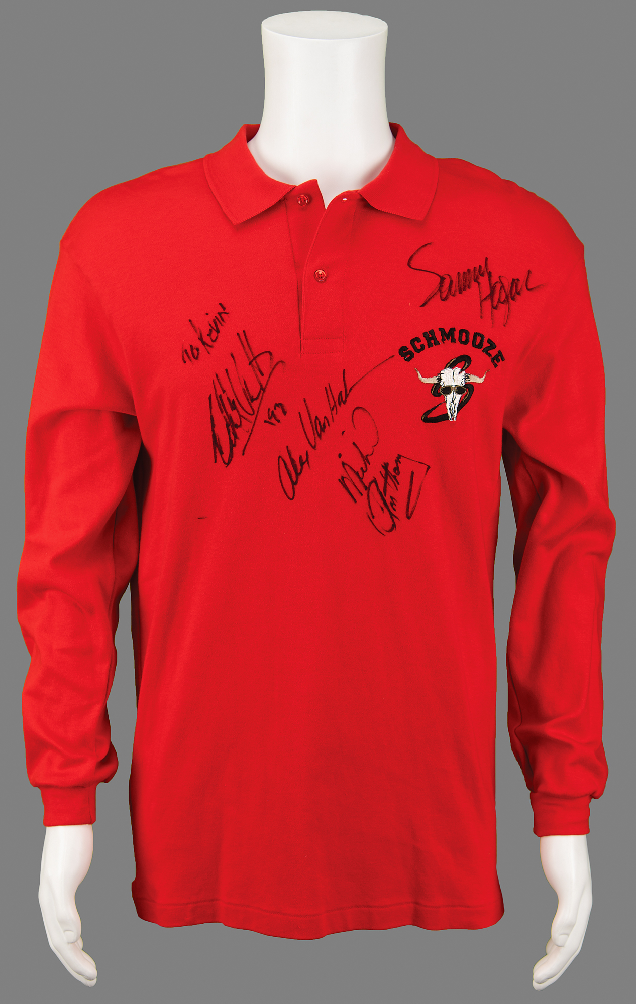 Red long-sleeve polo shirt embroidered with a "Schmooze" emblem on the chest, size L, prominently signed and inscribed on the front in black felt tip, "To Kevin, Eddie Van Halen, 93," "Alex Van Halen," "Michael Anthony," and "Sammy Hagar." In fine condition.
