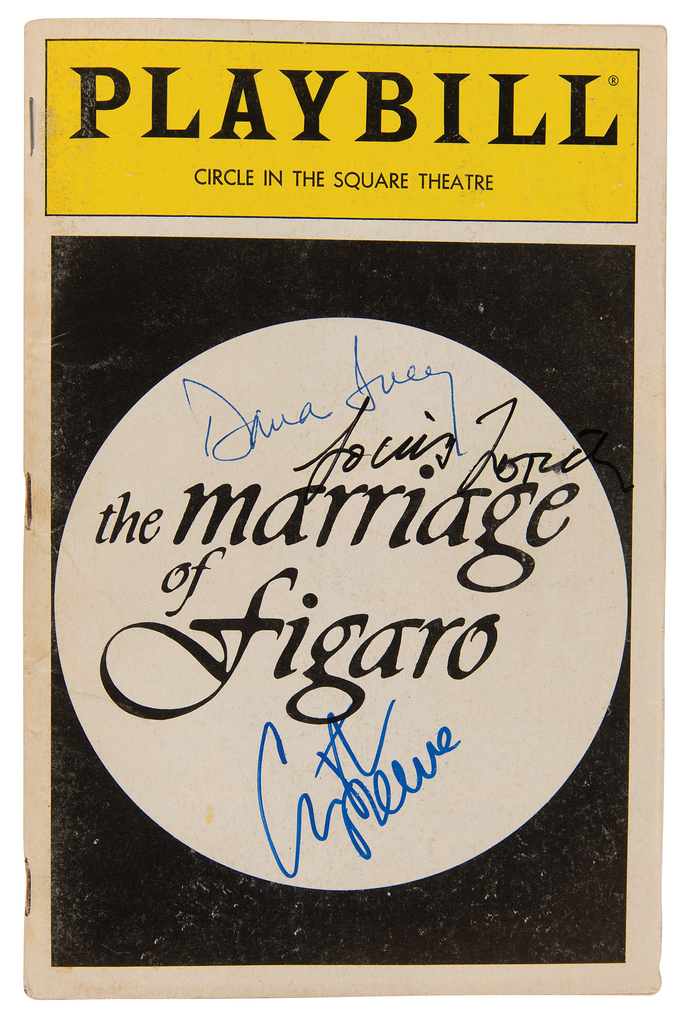 Playbill for the Broadway production of The Marriage of Figaro at the Circle in the Square Theatre in New York City on November 11, 1985, 98 pages, 5.5 x 8.5, signed on the front cover in blue felt tip by Christopher Reeve, who played the role of Count Almaviva. The cover is also signed in ballpoint and felt tip by Dana Ivey and Louis Zorich. In fine condition, with light handling wear.