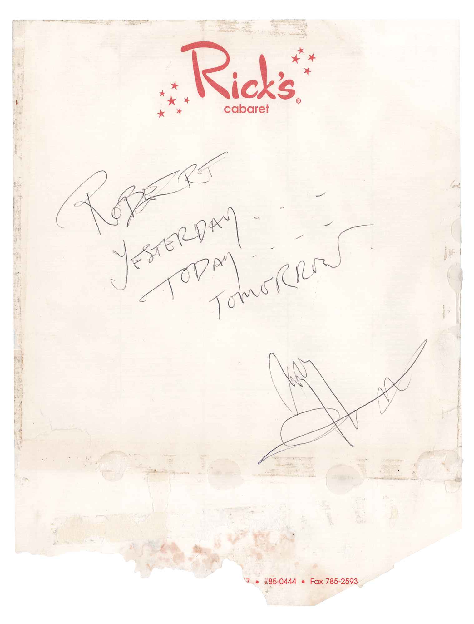 Ballpoint signature and inscription, "Robert, Yesterday…Today…Tomorrow, Jimmy Page,” on an off-white 8.5 x 11 stationery sheet from Rick's Cabaret. In very good to fine condition, with edge tears and old mounting residue, almost all of which could be successfully matted out.