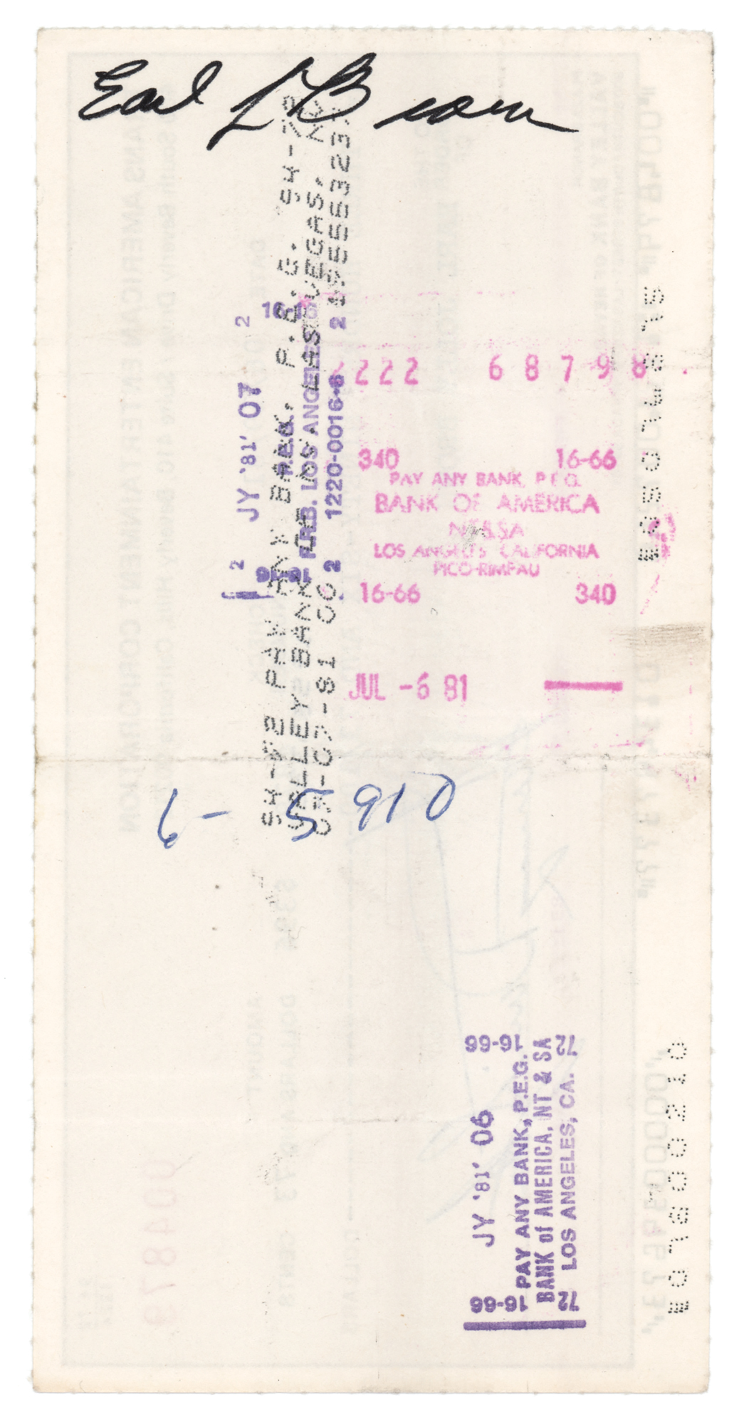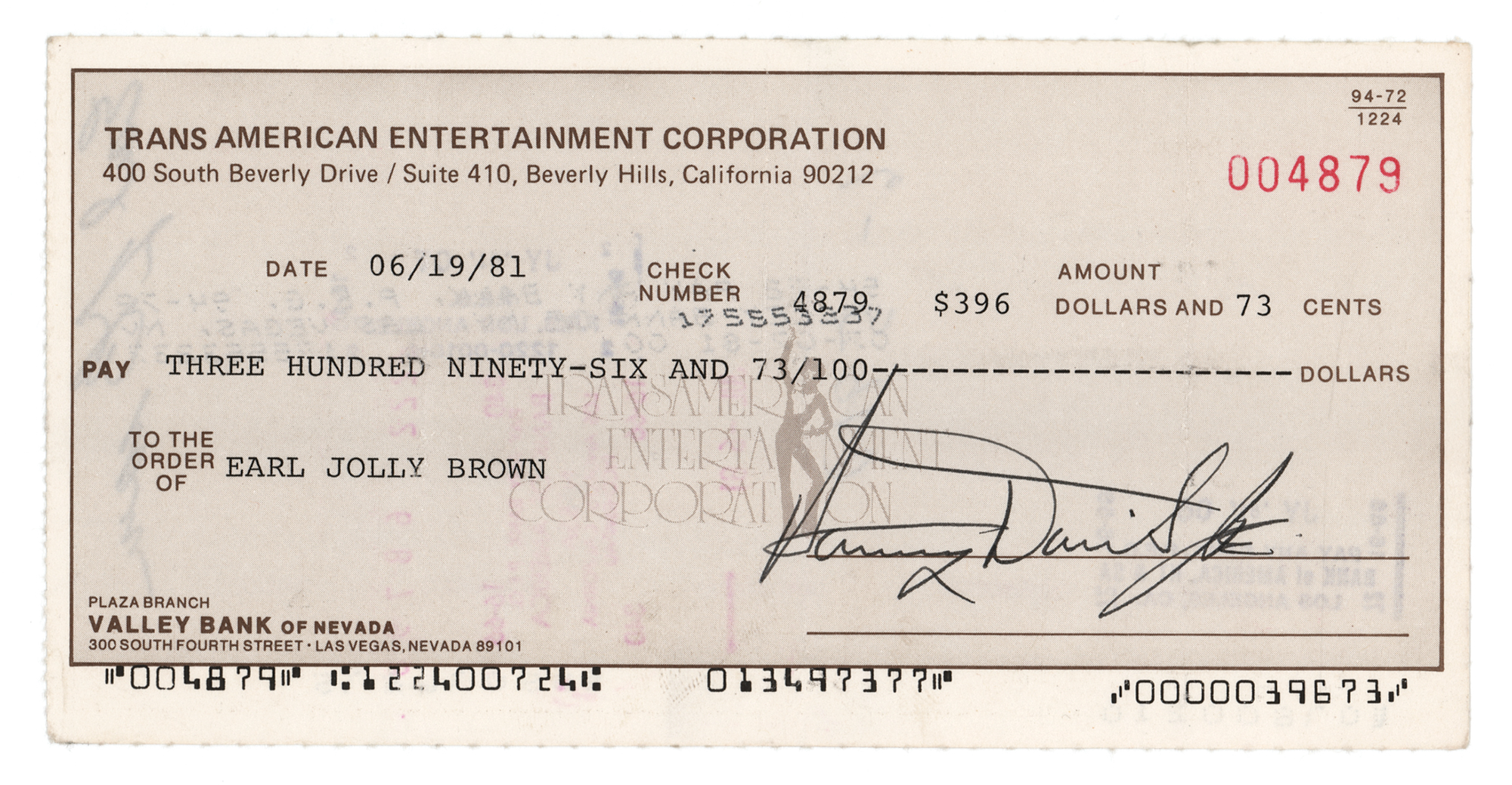 Trans American Entertainment Corporation business check, 7 x 3.5, filled out in type and signed by Davis, "Sammy Davis, Jr.," payable to Earl Jolly Brown for $396.73, June 19, 1981, and endorsed on the reverse by Brown. In fine condition. Earl Jolly Brown (1939–2006) was an actor whose best known role was as 'Whisper,' a henchman in the 1973 James Bond film Live and Let Die.
