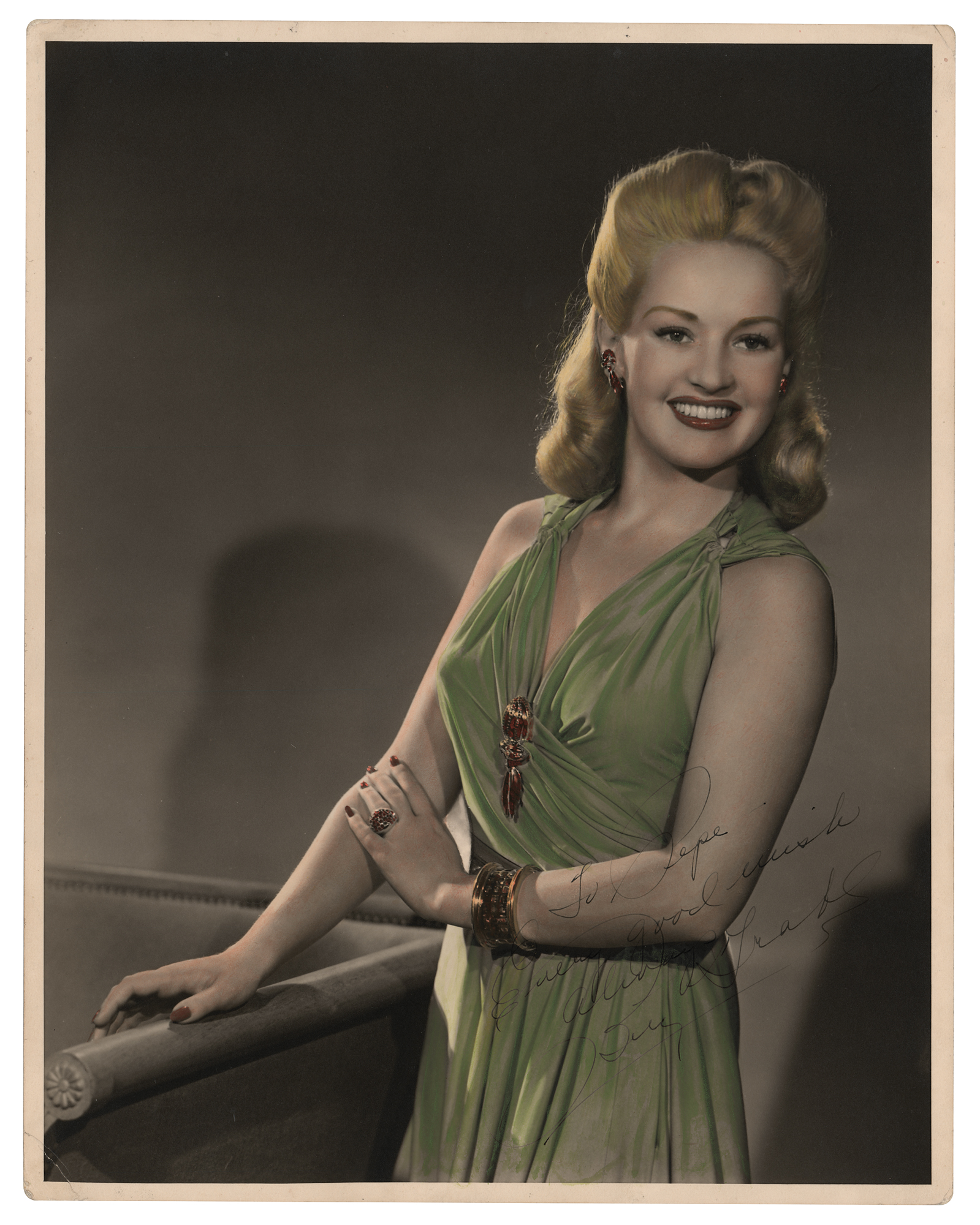 Uncommon color vintage matte-finish 11 x 14 photo of the beautiful actress, signed and inscribed in fountain pen, "To Pepe—Every good wish always, Betty Grable.” In fine condition.