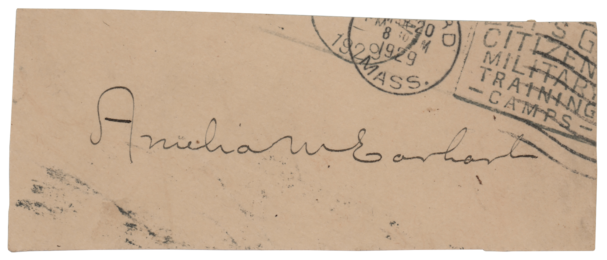 Ink signature, "Amelia Earhart,” on a trimmed off-white 4.25 x 1.75 sheet postmarked March 20, 1929. In fine condition, with several postal impressions, none of which affect the signature.