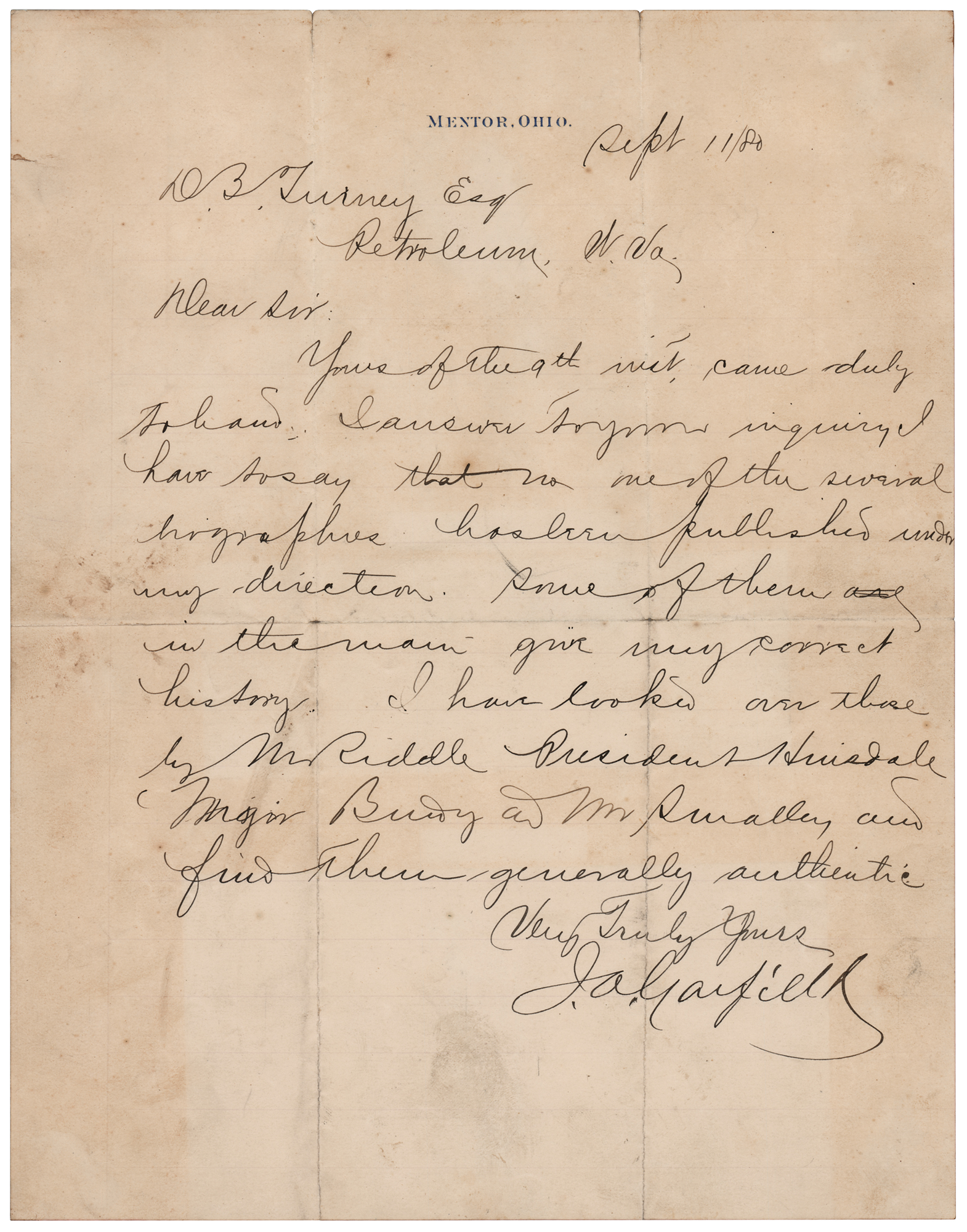 LS signed “J. A. Garfield,” one page, 8 x 10.25, Mentor, Ohio letterhead, September 11, 1880. Letter to D. B. Turney, in full: “Yours of the 9th inst. Came duly to hand. In answer to your inquiry I have to say that no one of the several biographies has been published under my direction. Some of them in the main give my correct history. I have looked over those by Mr. [A. G.] Riddle and Mr. [E. V.] Smalley and find them generally authentic.” In very good condition, with scattered staining, and splitting to the ends of the intersecting folds. A desirable missive signed less than a month before Garfield was elected as the 20th president of the United States. His mention of two pre-White House biographies speaks volumes about Garfield’s life and career before he was ever elected.