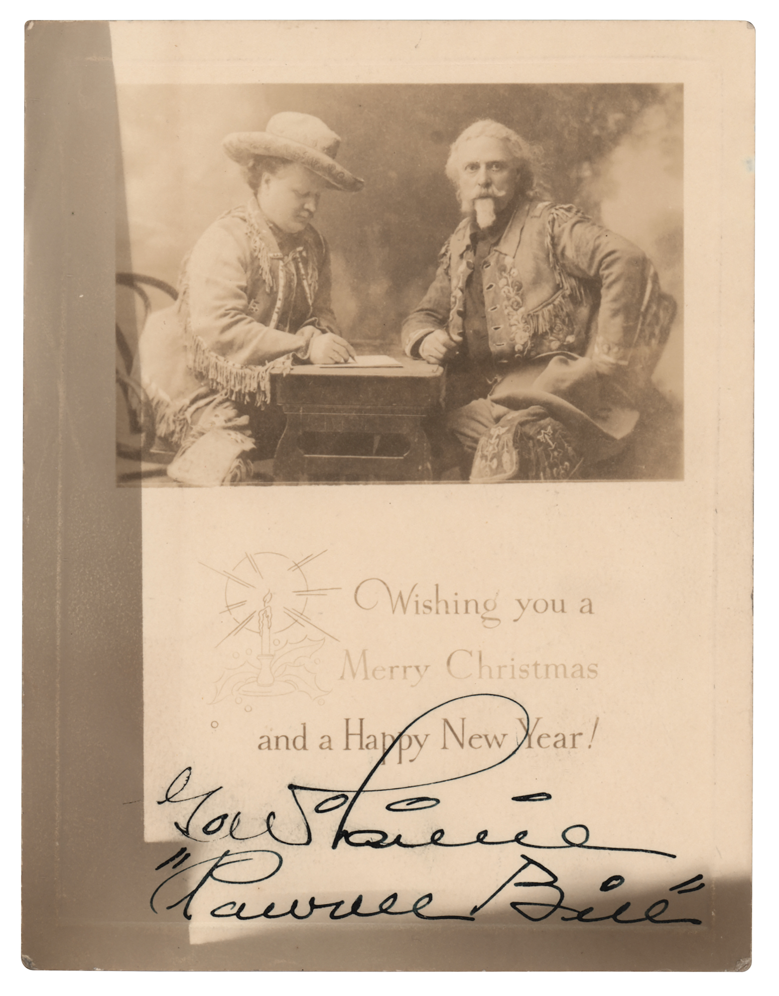 American showman (1860-1942) who began his career as a trapper and Pawnee interpreter and later became a partner in Buffalo Bill's Wild West Show. Vintage Christmas card from Pawnee Bill, 4.25 x 5.5, featuring printed text and an upper image of William F. ‘Buffalo Bill’ Cody and Gordon W. ‘Pawnee Bill’ Lillie seated together at a table, signed below in bold black ink, “G. W. Lillie, ‘Pawnee Bill.’” In very good to fine condition, with irregular toning, affecting only appearance.
