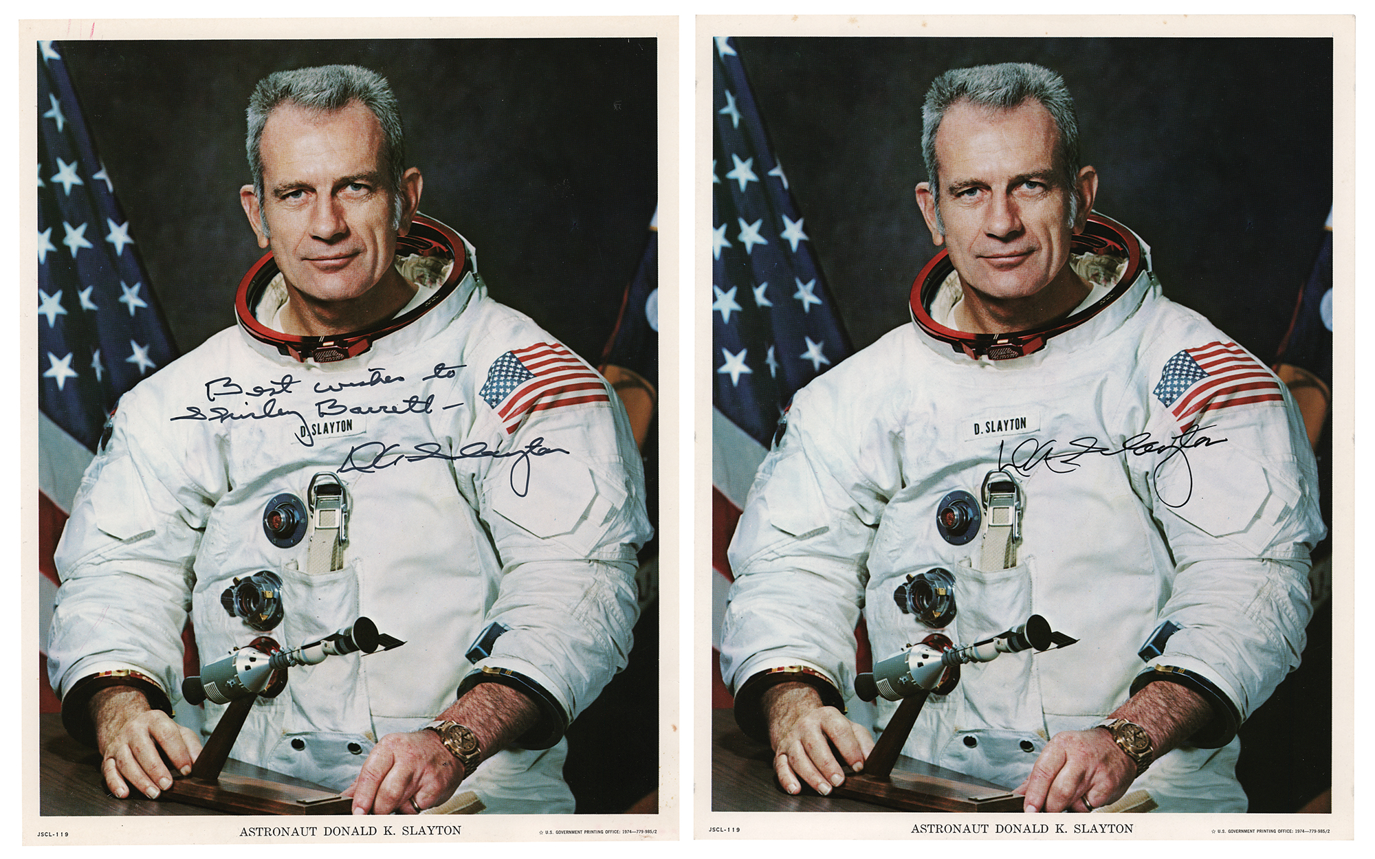 Two official color 8 x 10 NASA lithographs of Deke Slayton wearing his white space suit and posing with a small ASTP model, both signed in black felt tip, “D. K. Slayton,” who adds an inscription to one, “Best wishes to Shirley Barrett.” In overall fine condition.
