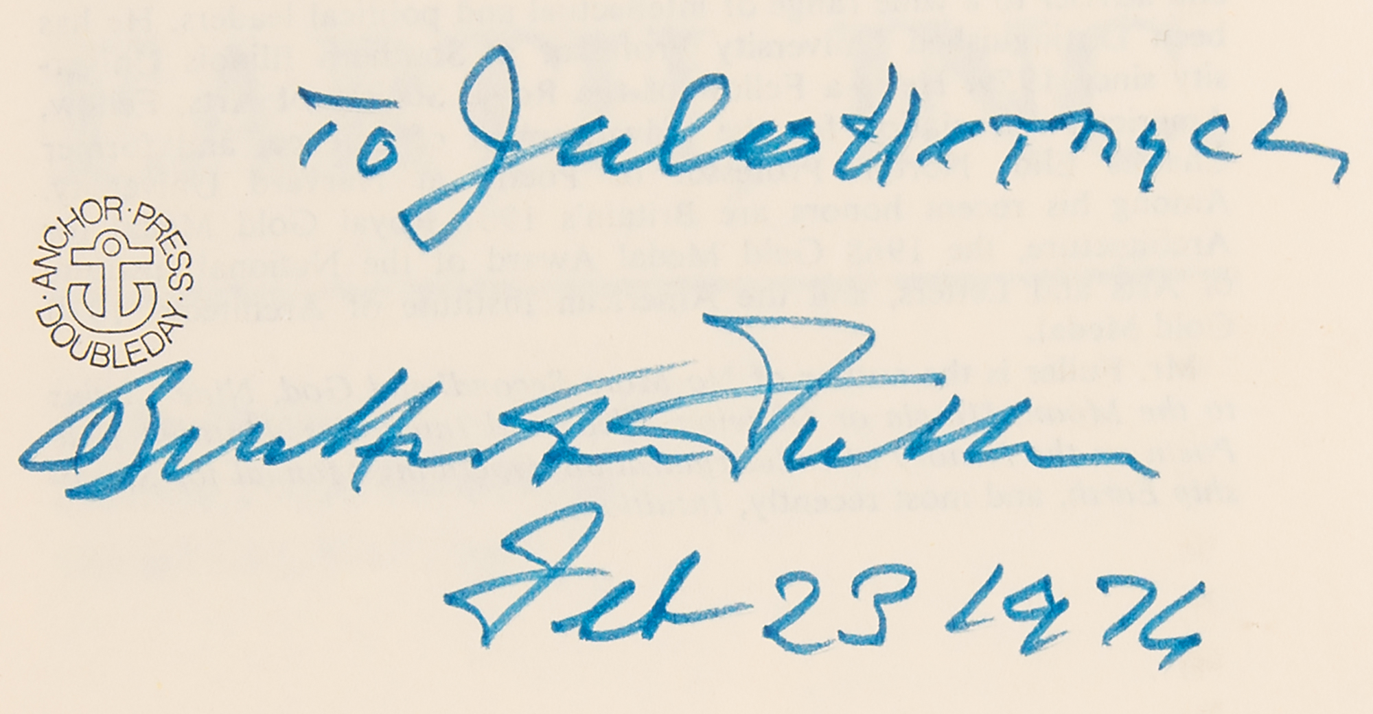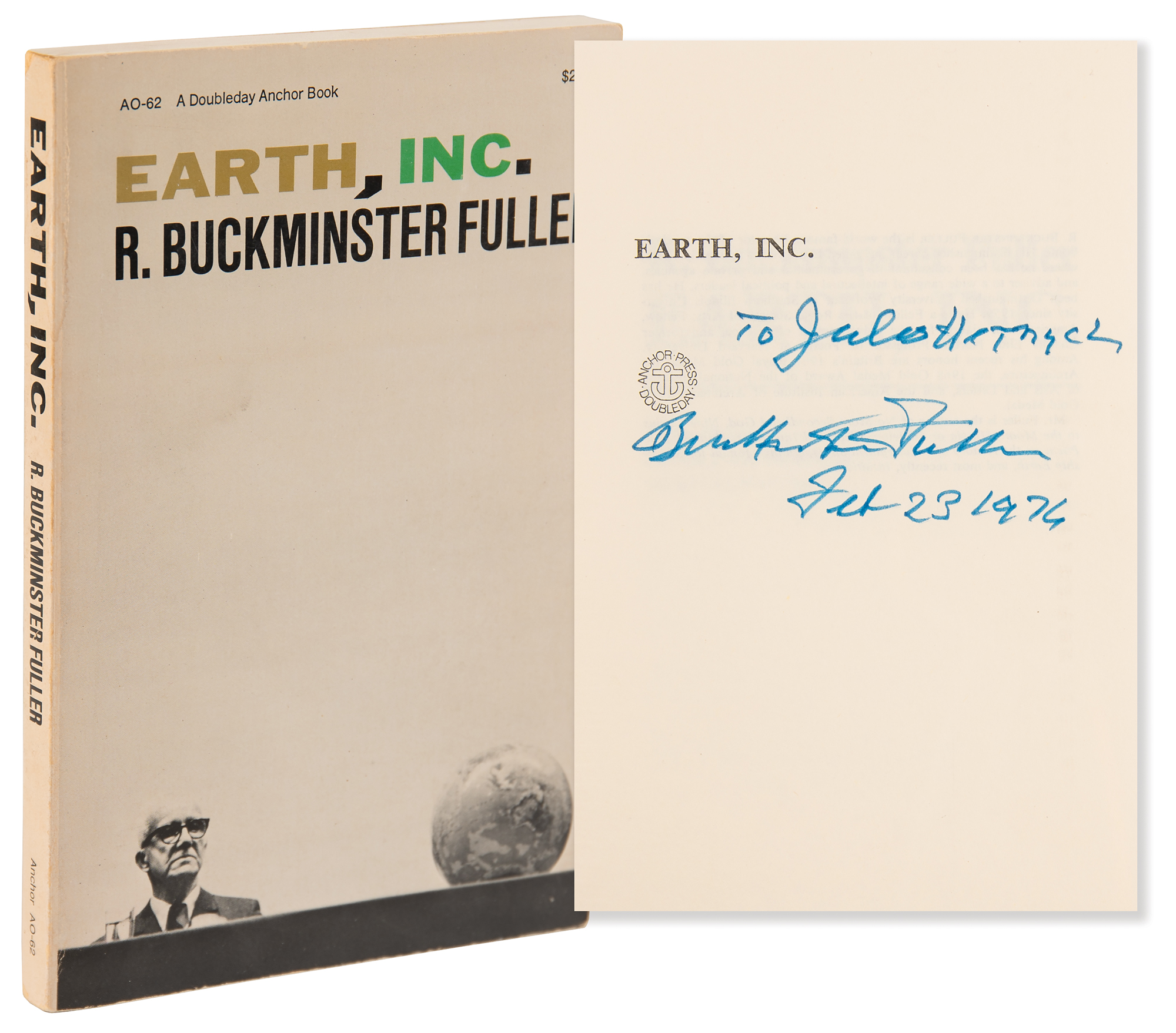 Visionary American architect, inventor, writer, and philosopher (1895-1983) perhaps best known for inventing the geodesic dome, one of the signal developments in modern design and engineering. Signed book: Earth, Inc. NY: Anchor Books, 1973. Softcover, 5.25 x 8, 180 pages. Signed and inscribed on the half-title page in blue felt tip, "Buckminster Fuller, Feb. 23, 1974." In fine condition, with light sunning to the spine.