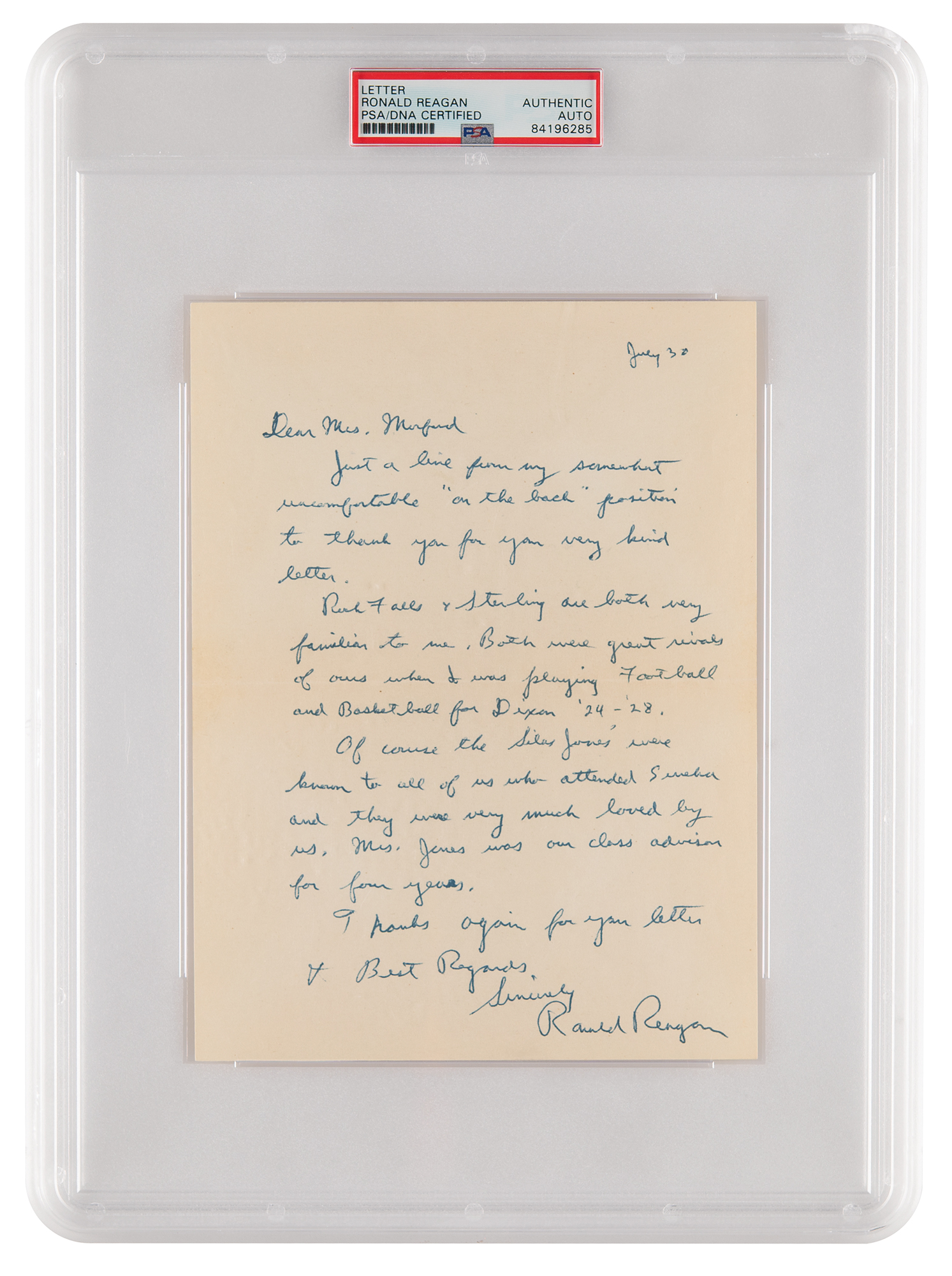 ALS, one page, 6 x 8.25, July 30 (no year). Handwritten letter from Ronald Reagan, reflecting on his high school and college years, in full: “Just a line from my somewhat uncomfortable ‘in the back’ position to thank you for your very kind letter. Rock Falls & Sterling are both very familiar to me. Both were great rivals of ours when I was playing football and basketball for Dixon ‘24 - ‘28. Of course the Silas Jones’ were known to all of us who attended Eureka and they were very much loved by us. Mrs. Jones was our class advisor for four years. Thanks again for your letter.” In fine condition. Accompanied by a full letter of authenticity from PSA/DNA. Encapsulated in a PSA/DNA authentication holder. Reagan attended Dixon High School, where he developed interests in drama and football, and, in 1928, he began attending Eureka College, where he became student body president, a member of Tau Kappa Epsilon fraternity, and played at the guard position for the 1930 and 1931 Eureka Red Devils football teams. The referenced Silas Jones was the longtime chairman of the religion department at Eureka.