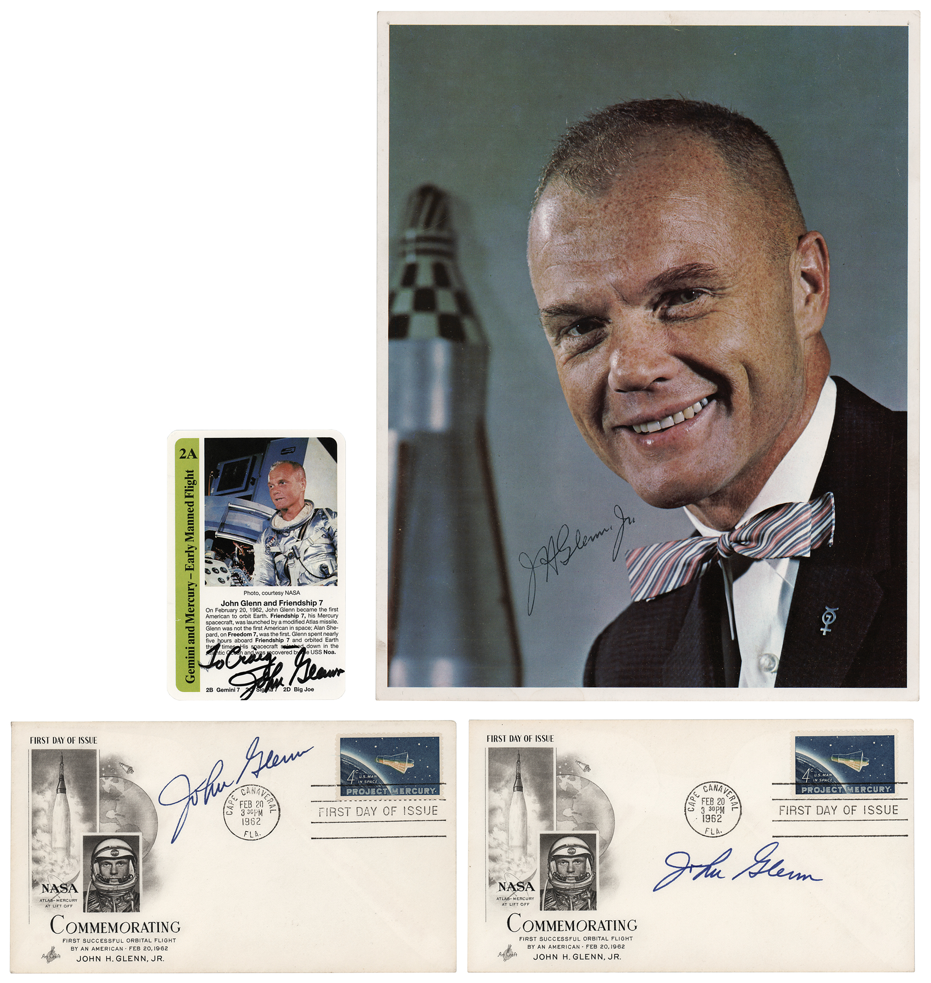 Four items: two ‘launch day’ FDCs with cachets honoring Glenn’s Mercury-Atlas 6 mission, both signed in felt tip by Glenn; a color 2.5 x 4 Smithsonian Institution playing card honoring Glenn and his Friendship 7 spacecraft, signed and inscribed in black felt tip by Glenn; and a color semi-glossy 8 x 10 portrait photo of Glenn wearing a bow tie and a Mercury Seven lapel pin, signed in black ballpoint, “J. H. Glenn, Jr.” In overall very good to fine condition, with small creases to the signed photo.