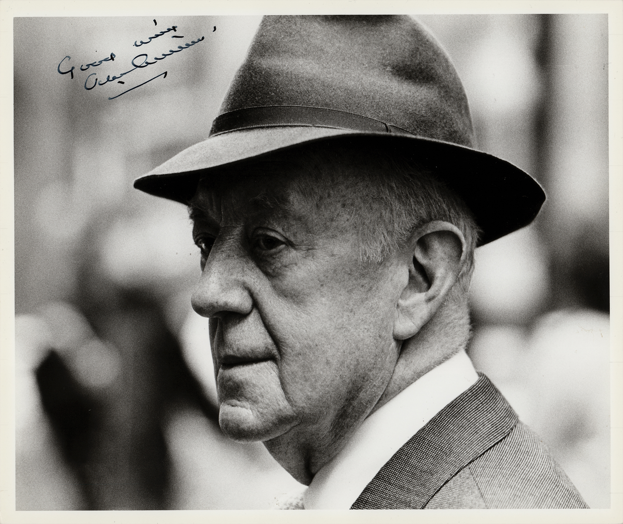 Sharp glossy 10 x 8 close-up photo of the important British actor wearing a cool fedora, signed in black ink, "Good wishes, Alec Guinness." In very fine condition.