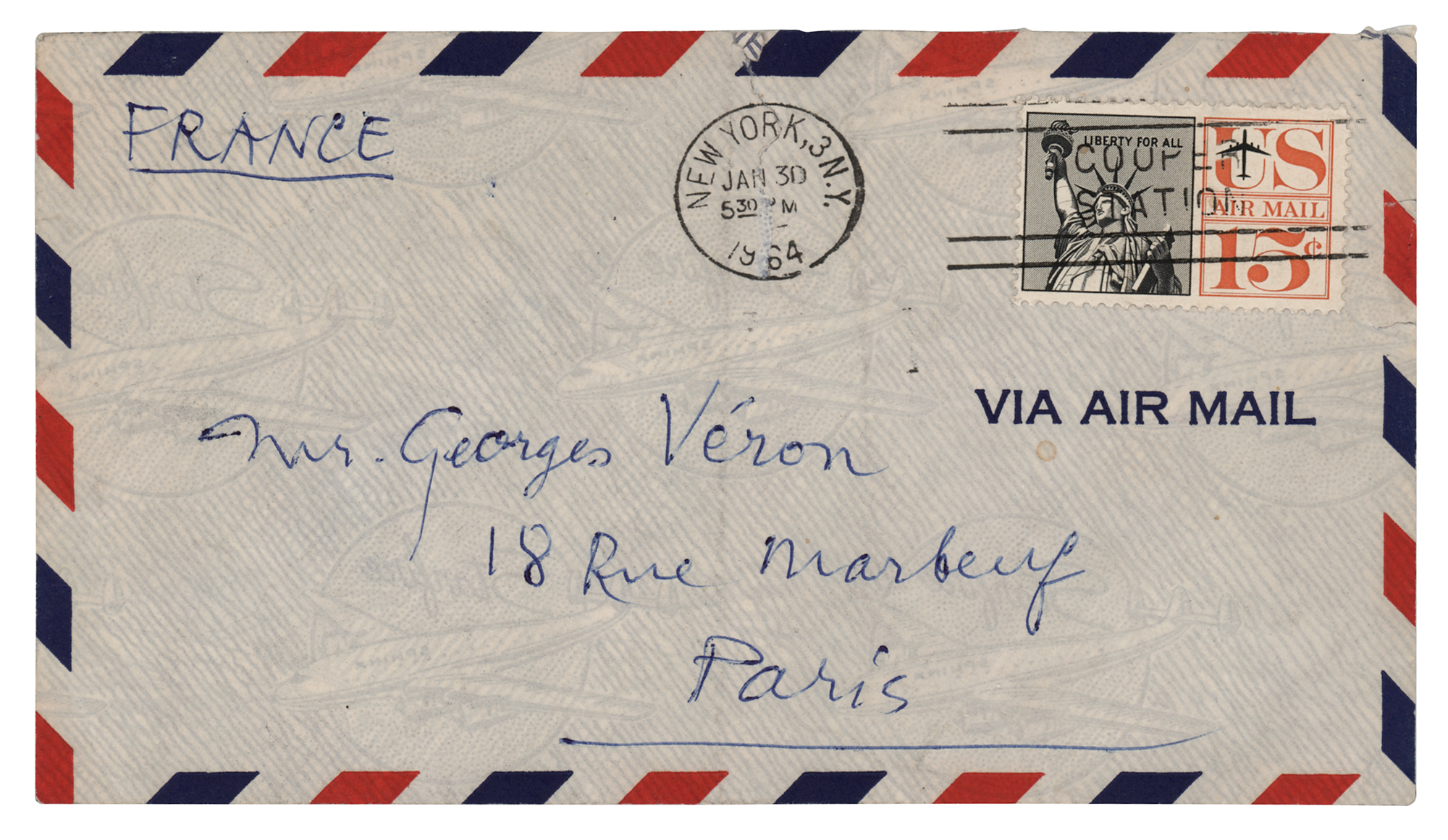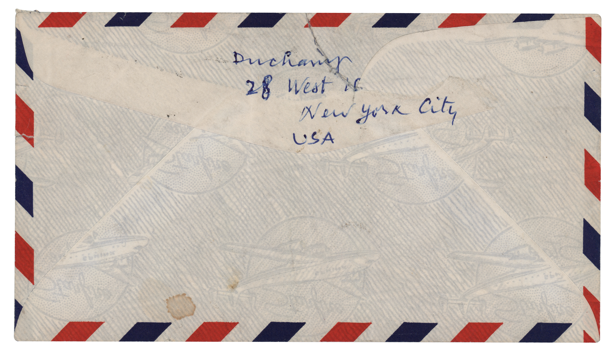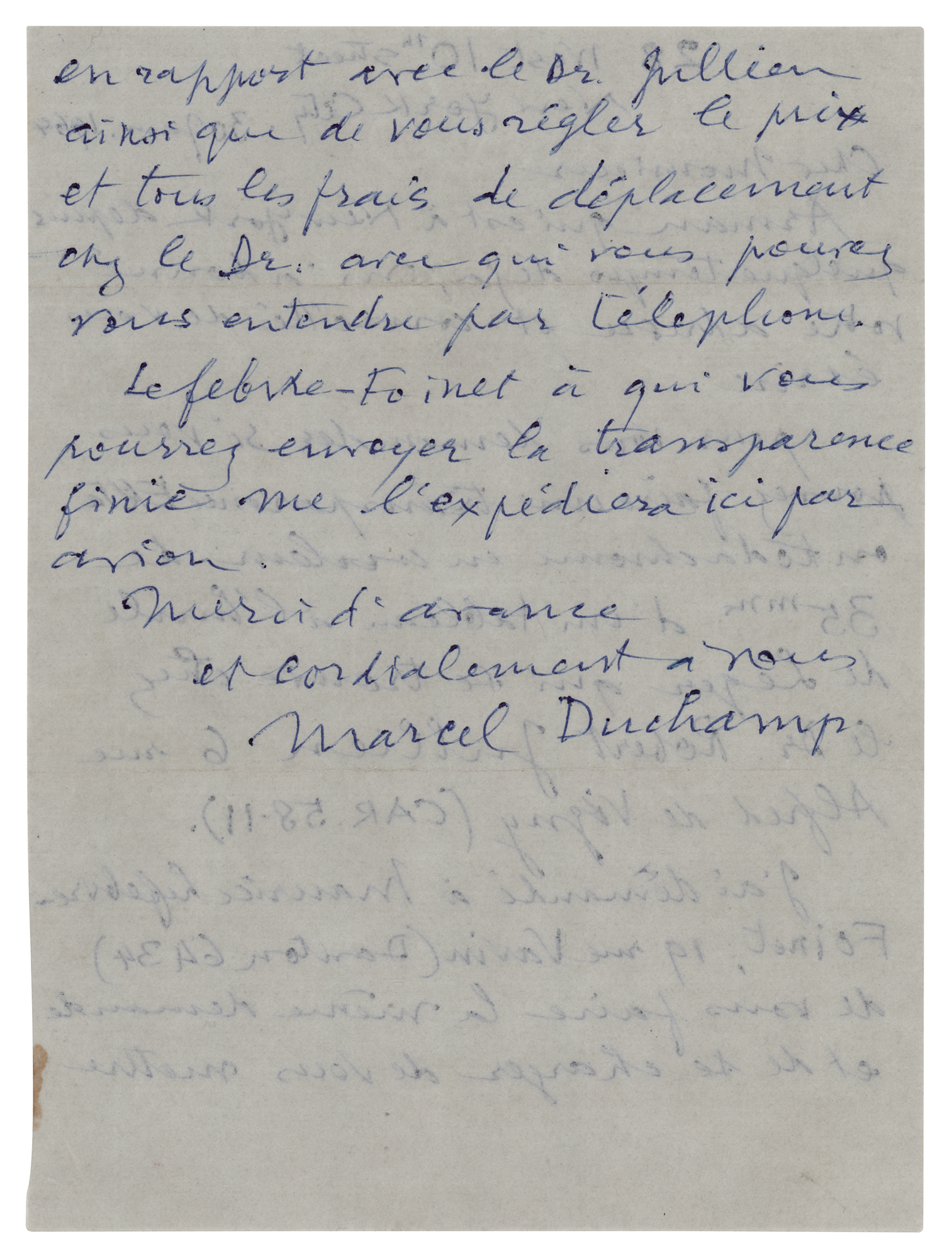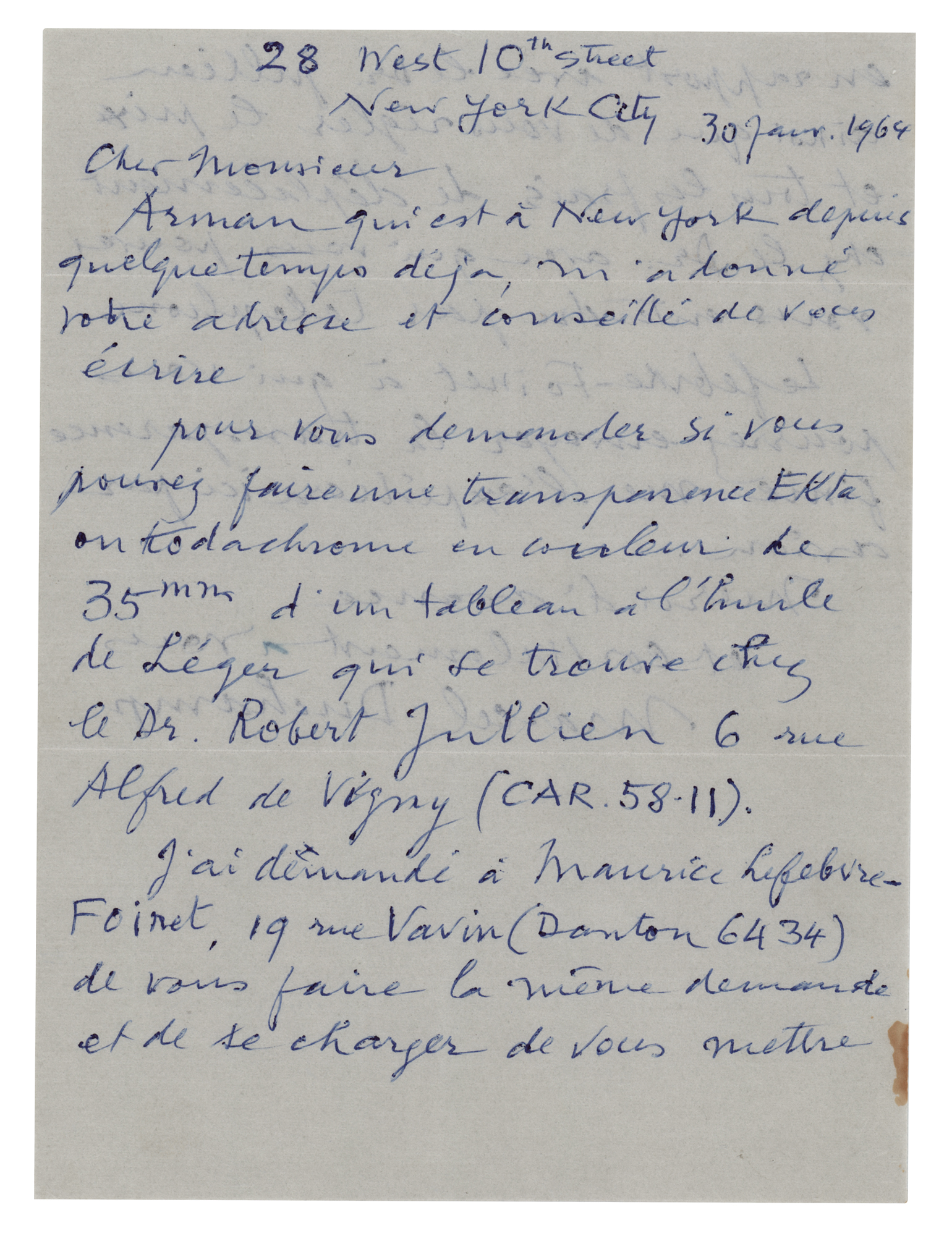 Extremely influential French artist (1887-1968) associated with Dadaism and conceptual art, best remembered for his controversial 'Nude Descending a Staircase, No. 2' painting and his 'Readymade' recontextualized found objects. ALS, one page both sides, 5.75 x 7.75, January 30, 1964. Handwritten letter to George Véron, stating that Arman had provided Véron’s address and suggested that he write to him (translated): "to ask if you can make a 35mm colour Ekta or Kodachrome transparency of an oil painting by Leger which is at Dr. Robert Jullien’s home…I asked Maurice Lefebvre-Foinet…to make the same request to you and to take charge of putting you in contact with Dr. Jullien as well as paying you the price and all travel expenses." He concludes by adding that Lefebvre-Foinet will send the finished transparency to New York via air mail. In fine condition, with a small stain to the lower right edge. Accompanied by the original mailing envelope, addressed in Duchamp's hand and incorporating his surname, "Duchamp," in the return address on the flap (with a tear from opening affecting the end of his name). A significant piece of artistic correspondence, mentioning the important sculptor Arman, the celebrated abstract painter Fernand Leger, and noted collector and art supply dealer Maurice Lefebvre-Foinet.