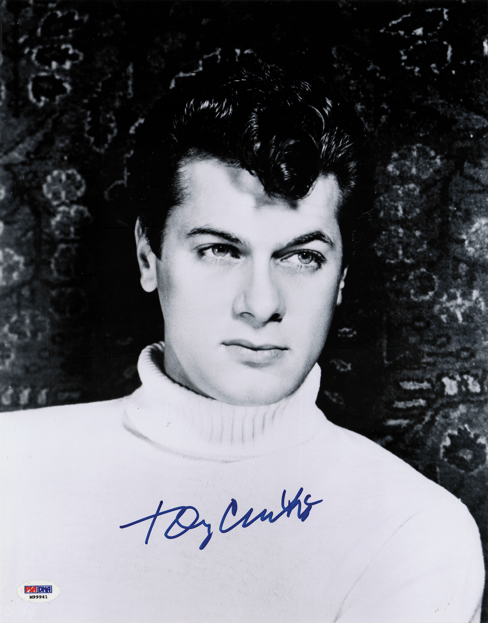 Satin-finish 11 x 14 photo of Tony Curtis in a turtleneck sweater, signed in blue felt tip. In fine condition, with a PSA/DNA label affixed to the lower right corner. Accompanied by a certificate of authenticity from PSA/DNA.