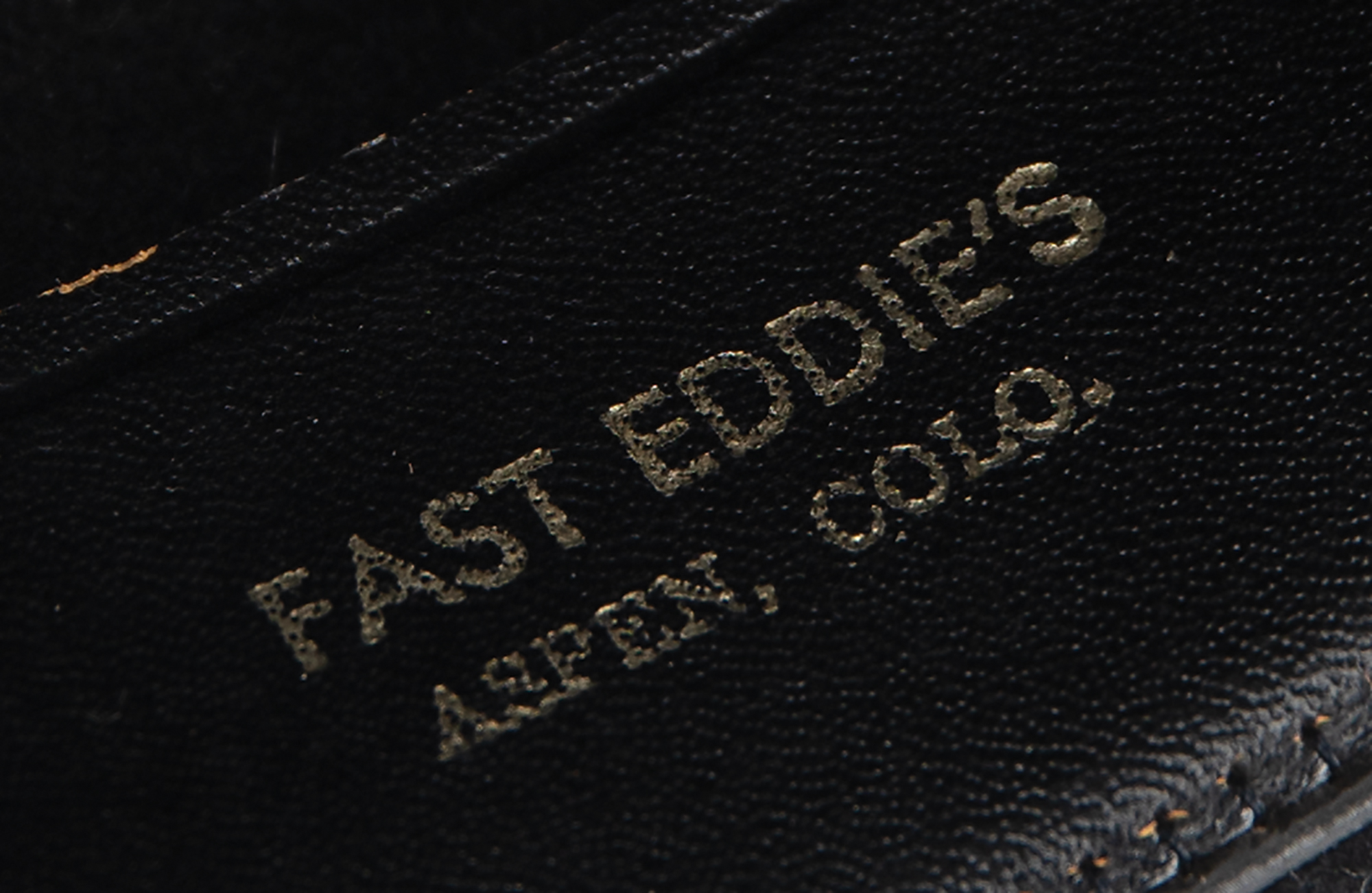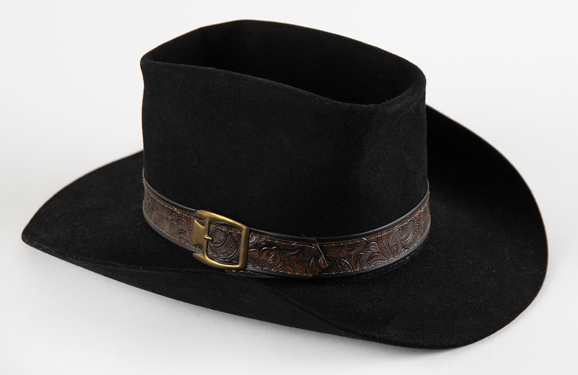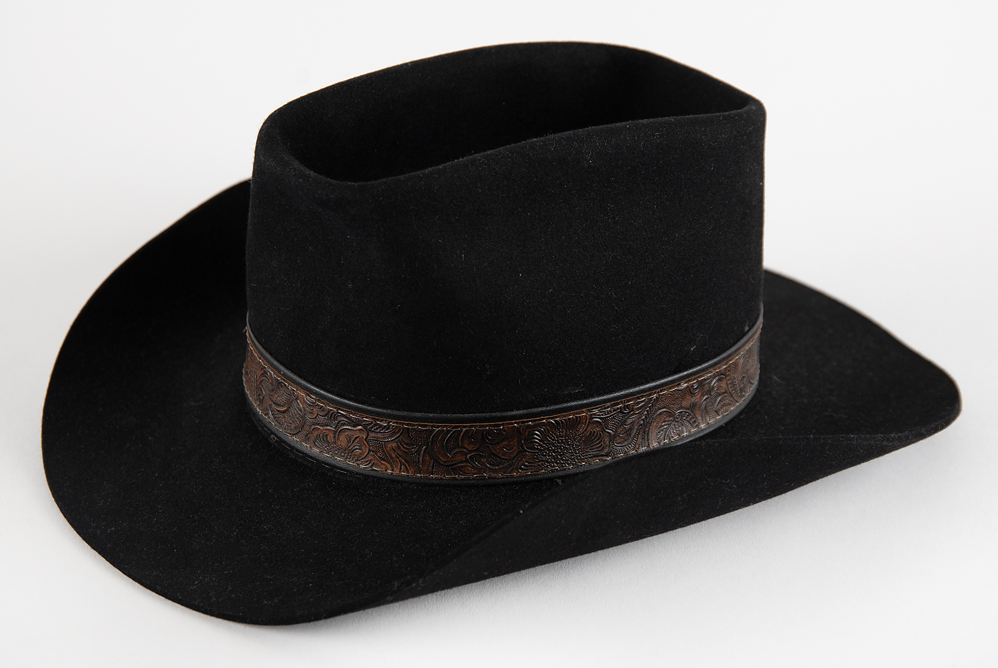 Bob Dylan's personally-owned Stetson black fur felt western hat, size 7, with brown tooled leather decorative band, purchased from Fast Eddie's of Aspen, Colorado, in the mid-1970s. Eddie Golub founded Fast Eddie's in the early 1970s and swiftly became a legendary maker and seller of high-quality wide-brimmed cowboy hats. The hat is gilt-stamped on the inner hatband: "Fast Eddie's / Aspen, Colo." and "Stetson." In fine condition.