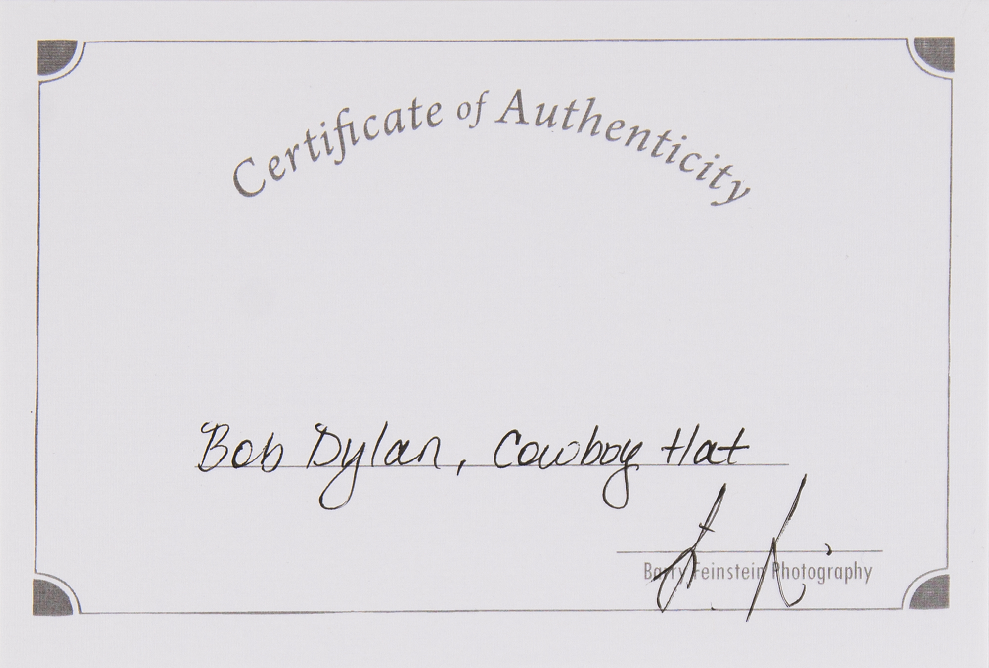 Dylan acquired this hat in the wake of his debut in the Western movie Pat Garrett and Billy the Kid (1973) or while on tour with The Band in 1974. Barry Feinstein was invited by Dylan to serve as the official photographer for the tour, both on stage and behind the scenes, and was, like Dylan, a hat wearer. Dylan gave him this hat during the tour, and Feinstein kept it in his studio until his death in 2011—next to Steve McQueen's cowboy hat and gunbelt with holster from 'Wanted Dead Or Alive' (1958).