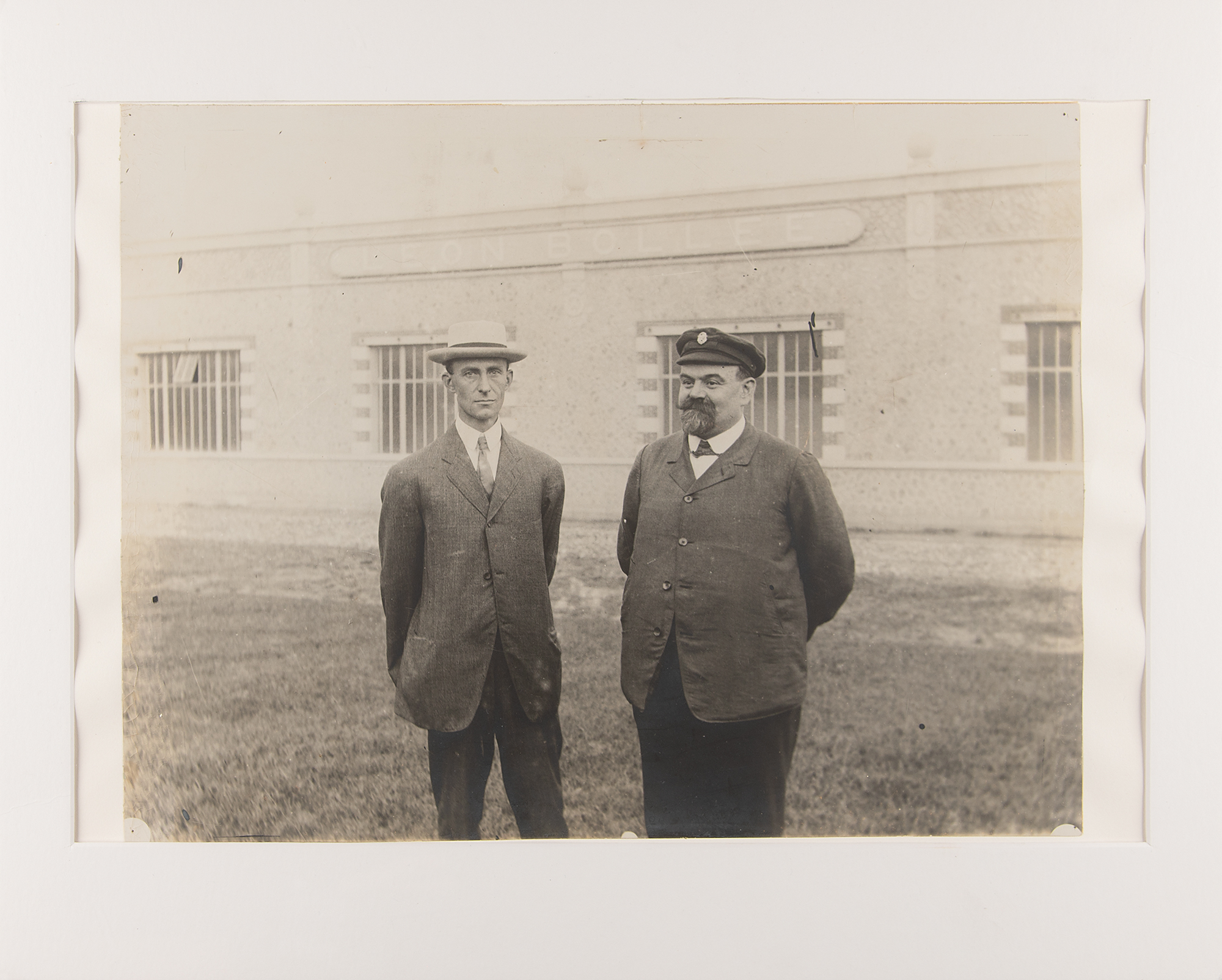 Large and impressive original matte-finish 15.5 x 11.75 silver gelatin photograph of Wilbur Wright and León Bollée standing side-by-side at the site of Bollée's automobile factory at Le Mans, France, in 1908. The photo was professionally removed from its paperboard mount and cleaned by a paper conservator, then remounted to medium-weight archival paper. In fine condition, with slight rippling to edges.