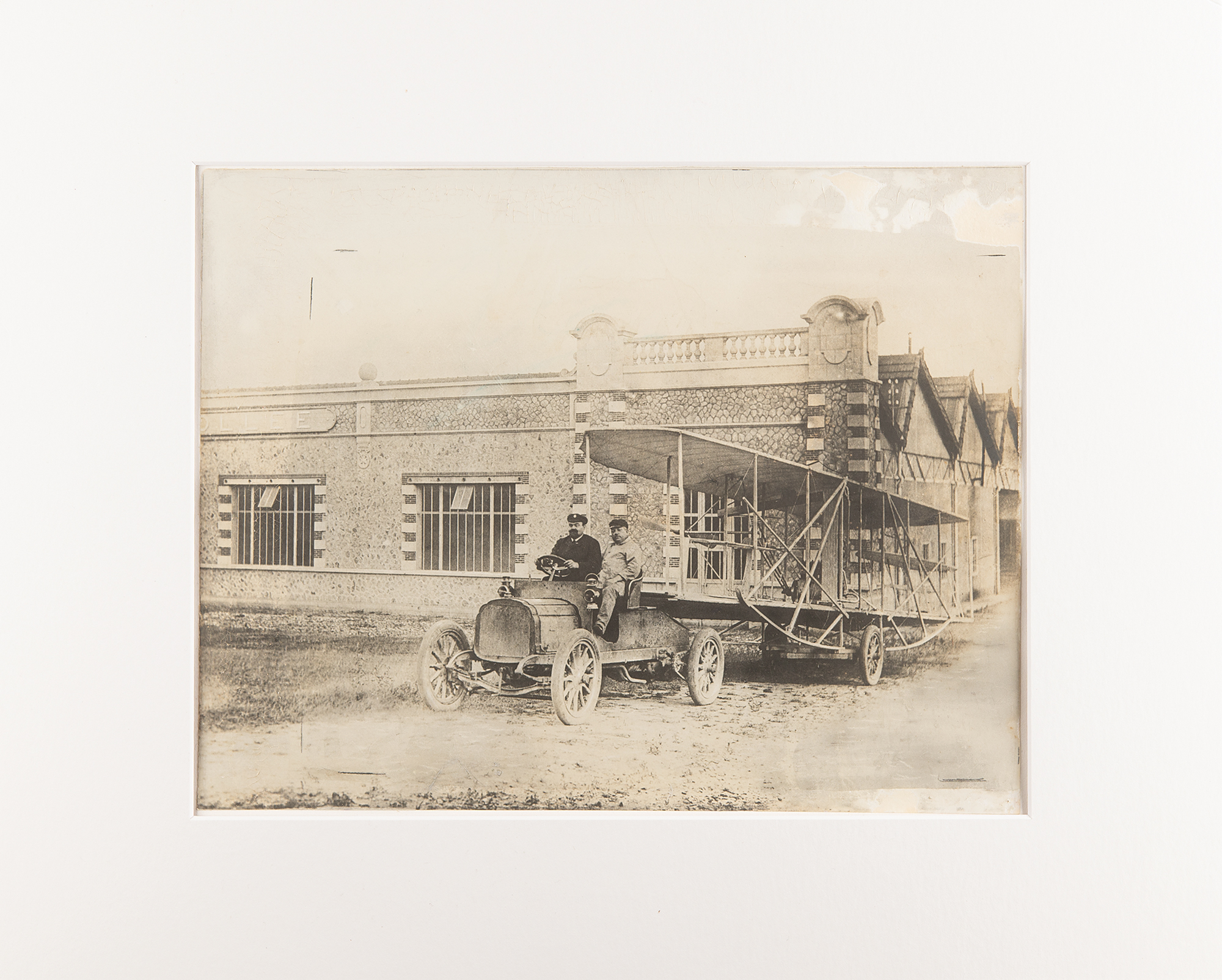 Large original matte-finish 13.5 x 10.5 silver gelatin photograph of León Bollée and a companion in an open automobile enroute from Bollée's automobile factory, transporting the Wright Flyer at Le Mans, France, in 1908. The photo was professionally removed from its paperboard mount and cleaned by a paper conservator, then remounted to medium-weight archival paper and matted to an overall size of 20 x 16; a paperboard label with caption ("Départ de l'Aréoplane Wright des Usines Léon Bollée pour les Hunaudières - Aout 1908") that was attached to the mount was retained and professionally cleaned. In fine condition, with slight rippling to edges.