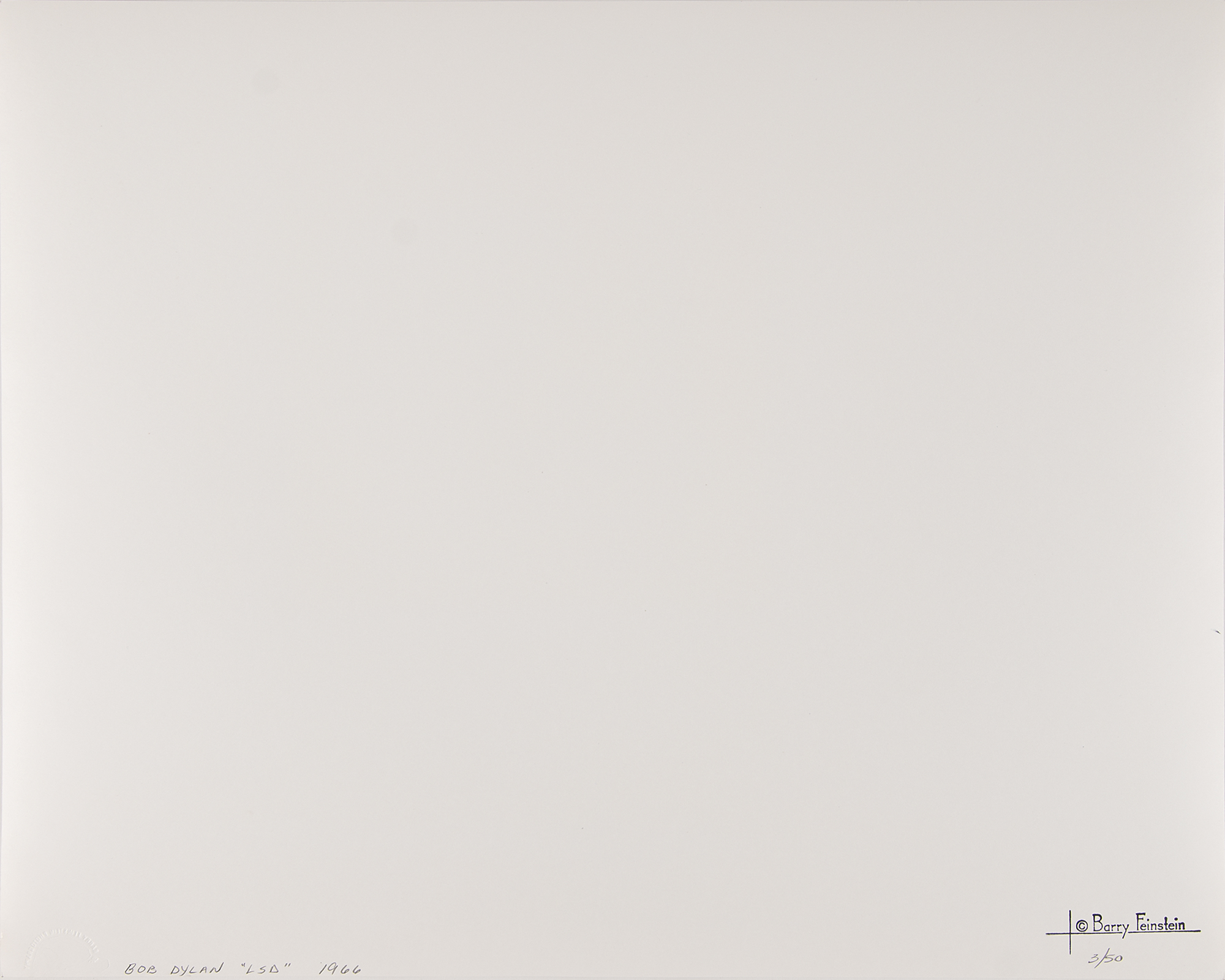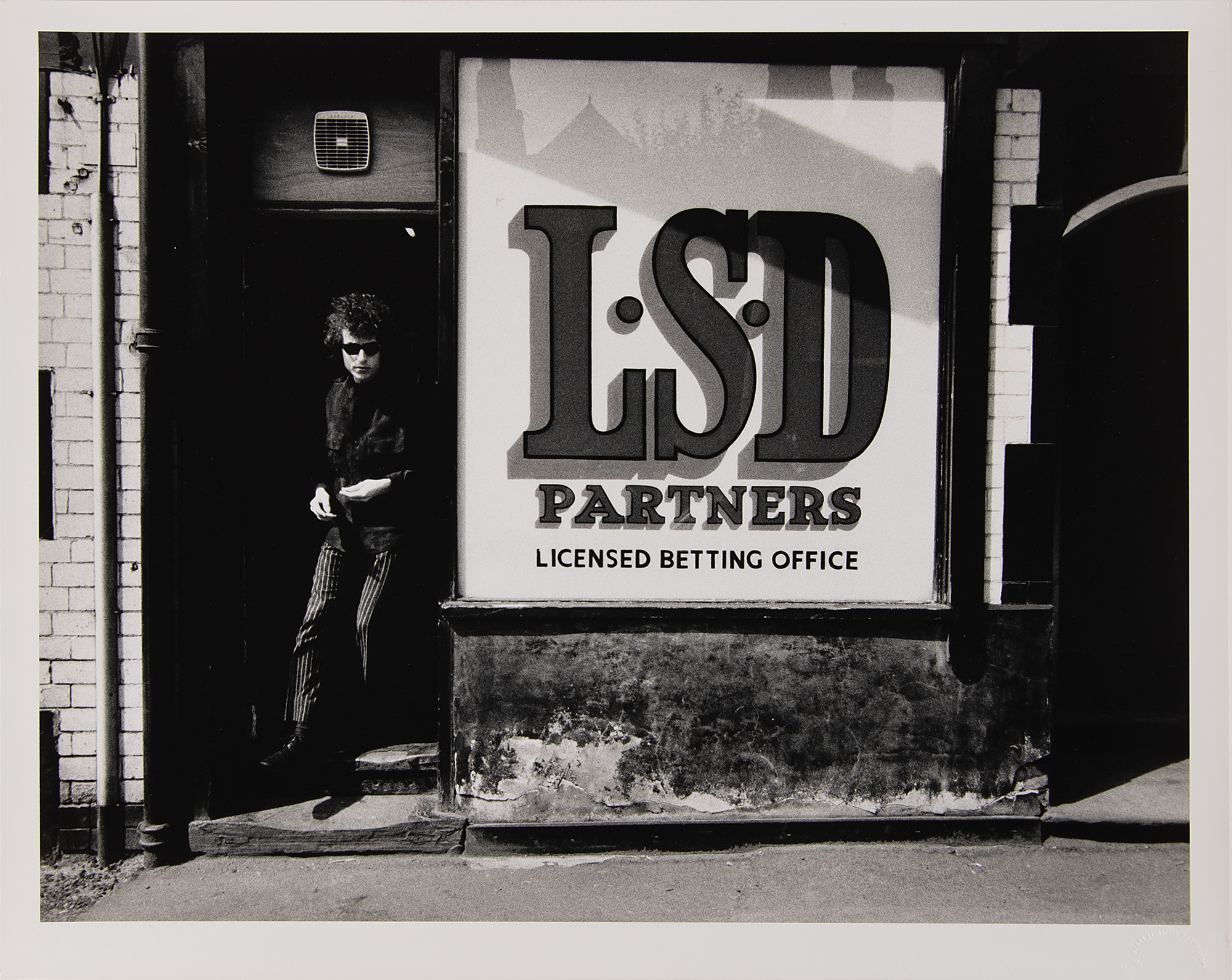 From the personal collection of legendary rock photographer Barry Feinstein—a famous original semi-glossy 20 x 16 silver gelatin photograph of Bob Dylan standing in the doorway of the "L-S-D Partners Betting Office" in Nottingham, England. Blindstamped in the lower right with the "Barry Feinstein Photography" stamp, and titled and numbered on the reverse in pencil, "Bob Dylan 'LSD' 1966, 3/50," beneath Feinstein's copyright stamp. In fine condition.