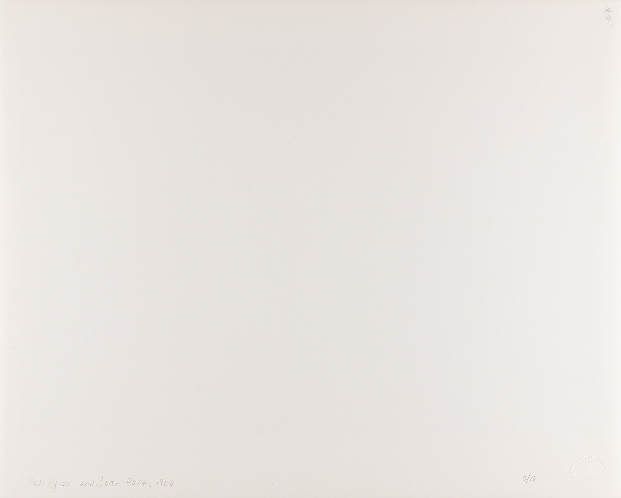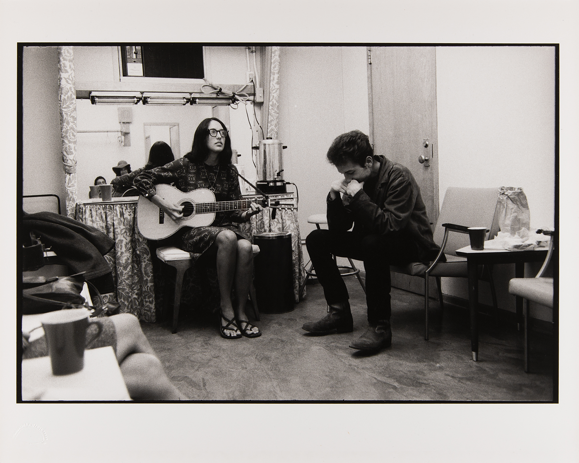 From the personal collection of legendary rock photographer Barry Feinstein—a spectacular semi-glossy 20 x 16 silver gelatin photograph of Bob Dylan sitting with Joan Baez in her dressing room, listening intently as she picks her acoustic guitar. Blindstamped in the lower left with the "Barry Feinstein Photography" stamp, and titled and numbered on the reverse in pencil, "Bob Dylan and Joan Baez, 1966, 5/18." In fine condition.