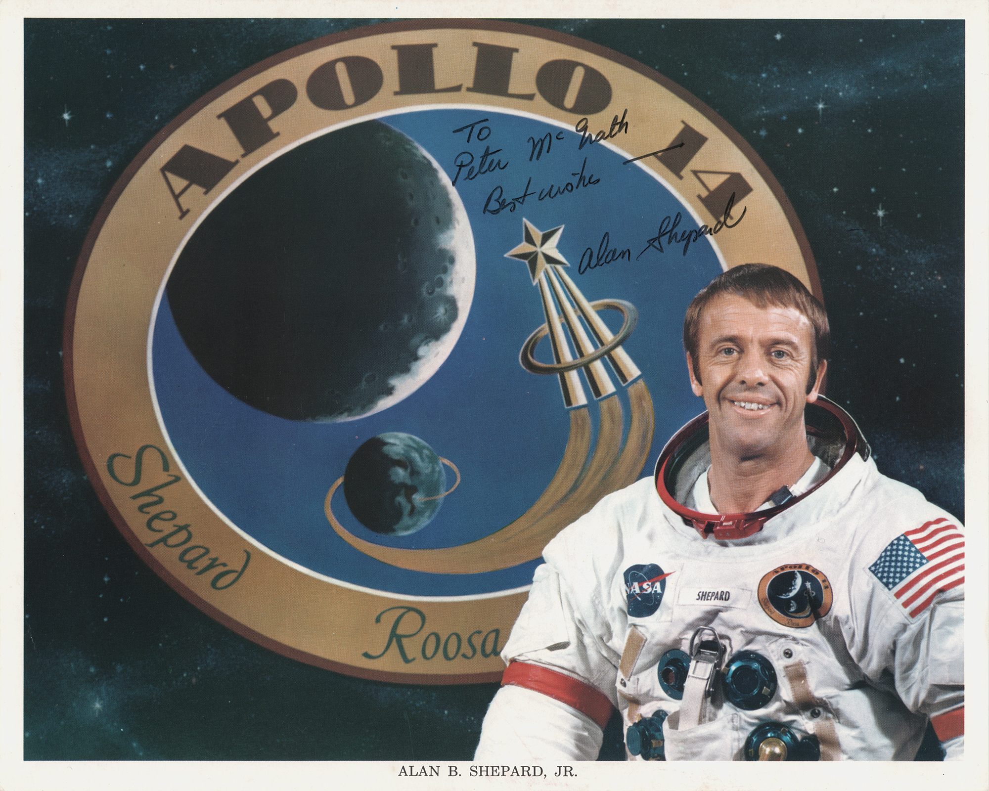 Official color 10 x 8 NASA lithograph of Alan Shepard posing in his white space suit against a space backdrop with a large Apollo 14 mission insignia, signed and inscribed in black felt tip, “To Peter McGrath, Best wishes – Alan Shepard.” In very good to fine condition, with a few small surface creases.