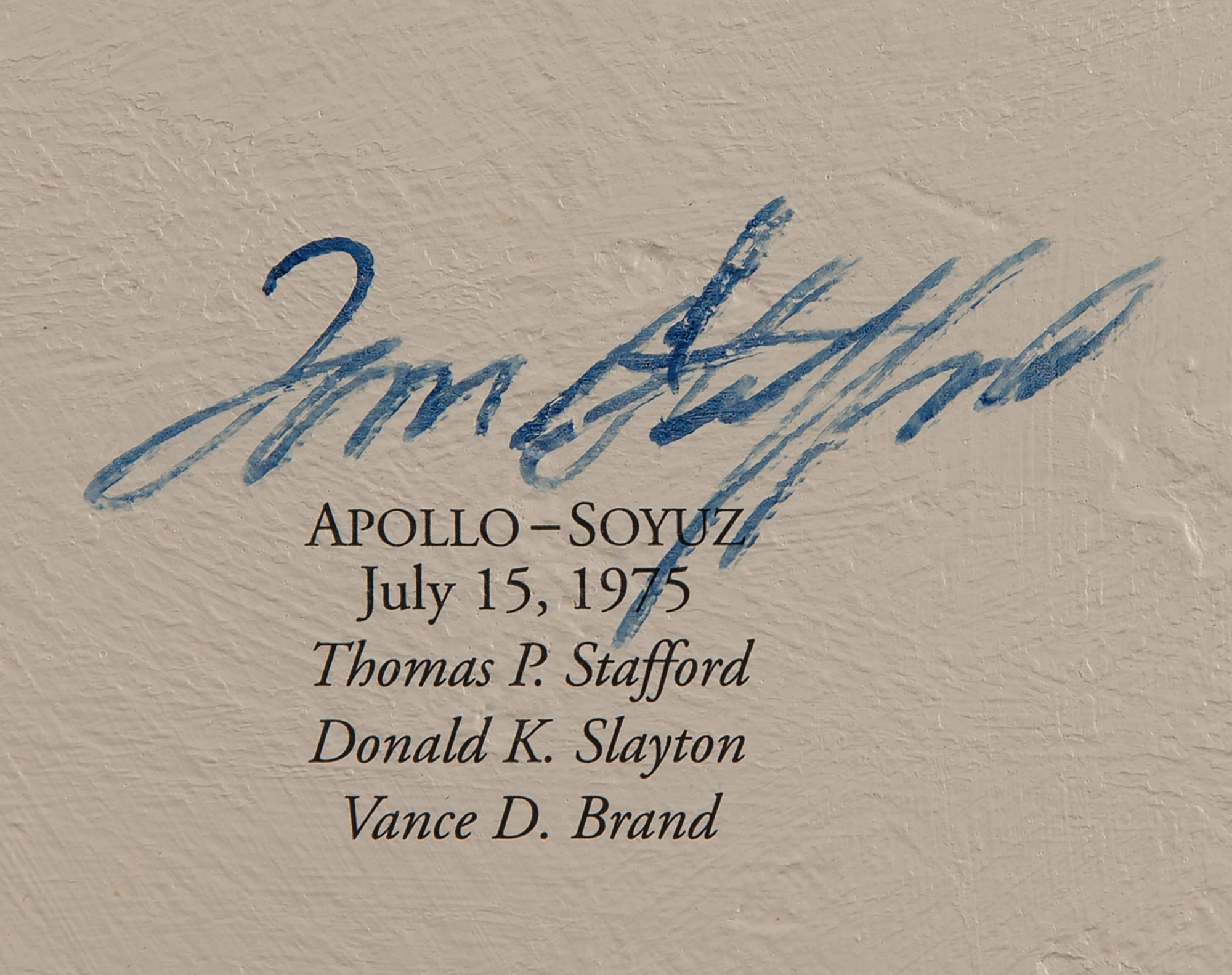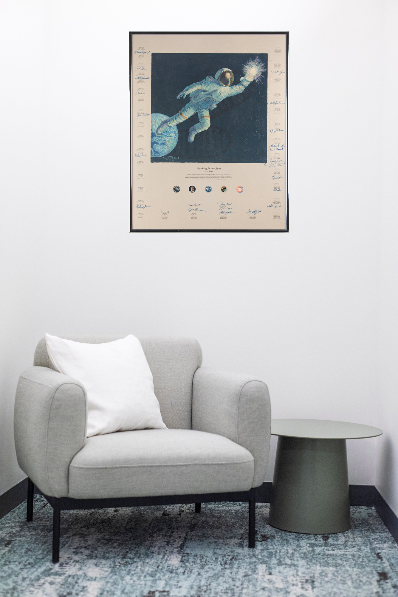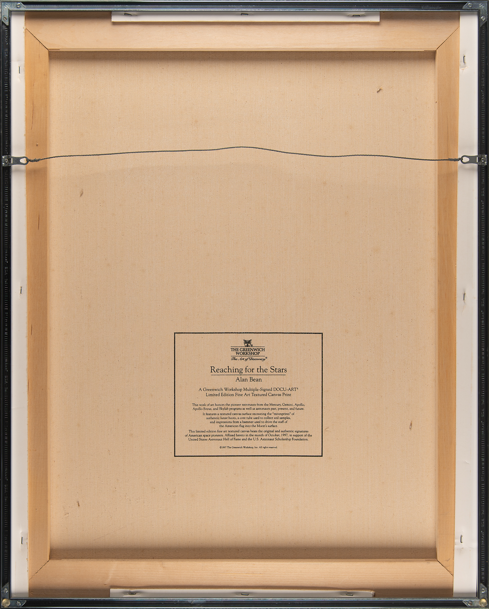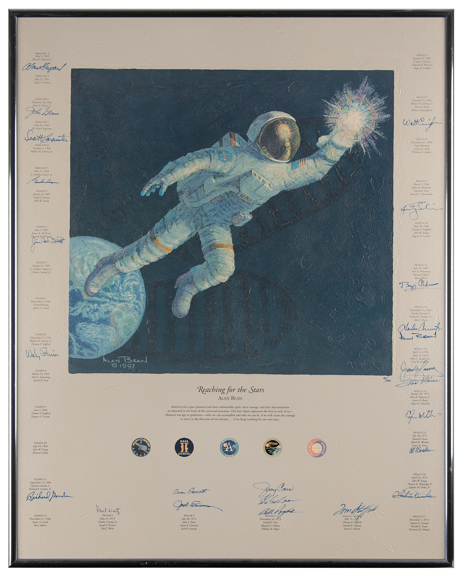 Marvelous limited edition color 26.5 x 33.25 textured canvas print of a 1997 painting by Alan Bean entitled ‘Reaching for the Stars,’ numbered 82/1500, stretched over a wooden frame, depicting an astronaut soaring away from Earth and grasping a star. Signed along the borders in ink and felt tip by 24 astronauts from the Mercury, Gemini, Apollo, and Skylab programs, including: Alan Shepard, John Glenn, Scott Carpenter, Gordon Cooper, Jim McDivitt, Wally Schirra, Richard Gordon, Paul Weitz, Owen Garriott, Jack Lousma, Jerry Carr, Ed Gibson, Bill Pogue, Tom Stafford, Walt Cunningham, Rusty Schweickart, Buzz Aldrin, Charles Conrad, Alan Bean, James Lovell, Fred Haise, Edgar Mitchell, Al Worden, and Charlie Duke. Framed without glass to a slightly larger size and in fine condition. Accompanied by an information packet from Novagraphics related to the release and sale of 'Reaching for the Stars,' which includes an Astronaut Scholarship Foundation sheet from Shepard, which bears his preprinted signature.
