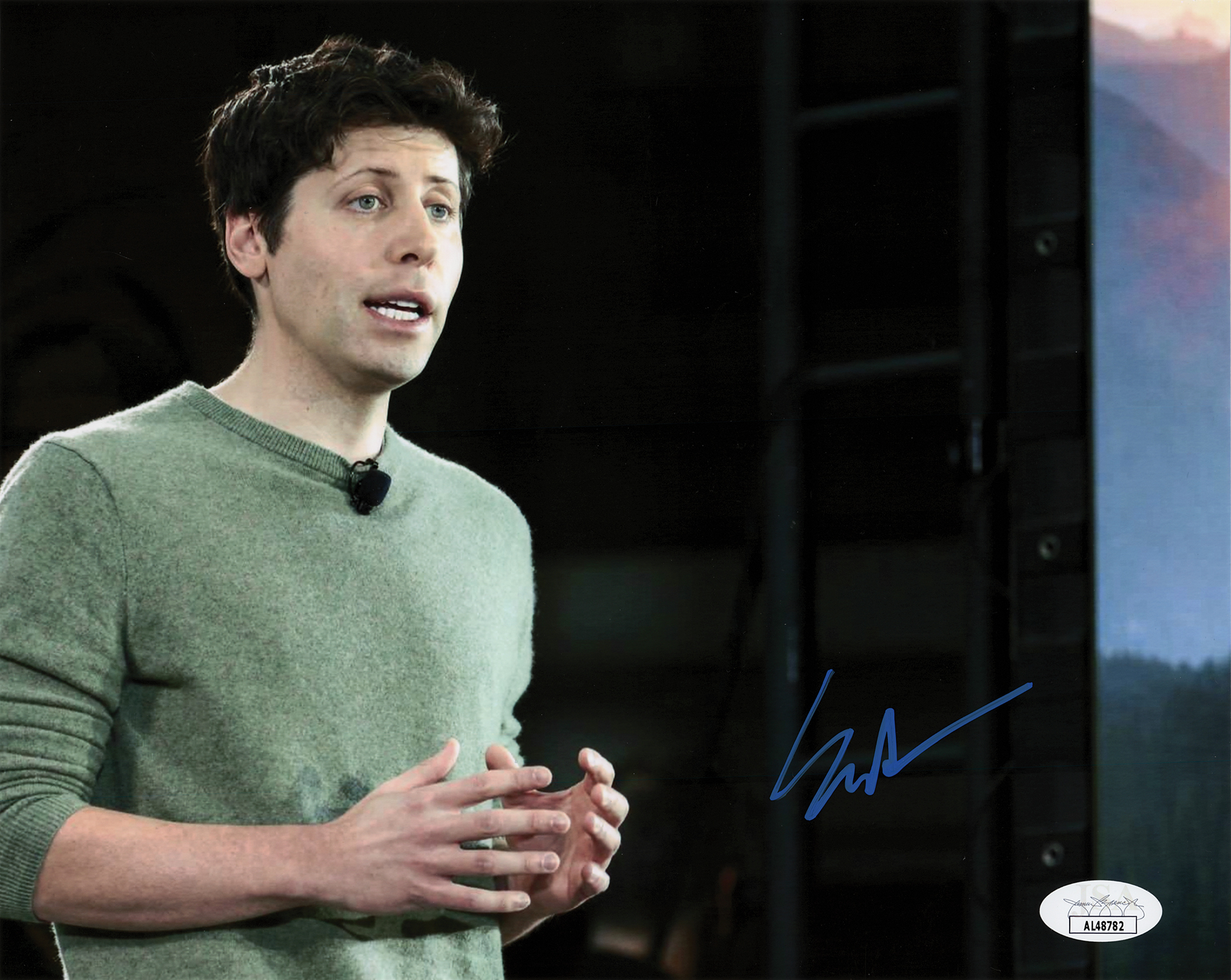 Color glossy 10 x 8 photo of OpenAI co-founder and CEO Sam Altman giving a talk, signed in blue paint pen. In very fine condition, with a JSA label affixed to the lower corner. Accompanied by a certificate of authenticity from JSA.