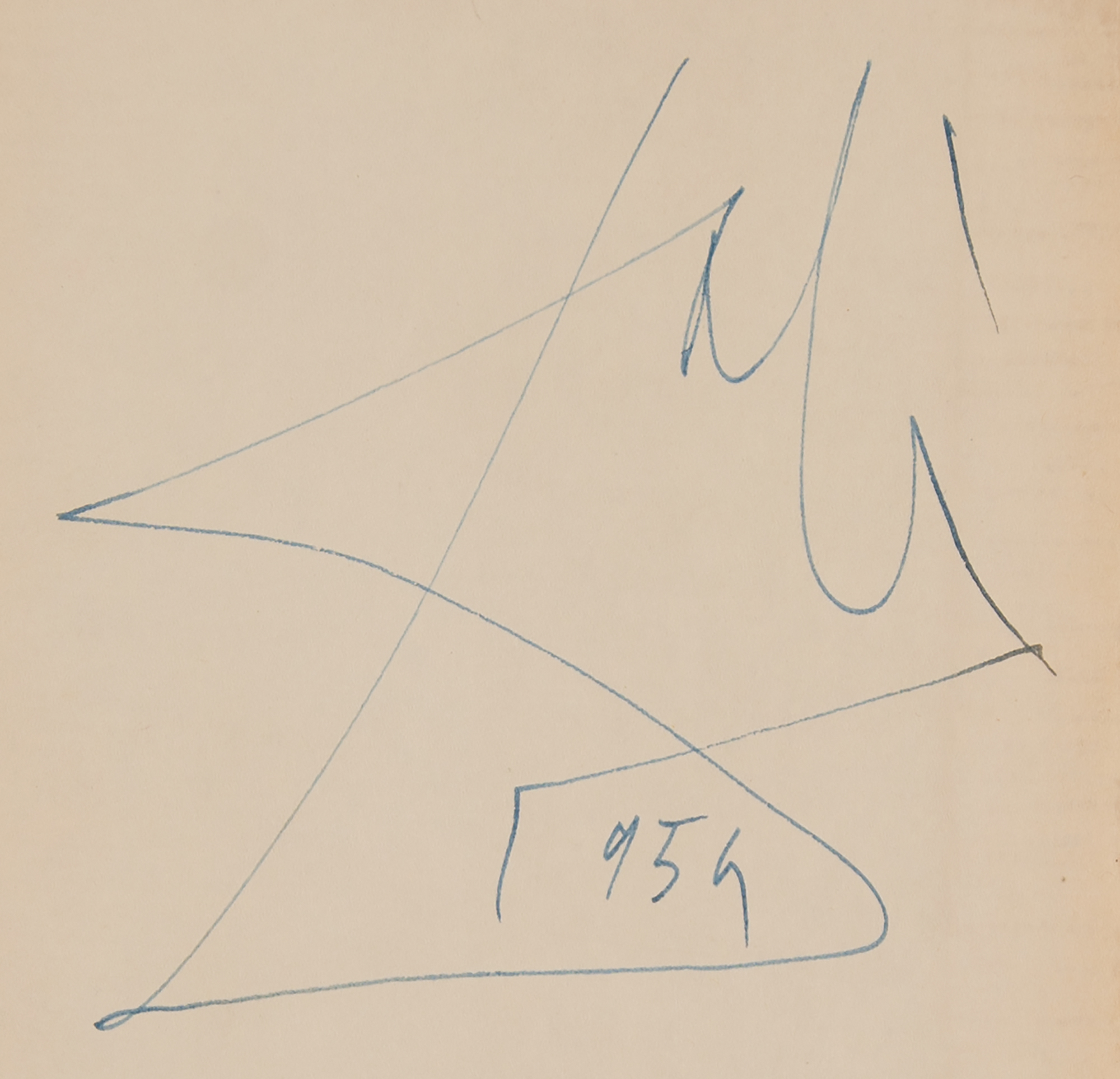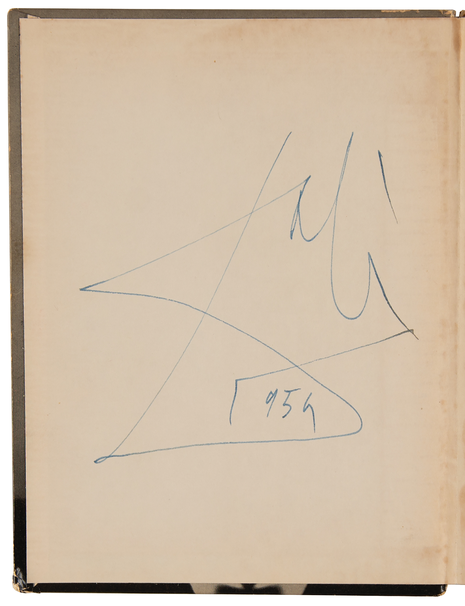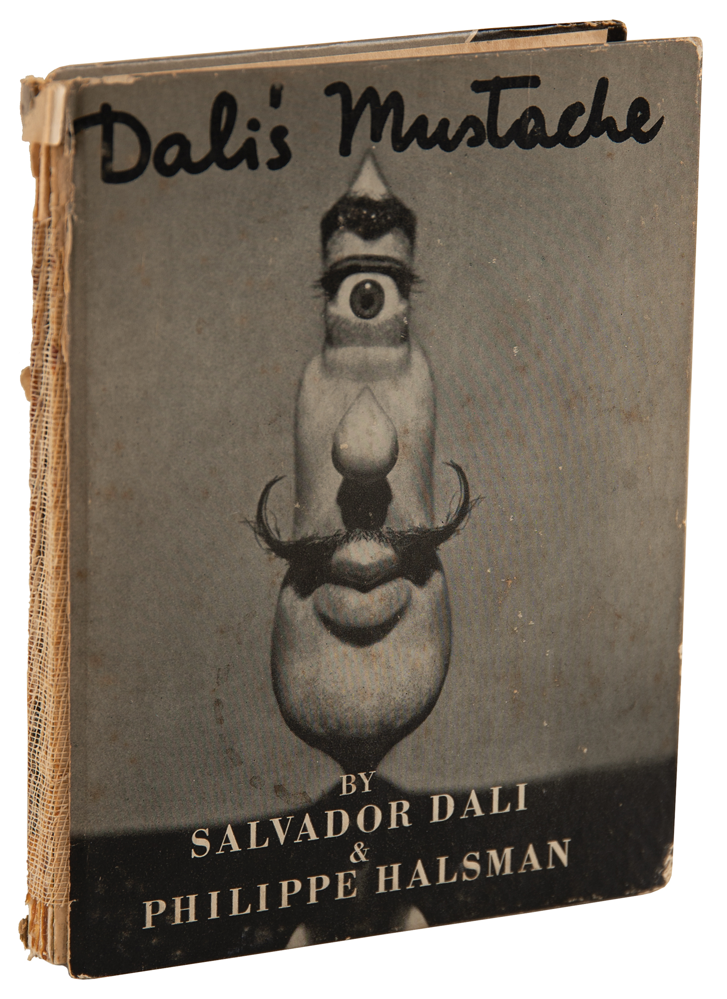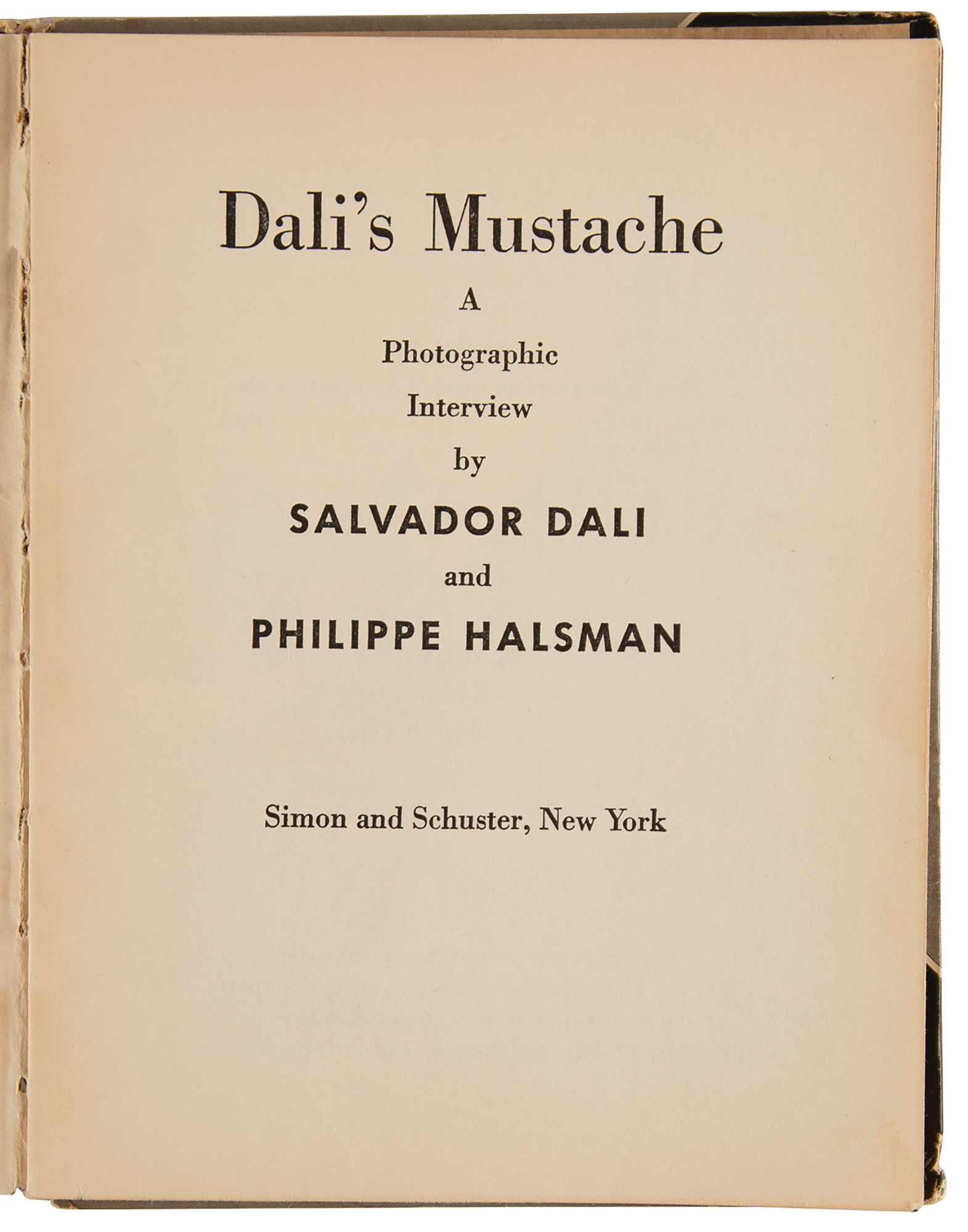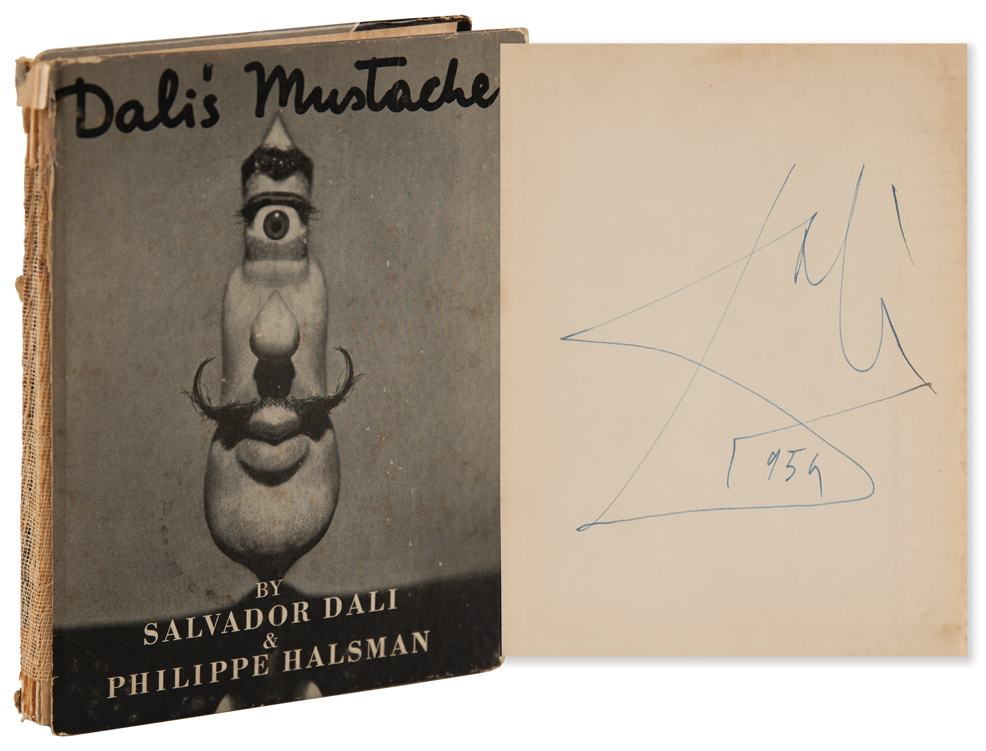 Signed book: Dali's Mustache. First edition. NY: Simon and Schuster, 1954. Hardcover, 5.25 x 7, 126 pages. Prominently signed and inscribed on the front pastedown in fountain pen, "Dali, 1959." Autographic condition: fine. Book condition: G-/None, with paper loss to the entirety of the spine, worn corners, and rubbing and light foxing to boards. A large and desirable autograph by the famed surrealist, prominently penned inside a humorous collaboration between Dali and famed photographer Philippe Halsman.
