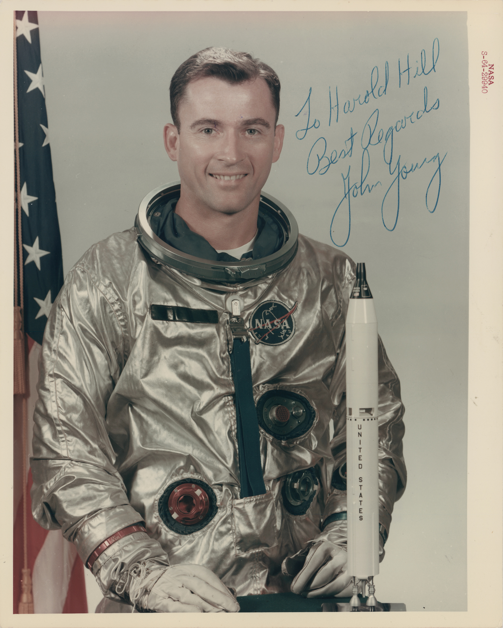 Sought-after official color glossy 8 x 10 red-numbered NASA photo (S-64-29940) of Gemini 3 Pilot John Young in his silver space suit, nicely signed and inscribed in blue ballpoint, "To Harold Hill, Best Regards, John Young.” Reverse bears purple NASA caption text and “A Kodak Paper” watermarks. In fine condition.