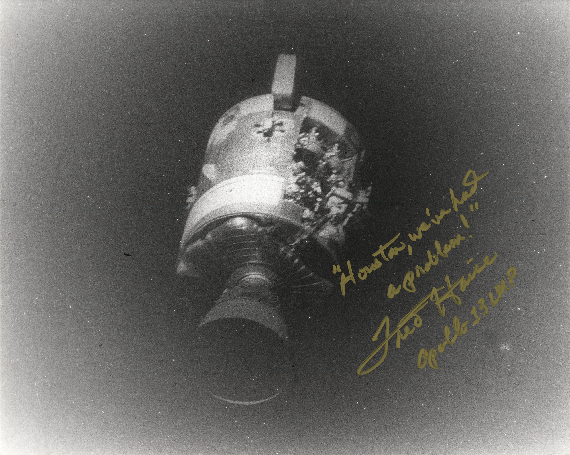 Official glossy 10 x 8 NASA photo of of the damaged Apollo 13 service module floating in space, signed in gold ink, "'Houston, we've had a problem!' Fred Haise, Apollo 13 LMP." Reverse bears black NASA caption text and "Kodak Professional" watermarks. In fine condition.