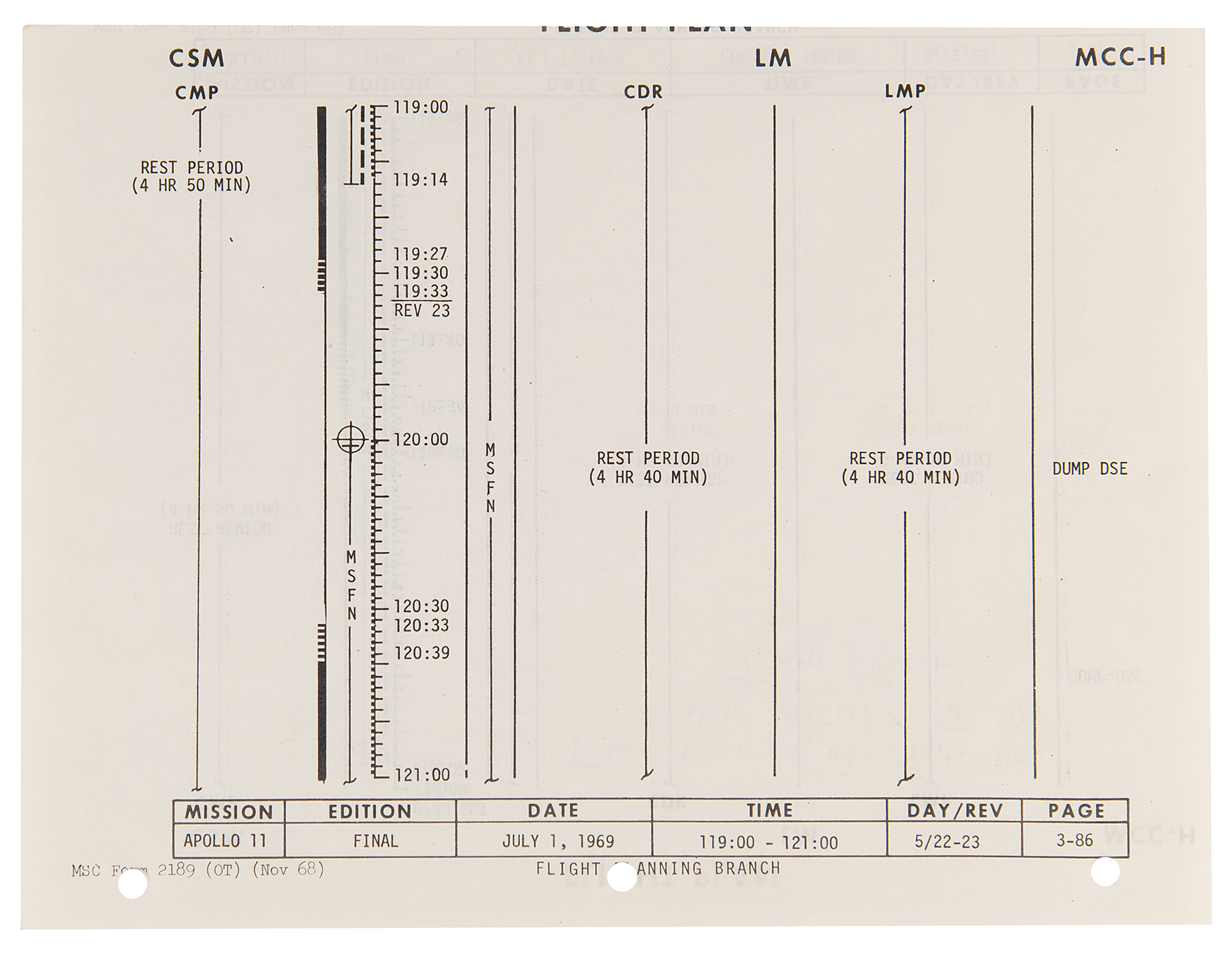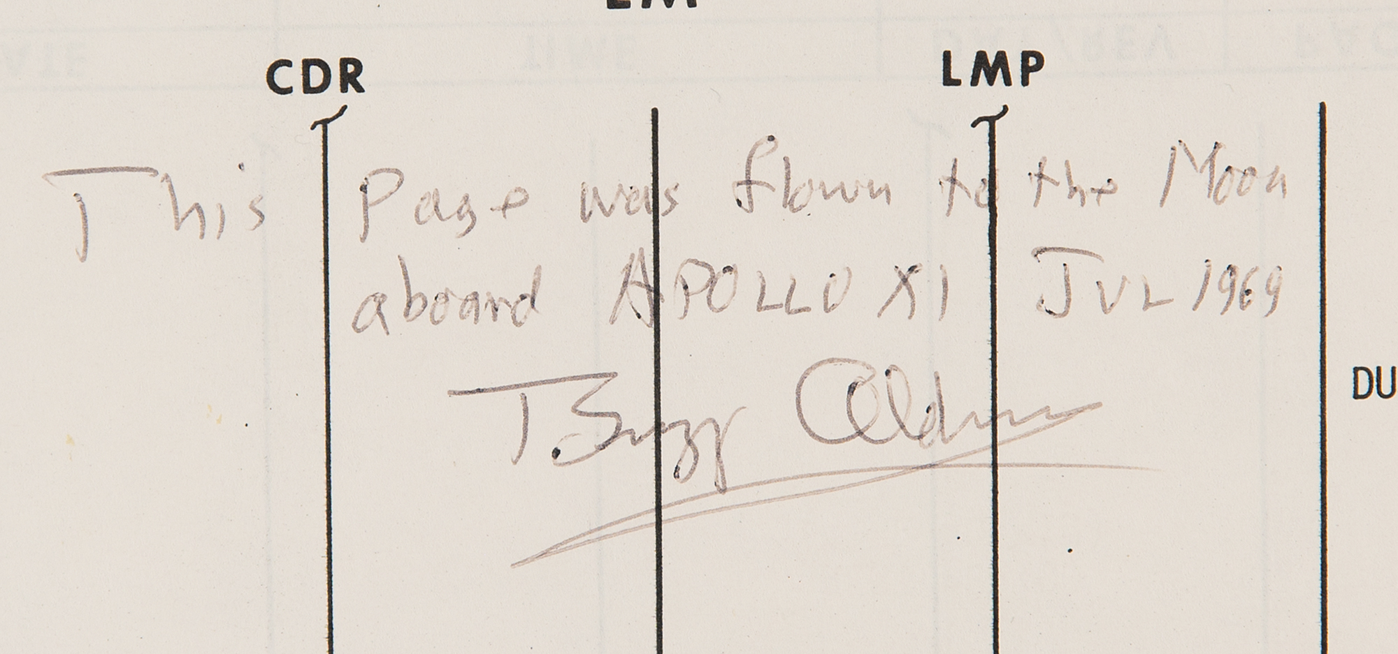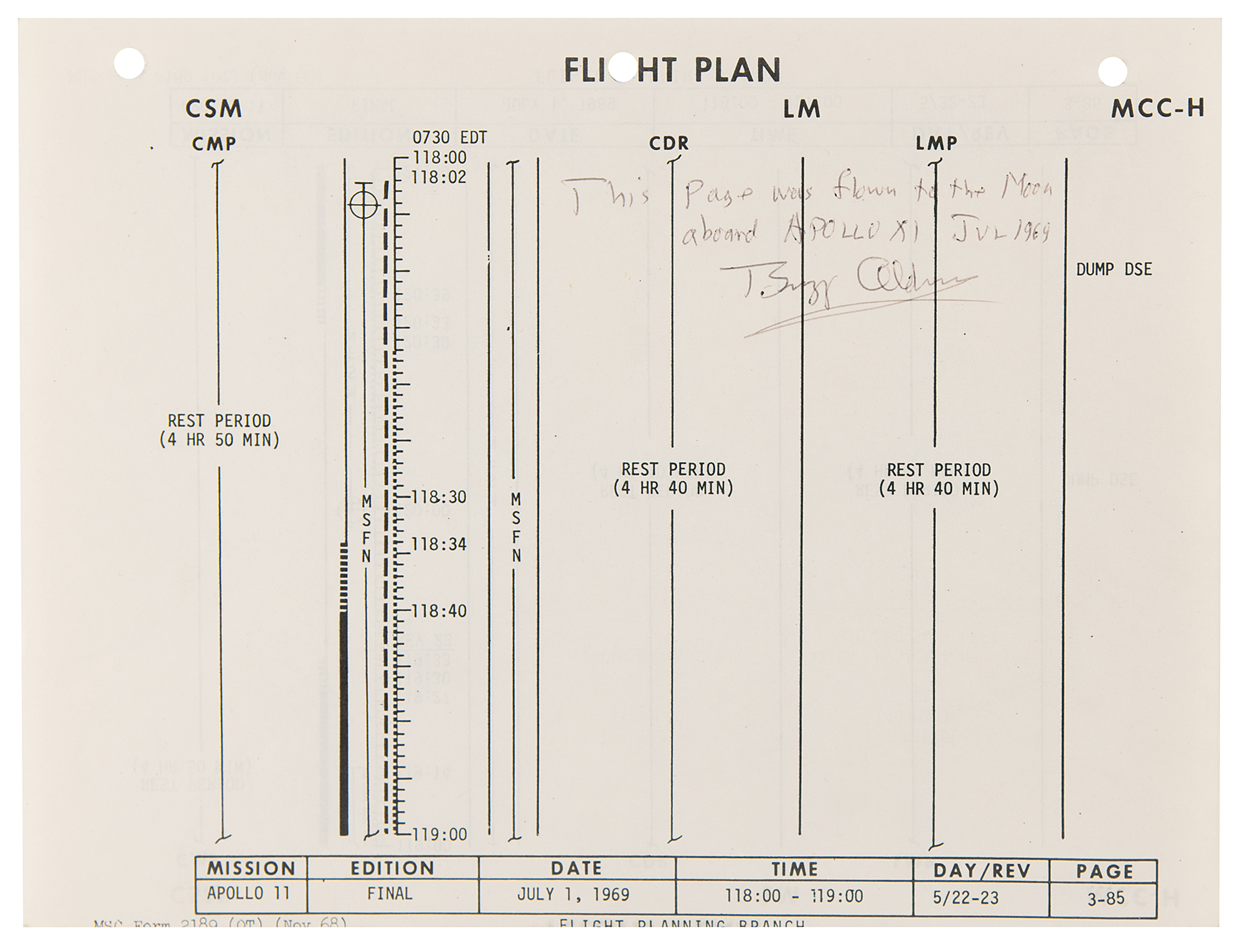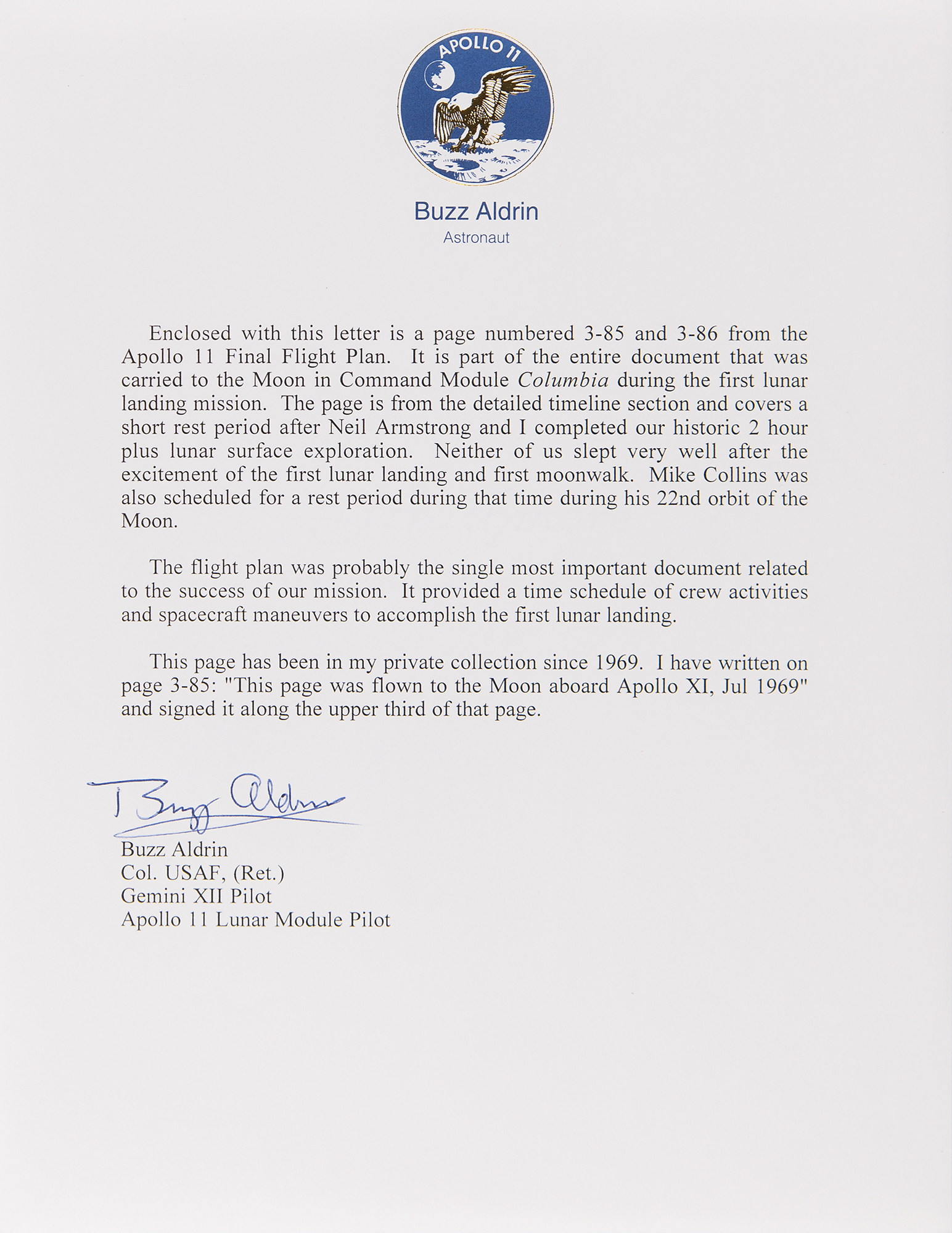 Accompanied by a detailed letter of provenance signed by Buzz Aldrin, in full: "Enclosed with this letter is a page numbered 3-85 and 3-86 from the Apollo 11 Final Flight Plan. It is part of the entire document that was carried to the Moon in Command Module Columbia during the first lunar landing mission. The page is from the detailed timeline section and covers a short rest period after Neil Armstrong and I completed our historic 2 hour plus lunar surface exploration. Neither of us slept very well after the excitement of the first lunar landing and first moonwalk. Mike Collins was also scheduled for a rest period during that time during his 22nd orbit of the Moon.