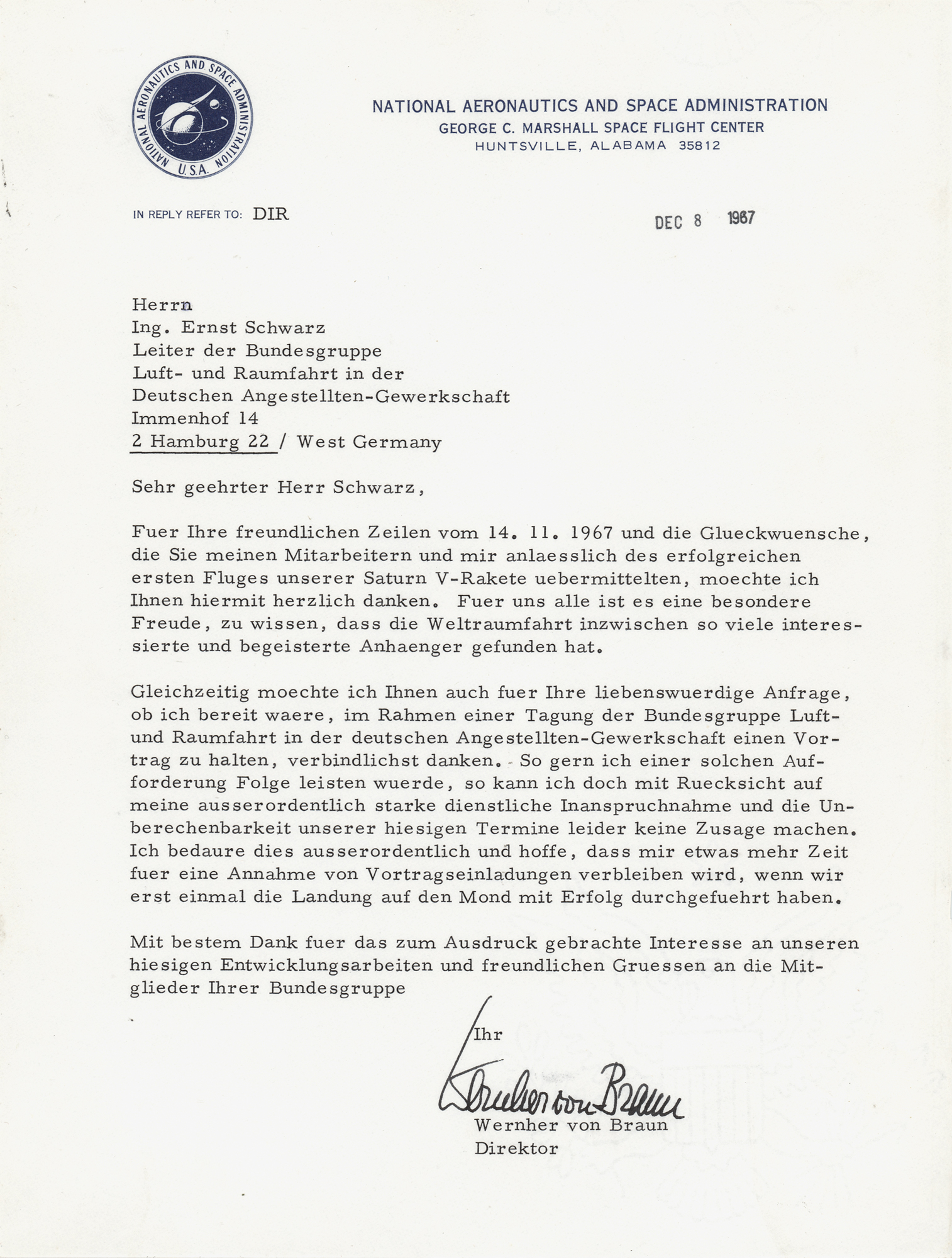 TLS in German, one page, 8 x 10.5, NASA George C. Marshall Space Flight Center letterhead, December 8, 1967. Letter to engineer Ernst Schwarz, head of the Federal Aerospace Group in the German Employees' Trade Union. In part (translated): "I would like to thank you most sincerely for your kind note of November 14, 1967, and for the congratulations you sent to my staff and me on the occasion of the successful first flight of our Saturn V rocket. It is a special pleasure for all of us to know that space travel now has so many interested and enthusiastic supporters. At the same time, I would also like to thank you most sincerely for your kind request as to whether I would be prepared to give a lecture at a meeting of the Federal Aerospace Group in the German Employees' Trade Union. As much as I would like to respond to such an invitation, I am unfortunately unable to make a commitment in view of my extraordinarily heavy workload and the unpredictability of our schedule here. I regret this extraordinarily and hope that I will have more time for accepting invitations to lecture once we have successfully carried out the landing on the moon." In fine condition.