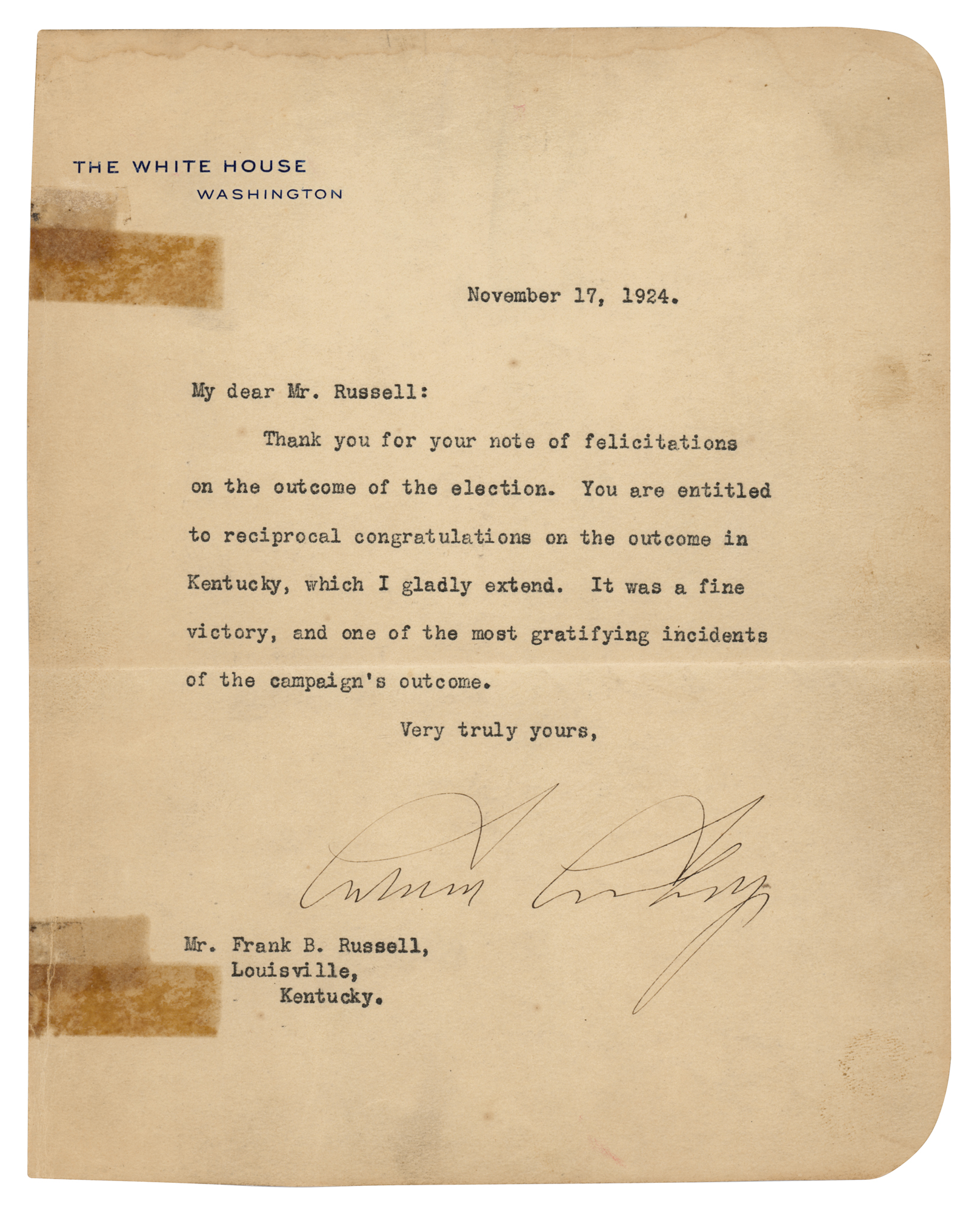 TLS as president, one page, 6.5 x 8, White House letterhead, November 17, 1924. Letter to Frank B. Russell, in full: "Thank you for your note of felicitations on the outcome of the election. You are entitled to reciprocal congratulations on the outcome in Kentucky, which I gladly extend. It was a fine victory, and one of the most gratifying incidents of the campaign's outcome." In very good condition, with trimmed edges, light soiling and edge staining, and several old tape stains to the left edge.