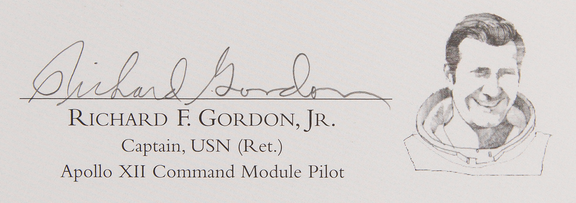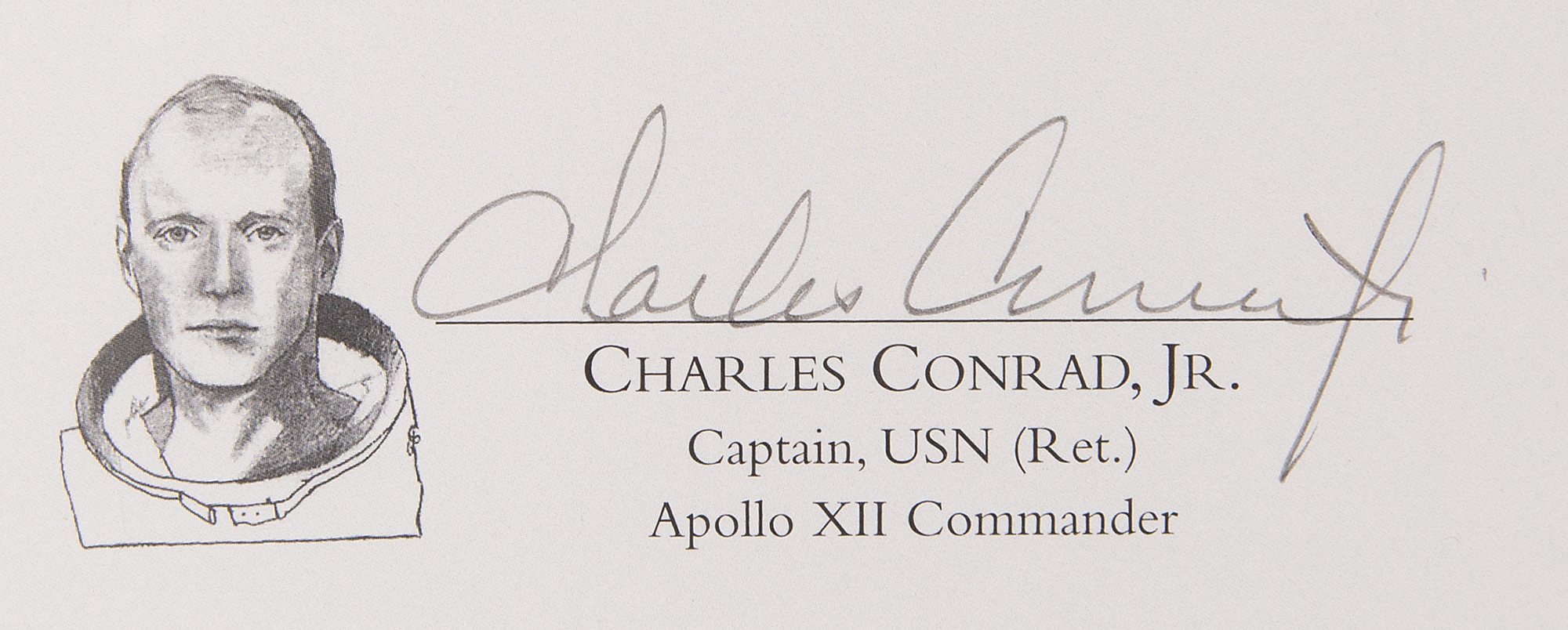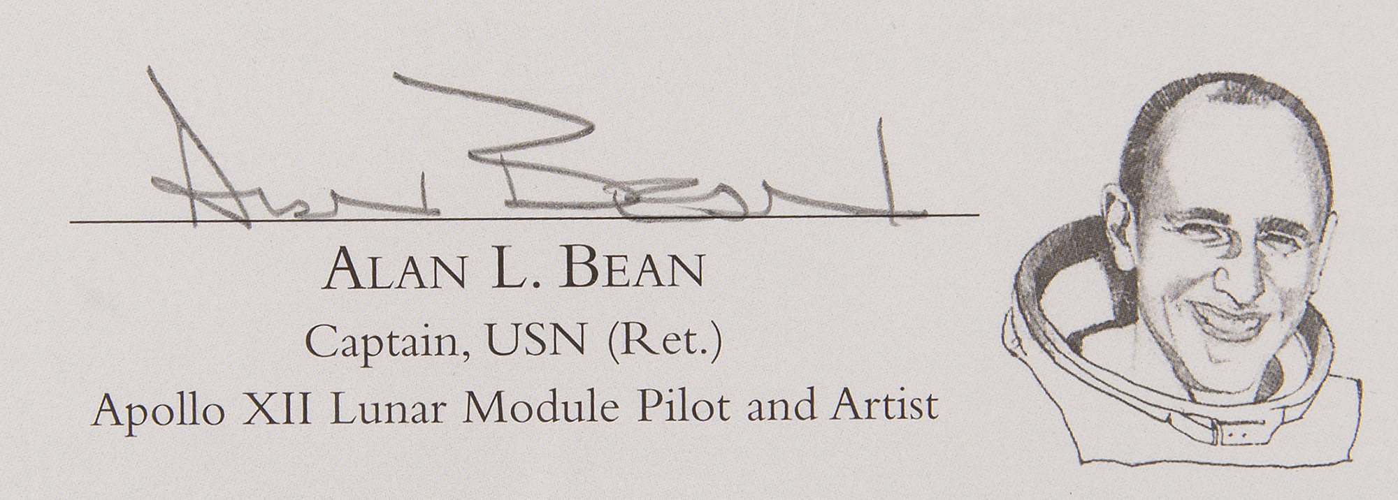 Limited edition color 27 x 21.5 lithograph of an Alan Bean painting entitled 'Kissing the Earth,' numbered 472/650, picturing a majestic ‘Earthrise’ over the lunar surface, signed in the lower border in pencil by Alan Bean, Charles Conrad, and Richard Gordon. Rolled and in fine condition.