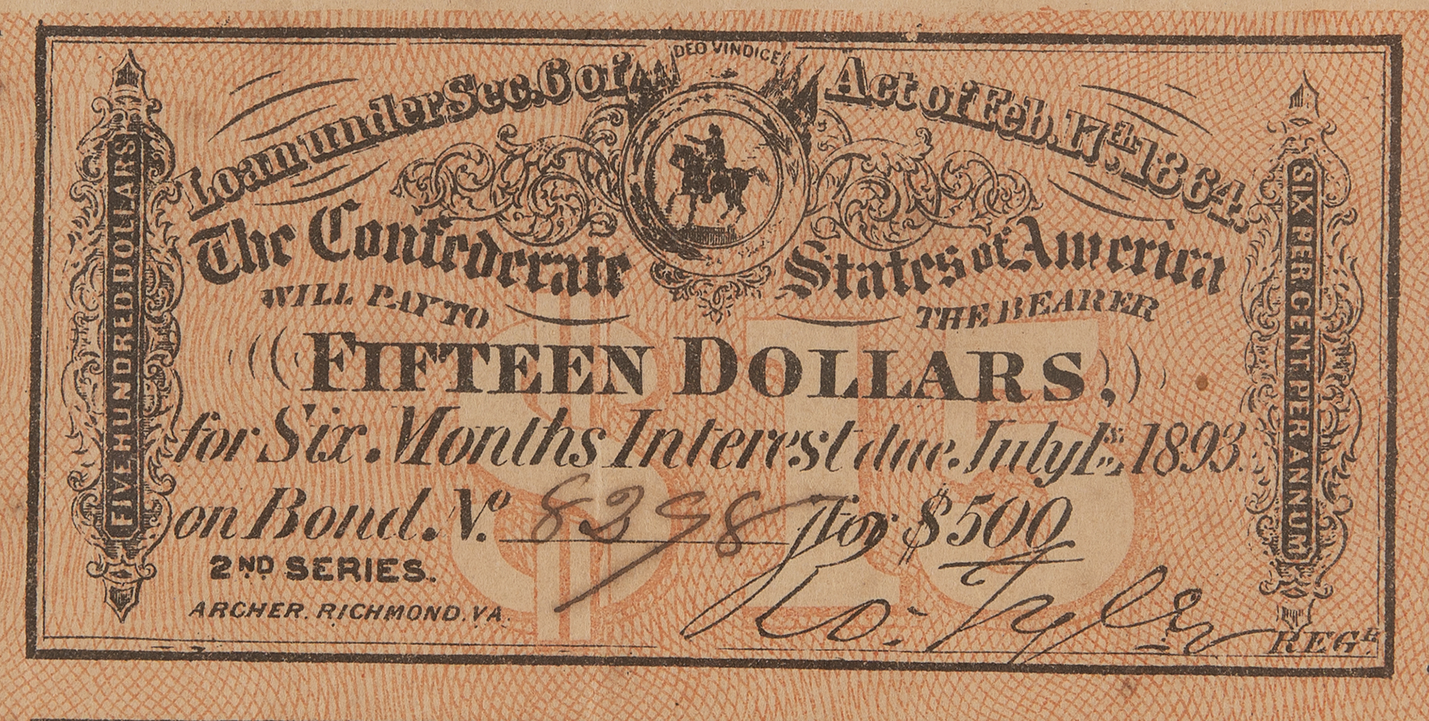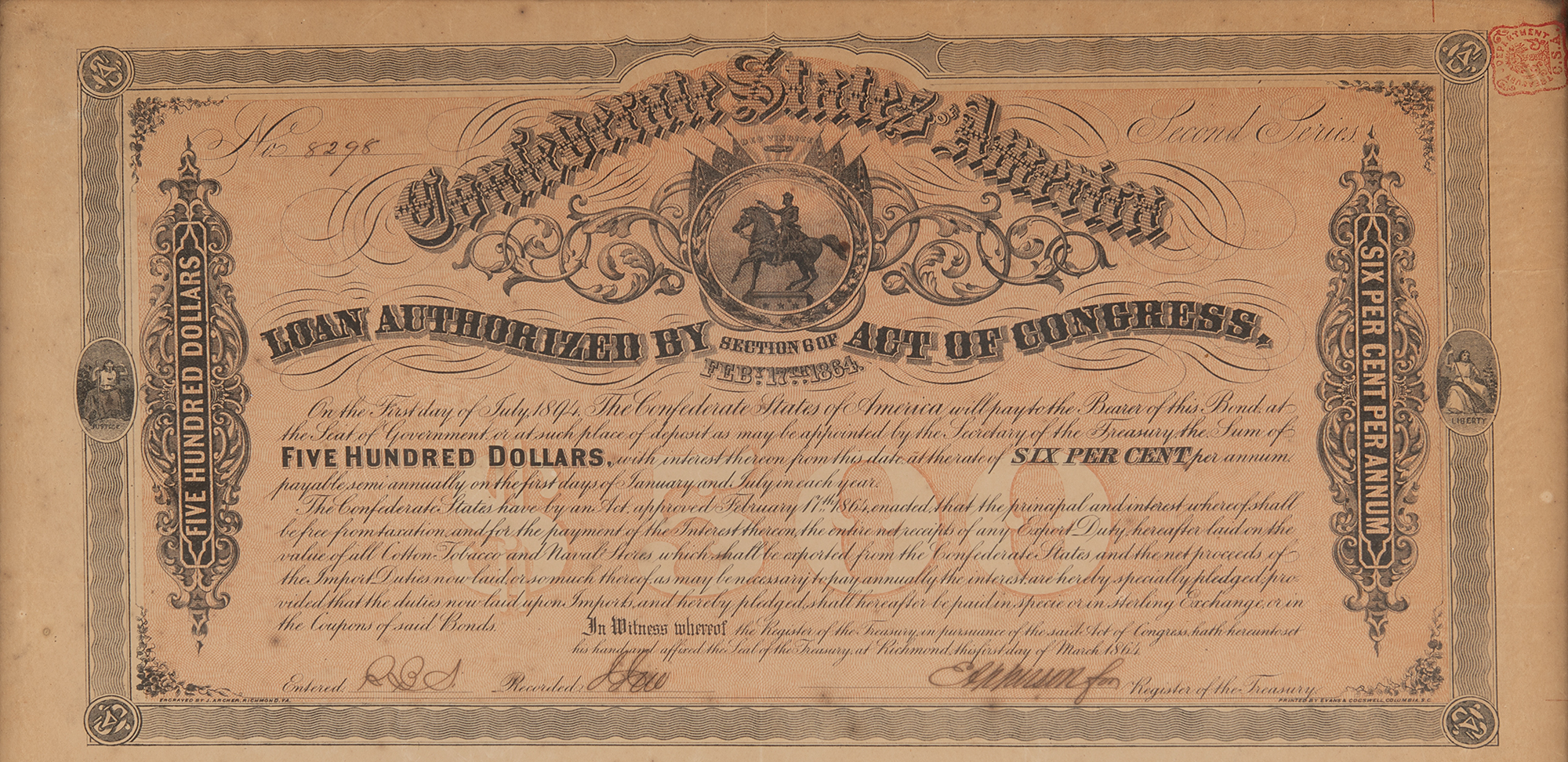 Civil War–dated bond issued by the Confederate States of America, one page, 16.5 x 27.5, March 1, 1864. Confederate bond in the amount of $500, carrying a rate of 6% per annum, retaining 59 of its 60 coupons intact below. Framed to an overall size of 18.5 x 29.5. In fine condition