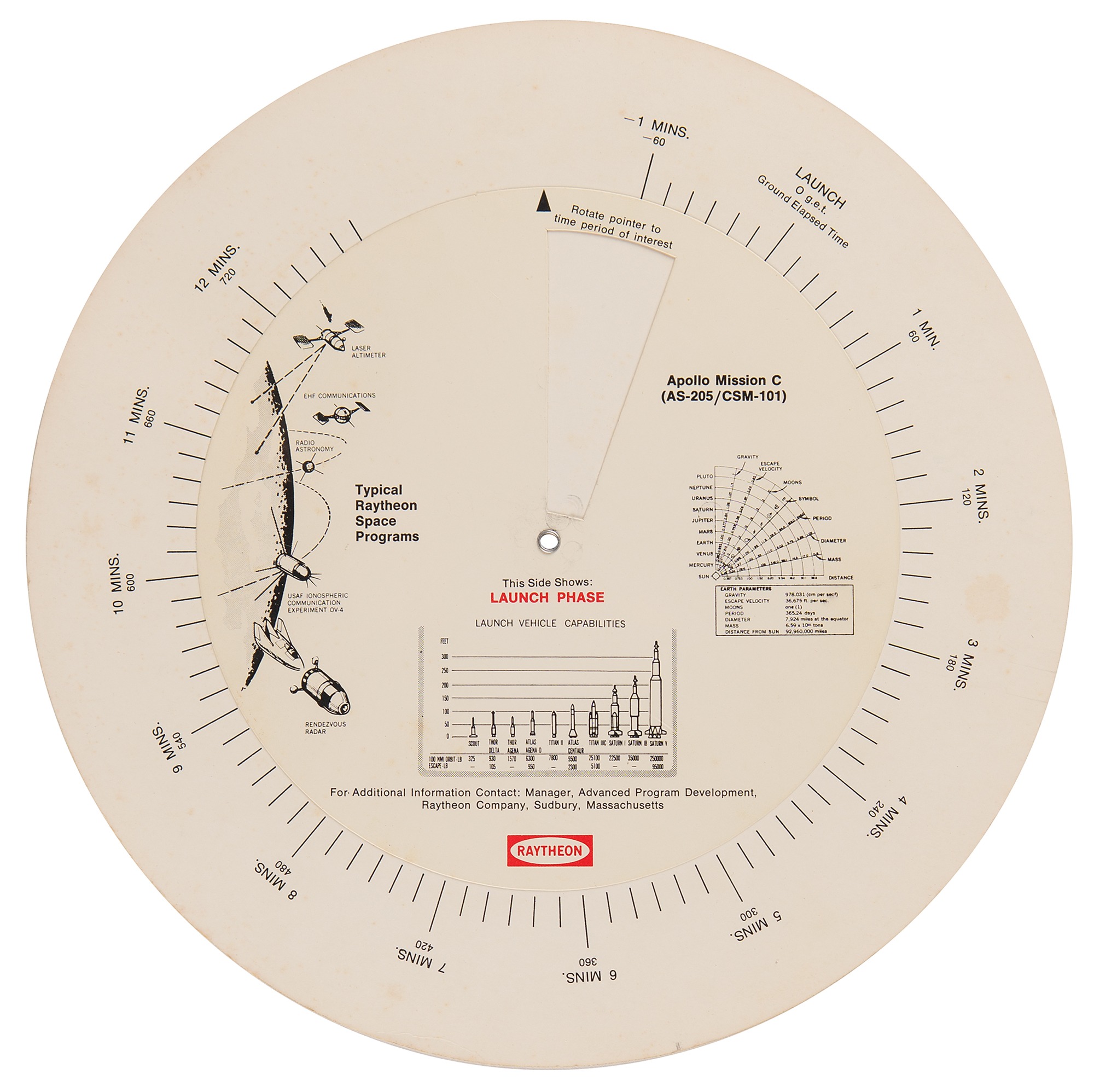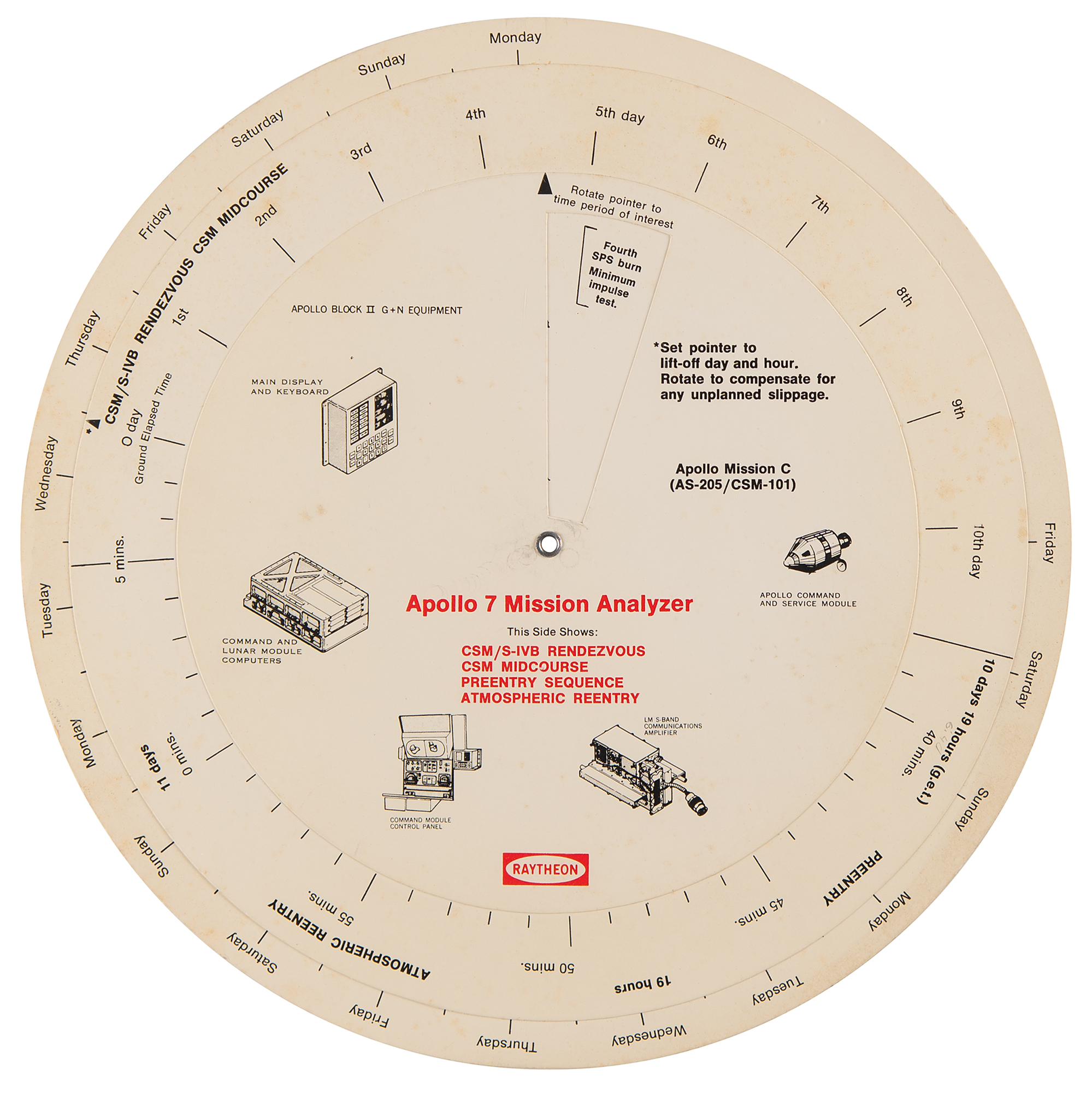 Scarce and desirable double-sided circular cardstock "Apollo 7 Mission Analyzer" rotating chart made by Raytheon in 1968, measuring 9.5″ in diameter, providing a guide for the mission's timeline and activities. One side shows the "Launch Phase" of the mission; the other shows "CSM/S-IVB Rendezvous," "CSM Midcourse," "Preentry Sequence," and "Atmospheric Reentry." In very good to fine condition, with a bit of scattered foxing and a few surface impressions.