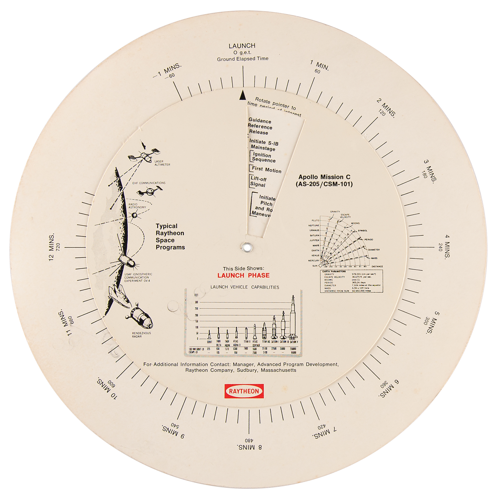 Scarce and desirable double-sided circular cardstock "Apollo 7 Mission Analyzer" rotating chart made by Raytheon in 1968, measuring 9.5″ in diameter, providing a guide for the mission's timeline and activities. One side shows the "Launch Phase" of the mission; the other shows "CSM/S-IVB Rendezvous," "CSM Midcourse," "Preentry Sequence," and "Atmospheric Reentry." In very good to fine condition, with a bit of scattered foxing and a few surface impressions.