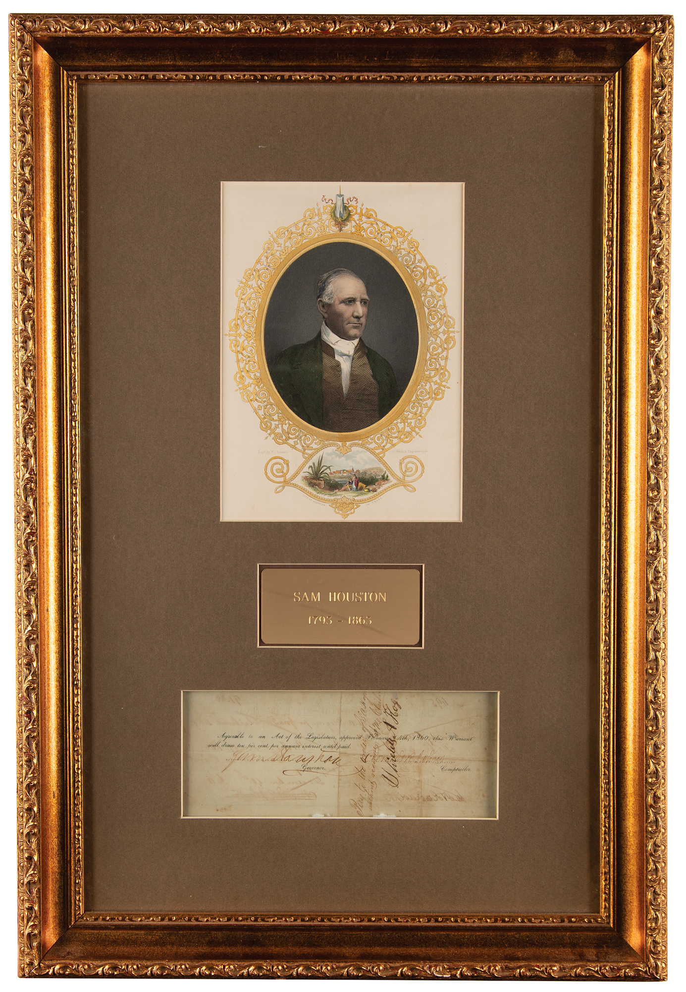 Partly-printed DS, one page, 8 x 3.25, December 10, 1860. Treasury warrant issued to Shields A. Hogan for $91.30 for "protection of the frontier, this amount being for services as Private in Capt. Burleson's Company." Signed on the front in ink by Treasurer Cyrus Halbert Randolph and Comptroller Clement R. Johns (Johns's signature canceled), and endorsed on the reverse by Governor Sam Houston and Comptroller Clement R. Johns. Attractively matted and framed with a plaque and hand-colored engraving to an overall size of 16.5 x 24.5; a window in the frame's backing allows the front to be viewed. In fine condition, with some light toning and soiling.