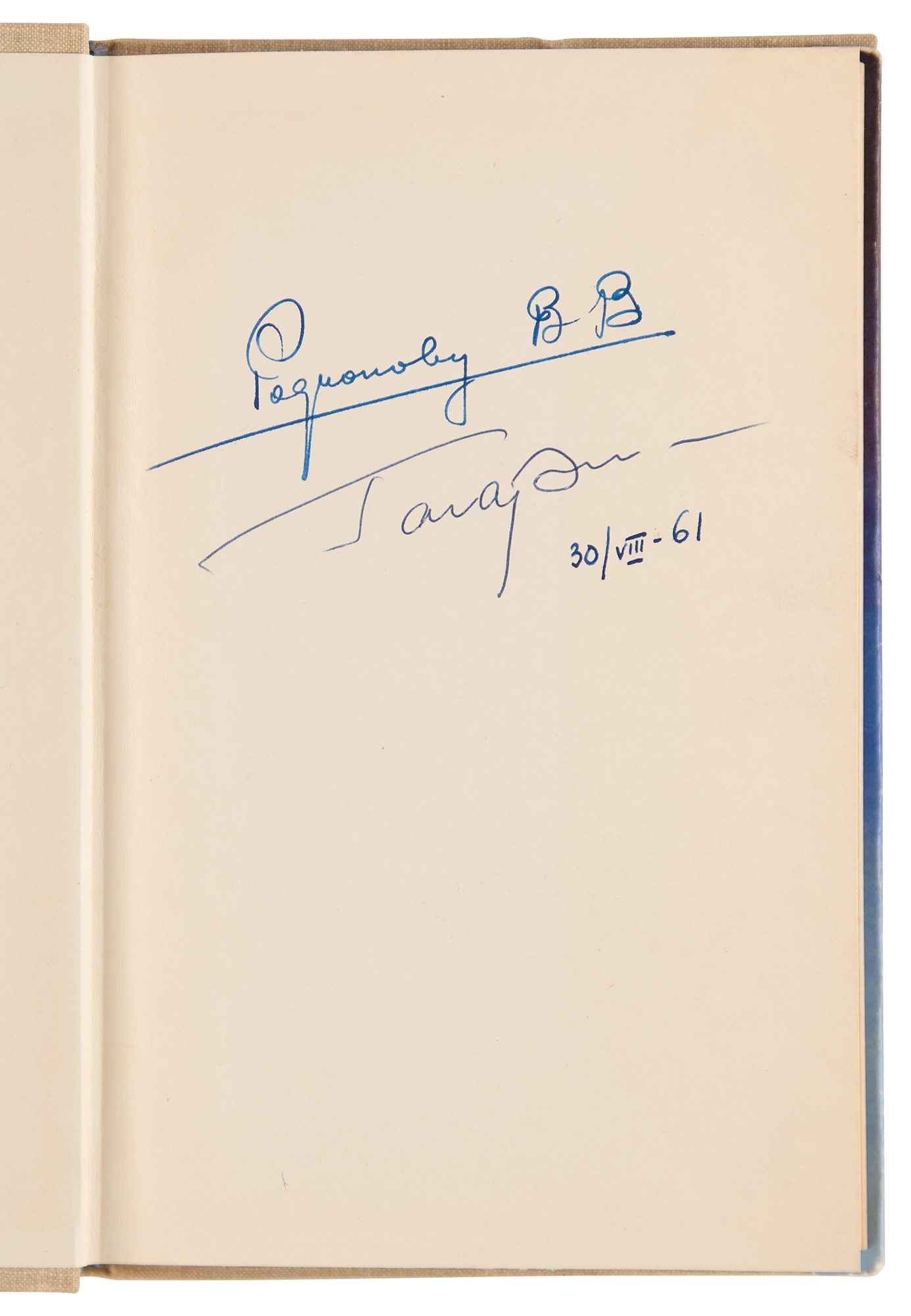 Signed book in Cyrillic: The Road to Space. Moscow: Pravda, 1961. Hardcover with dust jacket, 5.25 x 8.25, 174 pages. Signed on the first free end page in blue ballpoint by Yuri Gagarin. The same page is annotated in blue ink by the recipient, who has inscribed their own name, “to Rodionov B.B,” and added a date of August 30, 1961. The title page bears a printed facsimile of Gagarin’s signature. In fine condition, with slight wear and sunning to the dust jacket.