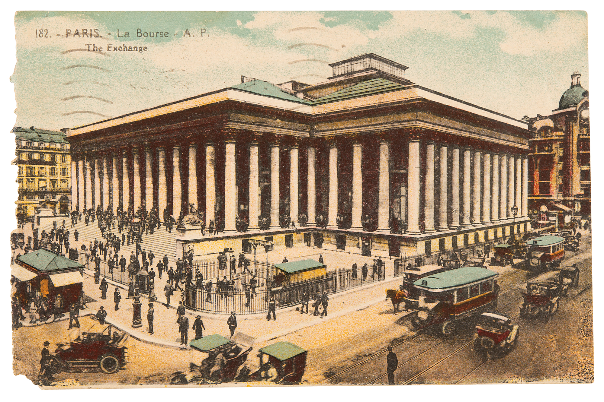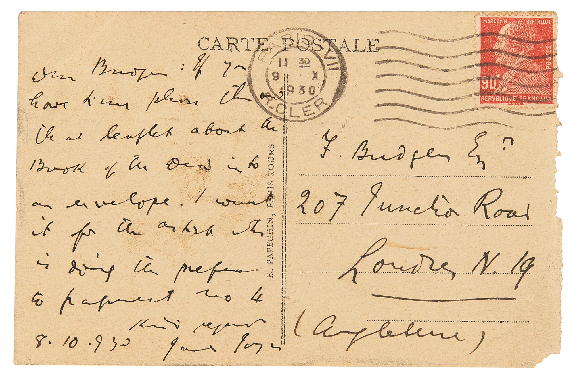 ALS, one page on a 5.25 x 3.5 color postcard depicting La Bourse, Paris, October 8, 1930. Handwritten letter to his friend Frank Budgen, in full: "If you have time please throw that leaflet about the Book of the Dead into an envelope. I want it for the artist who is doing the preface to pamphlet no. 4." In fine condition, with trivial loss to the lower right corner tip.
