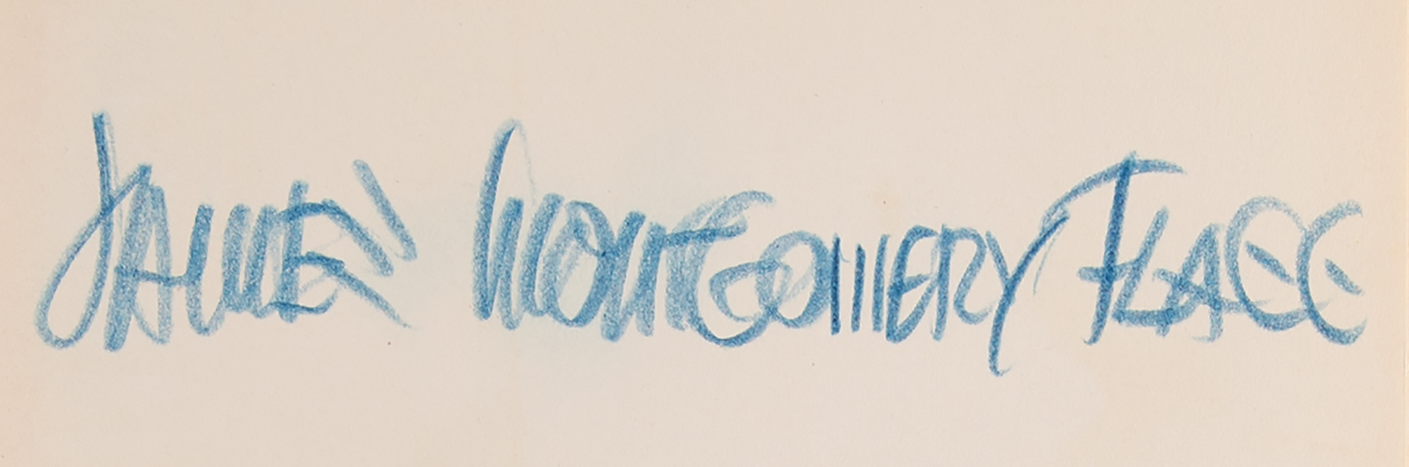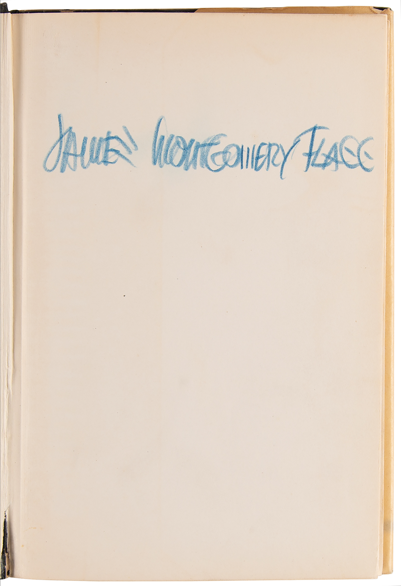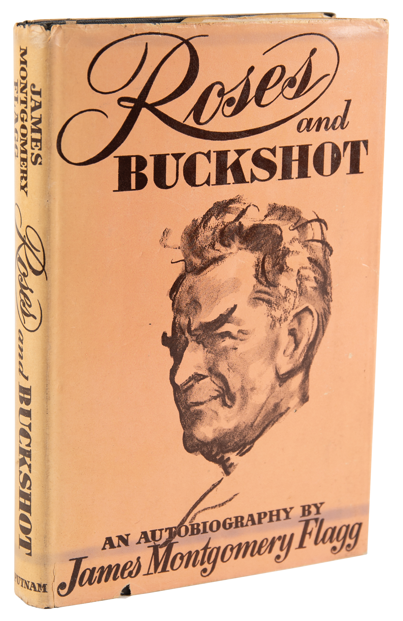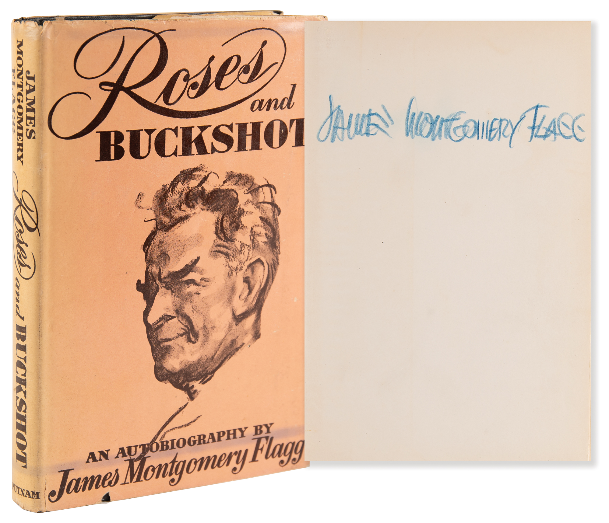 Signed book: Roses and Buckshot. Later printing. NY: G. P. Putnam's Sons, 1946. Hardcover with dust jacket, 6 x 8.5, 224 pages. Signed on the first free end page in blue artist's pencil, "James Montgomery Flagg." In fine condition, with sunning to the dust jacket spine, and a small split to the bottom of the front hinge.