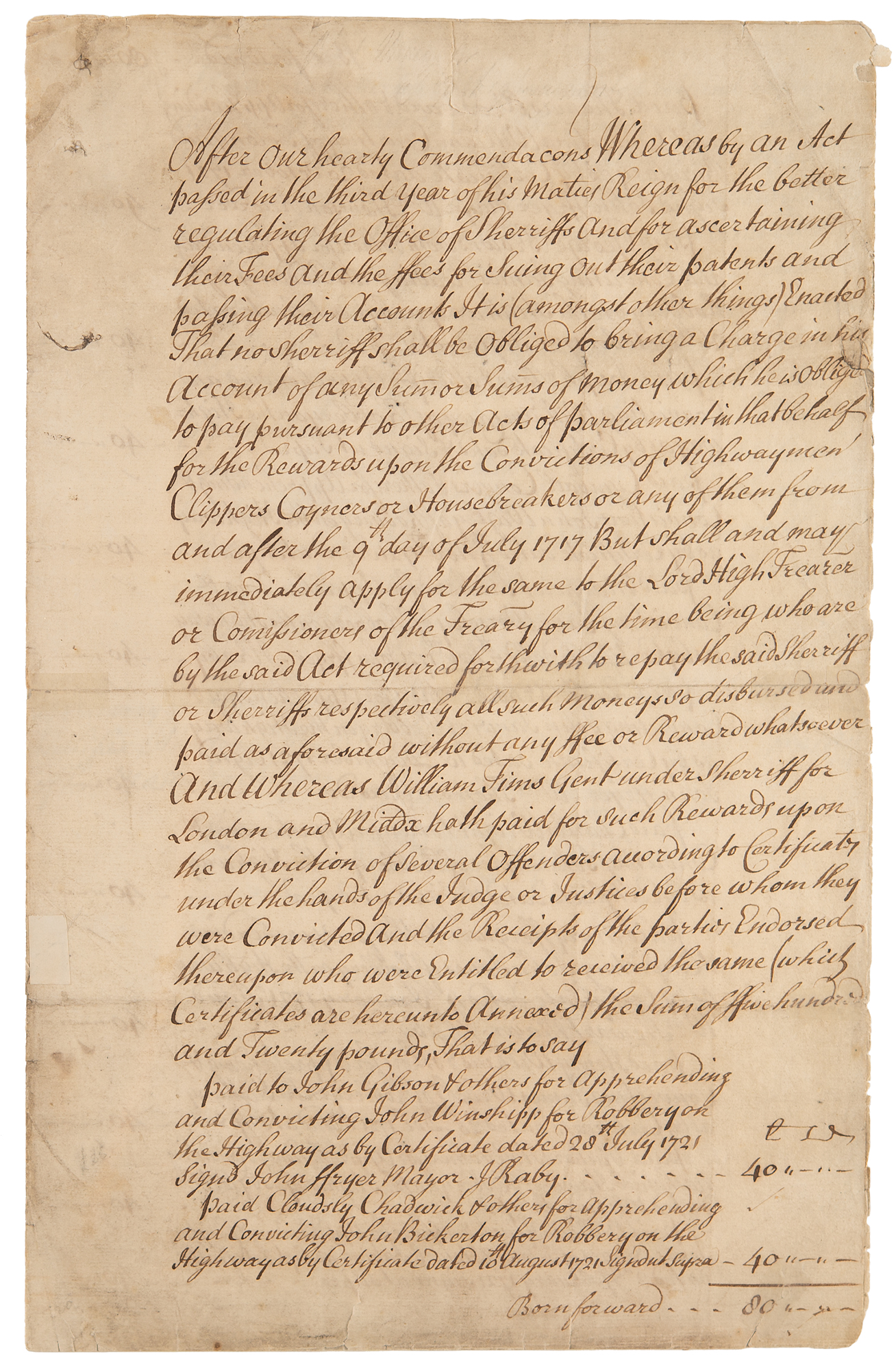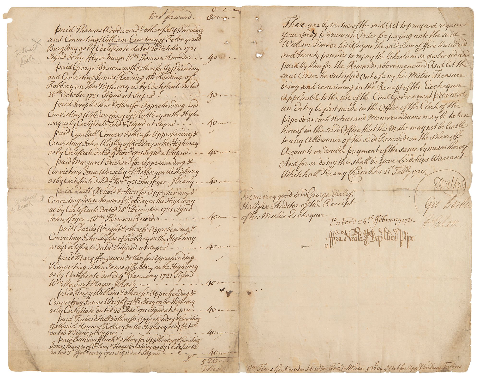 Manuscript DS, signed “Walpole” and "H Pelham," three pages on two adjoining sheets, 9 x 14, February 21, 1721/2. Document reimbursing William Tims, Under Sheriff of London and Middlesex, for amounts he paid to others for the apprehension and conviction of Highwaymen (i.e., robbers), Clippers (i.e, shavers of coins), Coyners (i.e., counterfeiters), and Housebreakers, naming those convicted of said crimes. Signed at the conclusion in ink by Robert Walpole, George Baillie, and Henry Pelham as Commissioners of the Treasury under King George I. In very good to fine condition, with creasing, soiling, and various small archival repairs.