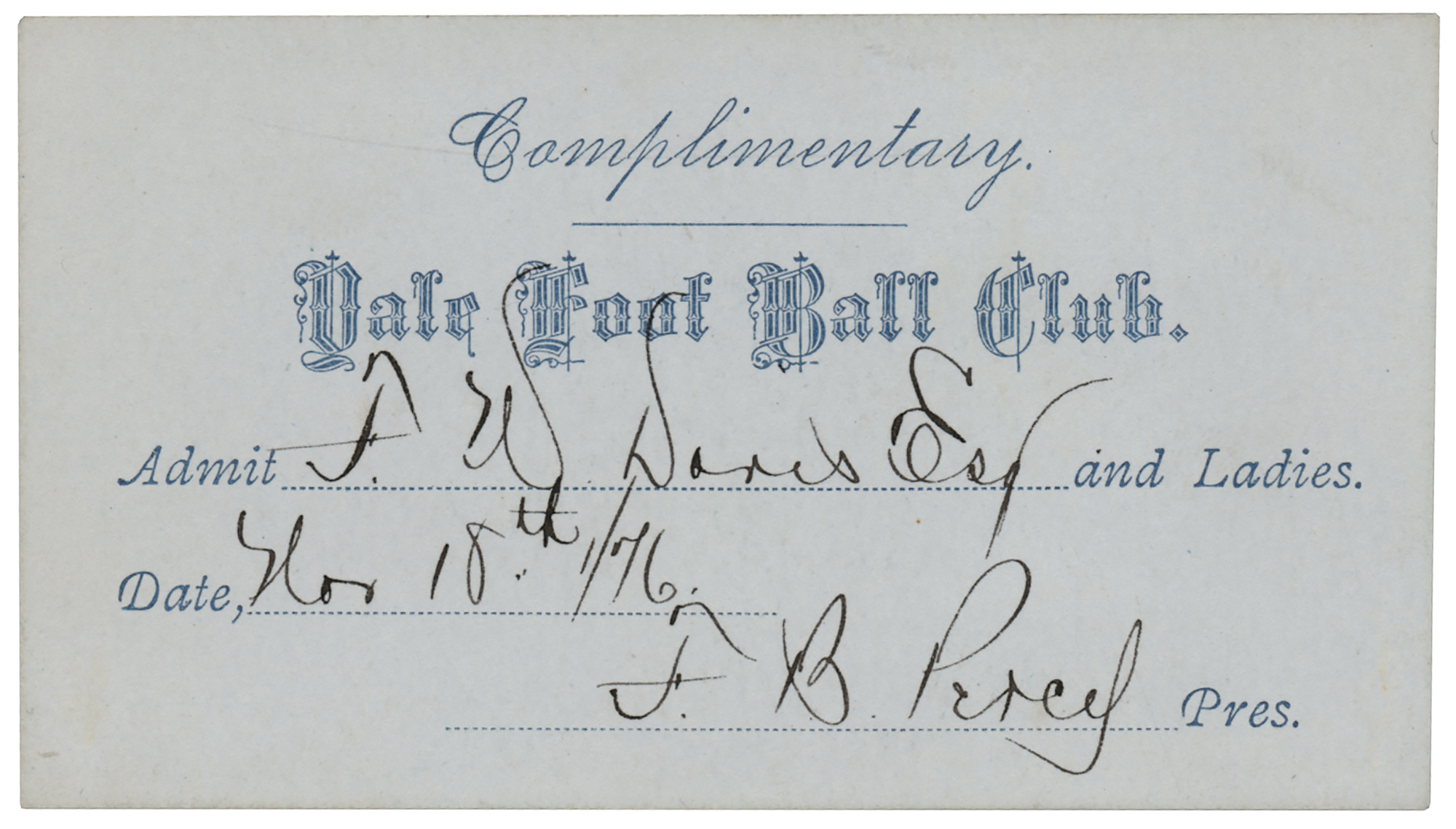 Extremely rare complimentary admittance pass from the “Yale Foot Ball Club,” 4.5 x 2.25, November 18, 1876. The pass admits “F. W. Davis, Esq. and Ladies," and is signed in ink by the club president Frederick B. Percy, "F. B. Percy." In very fine condition.