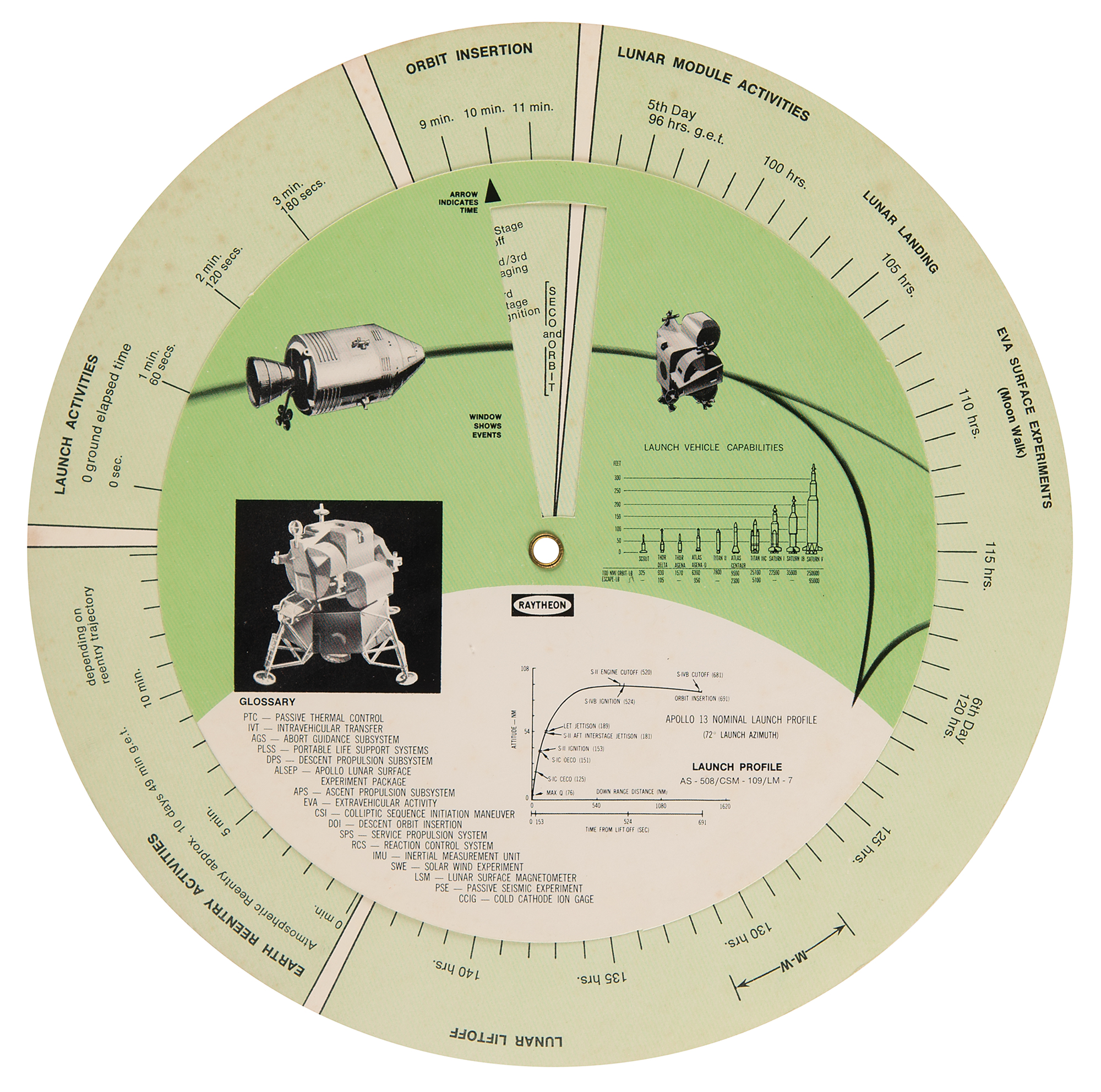 Uncommon double-sided circular cardstock "Apollo 13 Mission Analyzer" rotating chart made by Raytheon in 1970, measuring 9.5″ in diameter, providing a guide for the mission's timeline and activities from launch to splashdown. The disastrous explosion of an oxygen tank on the third day forced the astronauts to improvise a safe return to Earth, using the Lunar Module as a 'lifeboat'; this chart represents what would have happened had the mission gone according to plan. In very good to fine condition, with light scattered foxing.