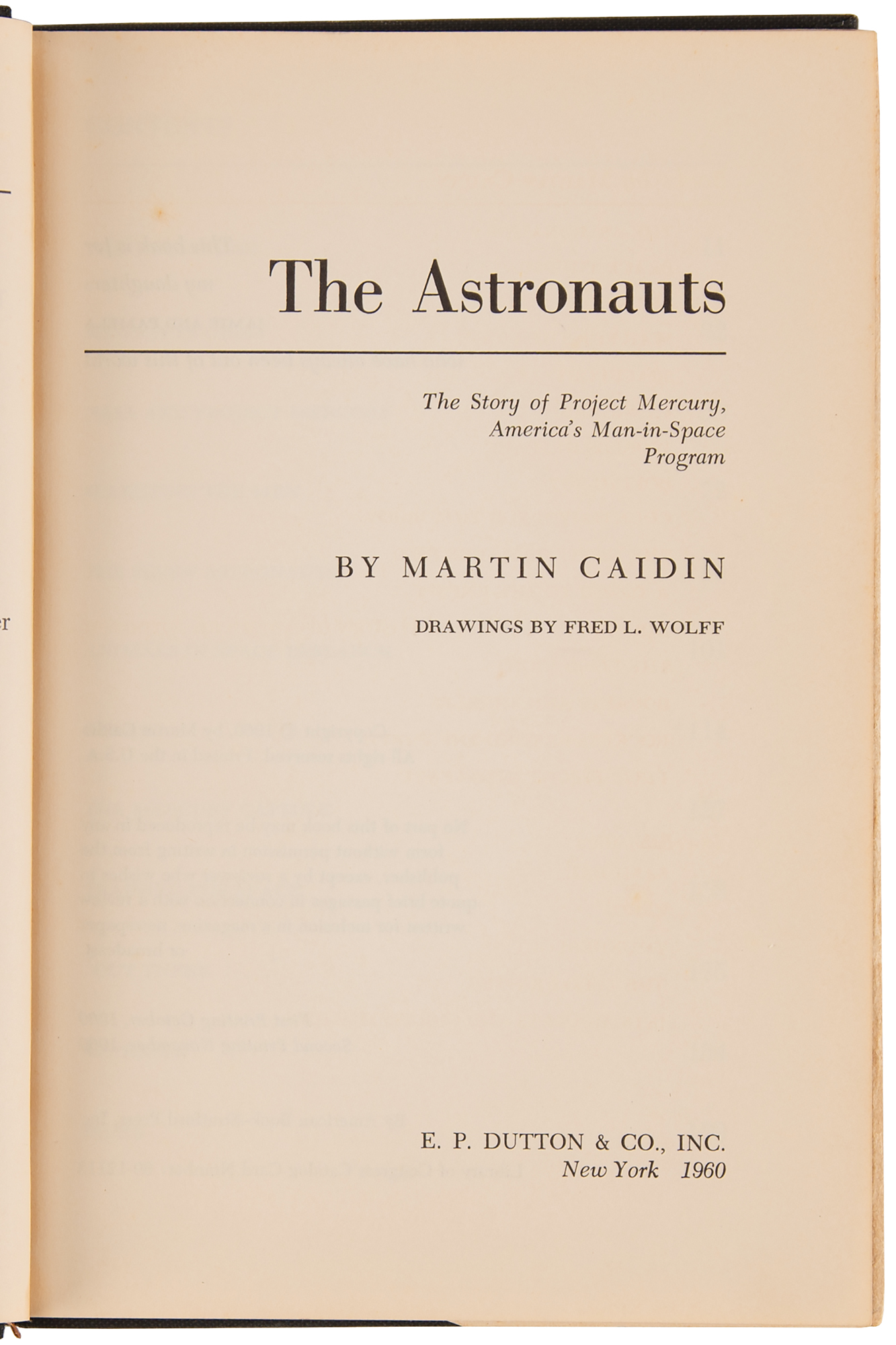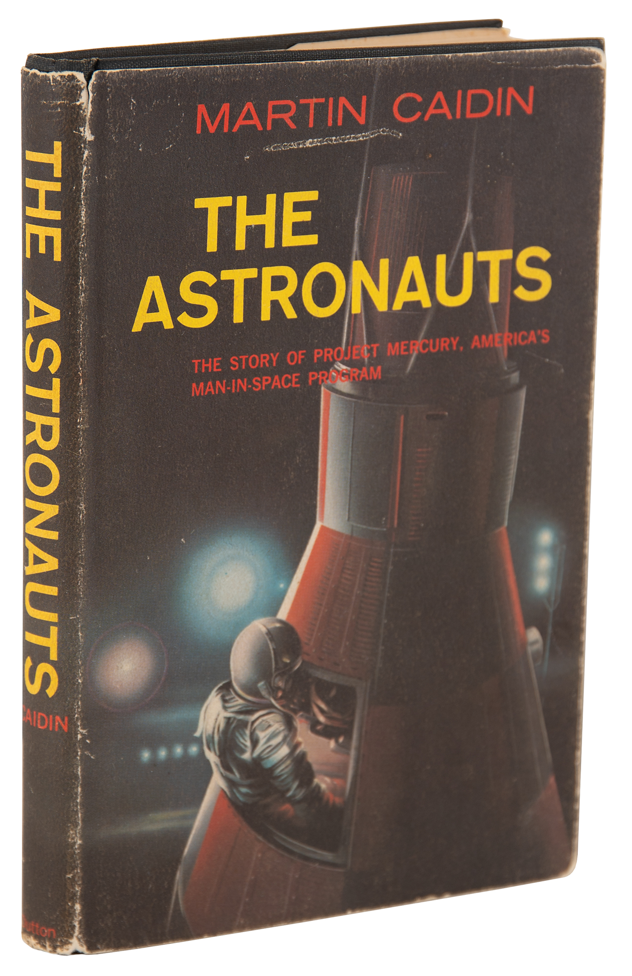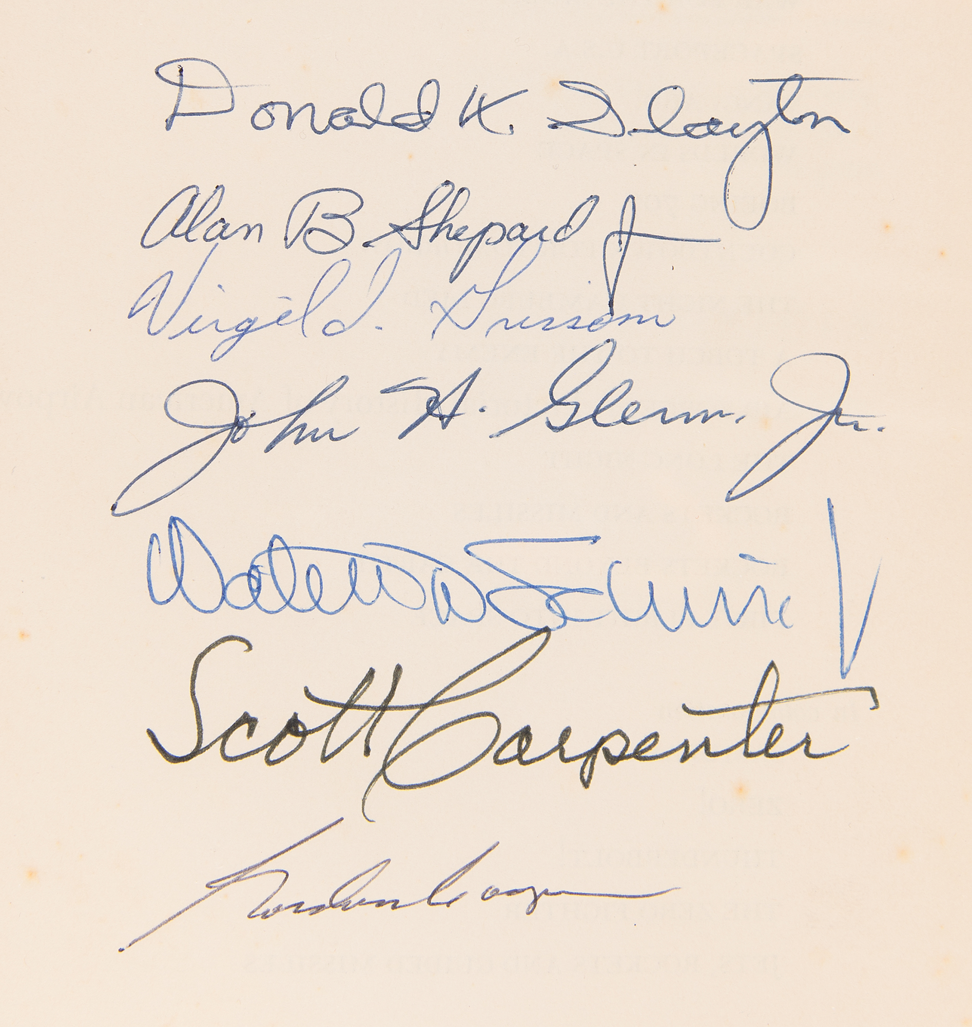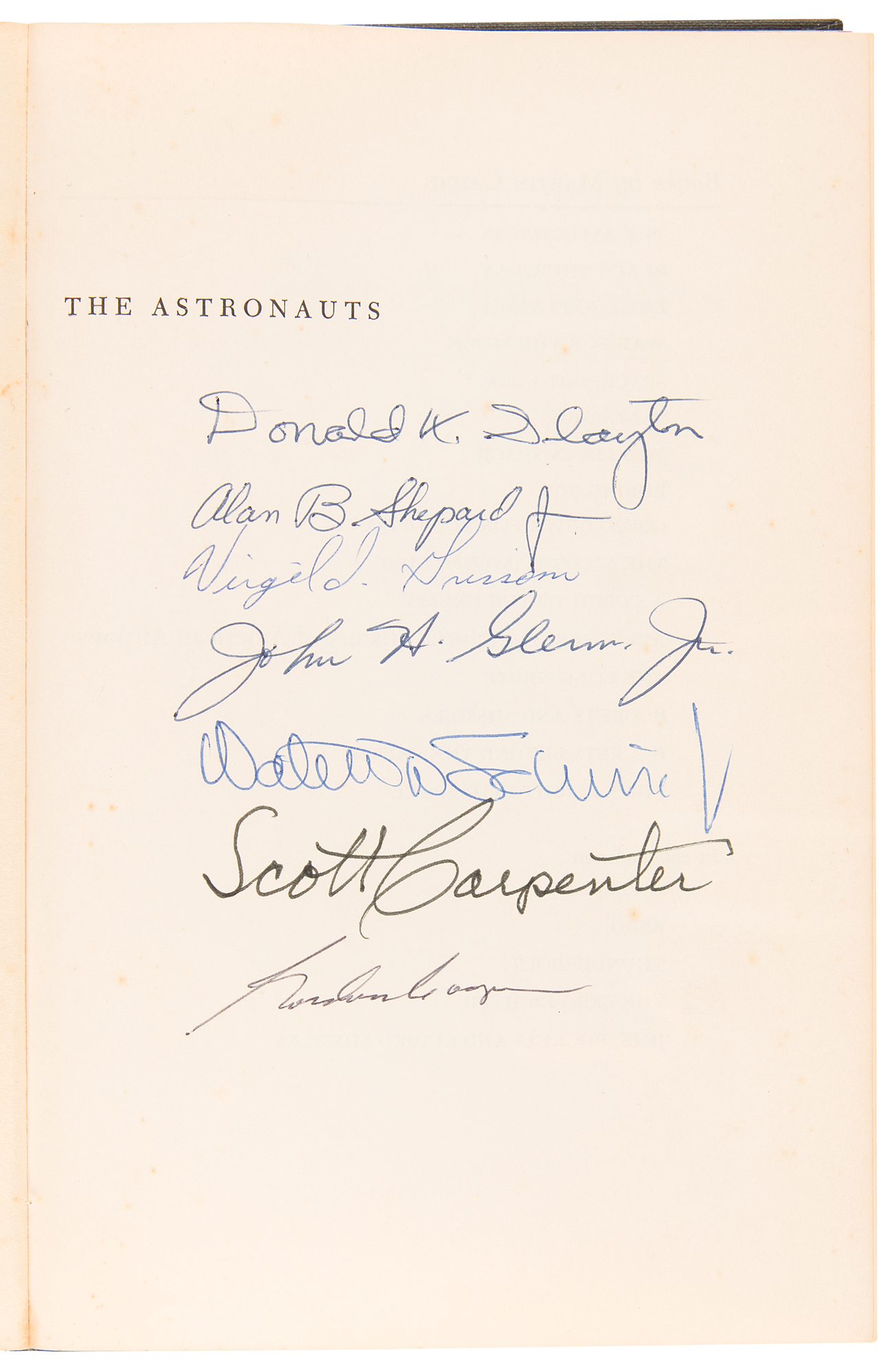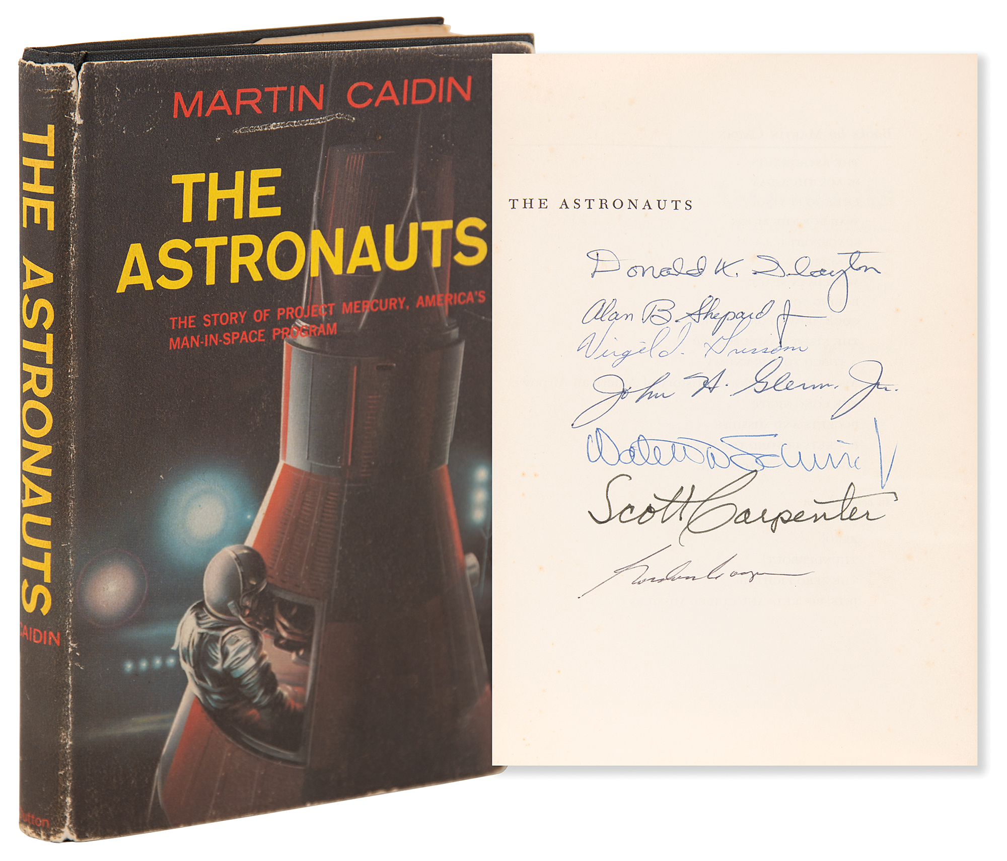 Signed book: The Astronauts: The Story of Project Mercury, America's Man-in-Space Program by Martin Caidin. Second printing. NY: E. P. Dutton & Co., November 1960. Hardcover with dust jacket, 5.75 x 8.25, 192 pages. Signed on the first free end page in various ink types by all seven Mercury astronauts: “Donald K. Slayton,” “Alan B. Shepard, Jr.,” “Virgil I. Grissom,” “John H. Glenn, Jr.,” “Walter M. Schirra, Jr.,” “Scott Carpenter,” and “Gordon Cooper.” In very good to fine condition, with light wear to the dust jacket, and staining and foxing to the end pages and pastedowns, not affecting the signed page. Accompanied by a full letter of authenticity from JSA.