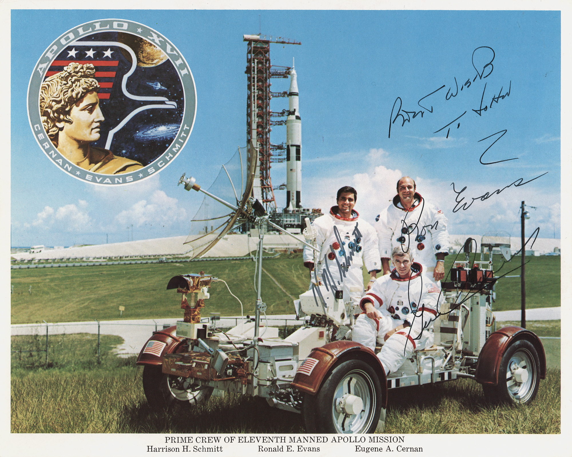 Official color 10 x 8 NASA lithograph of the crew of Apollo 17 posing outside in their white space suits with the lunar rover on a sunny day, with the Saturn V rocket looming in the background, signed and inscribed in black ink, "Best wishes to John, Gene Cernan" and "Ron Evans," and in black felt tip, "H. H. Schmitt.” In very fine condition.