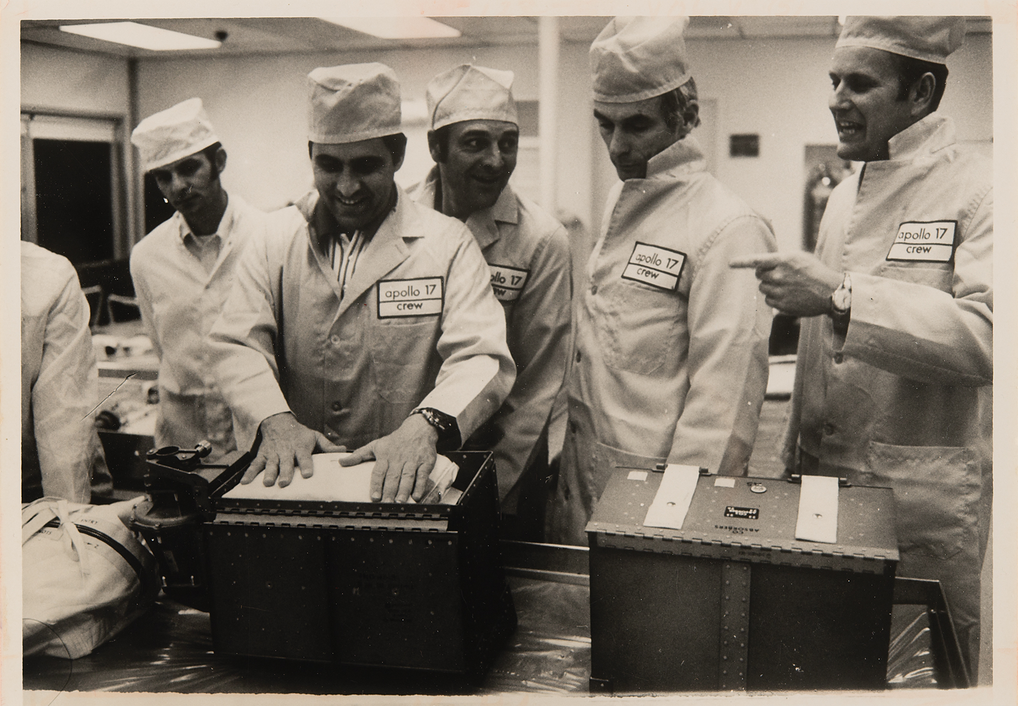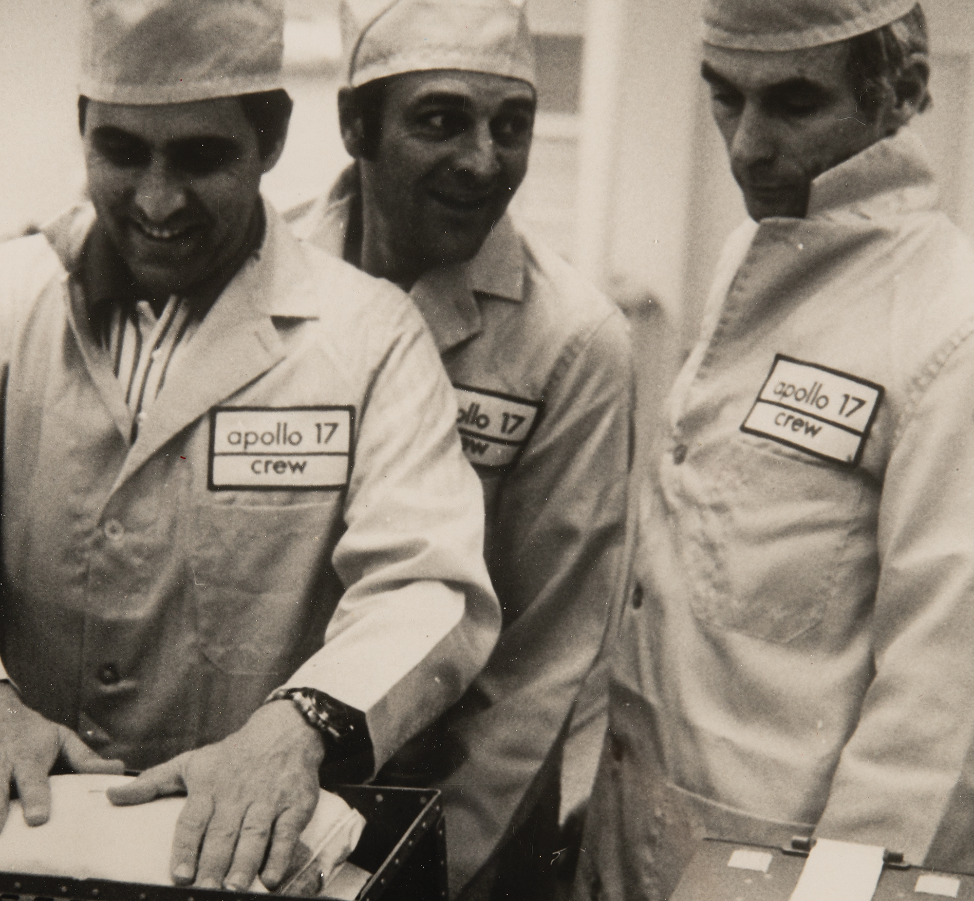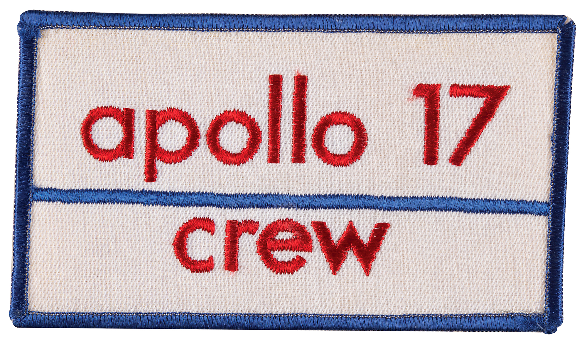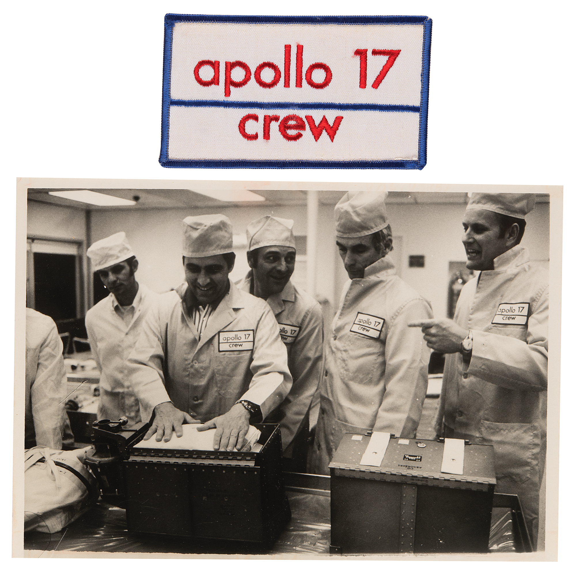 Two items: an original embroidered “Apollo 17, Crew” training patch, 4.75˝ x 2.75˝, with blue borders, stitched red lettering, and a white background; and a vintage glossy 10 x 7 photo of Apollo 17 astronauts Gene Cernan, Harrison Schmitt, and Ron Evans during a training procedure, each wearing a lab coat bearing the offered crew patch. In overall fine condition.