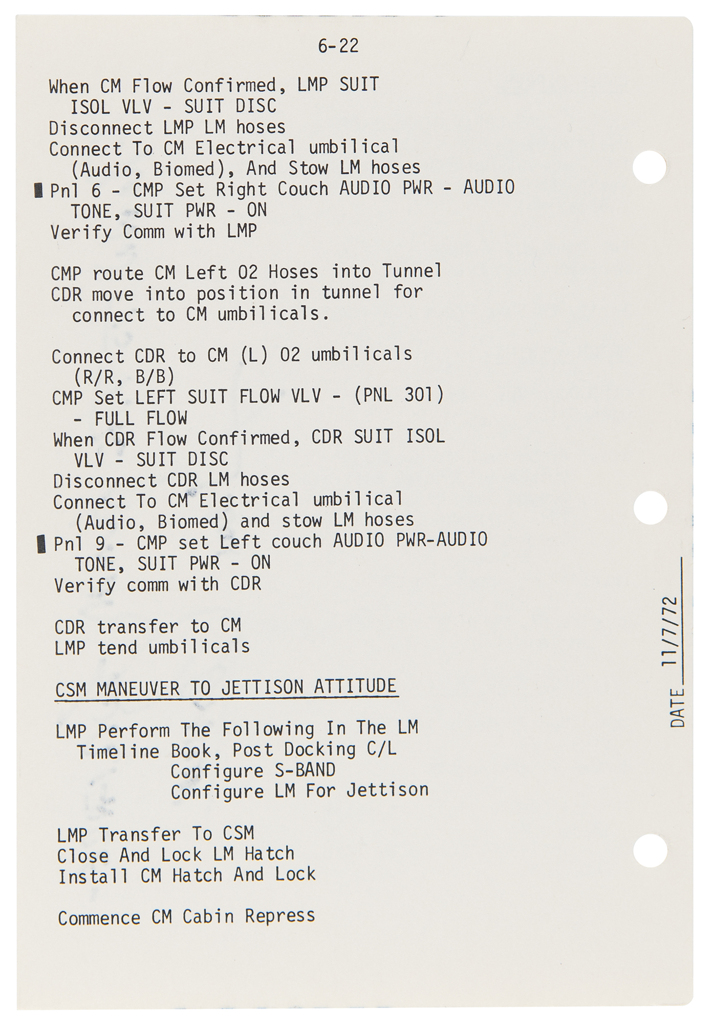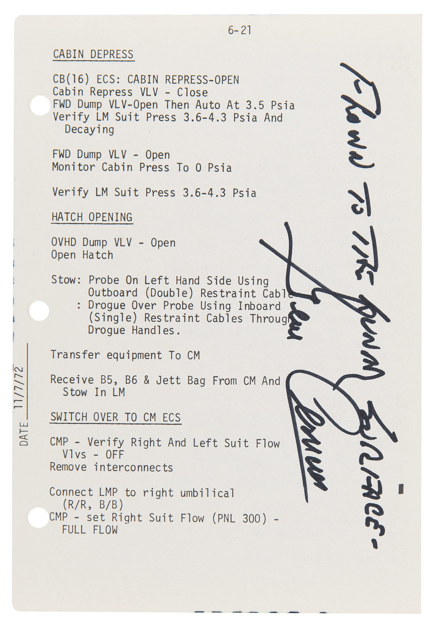 Impressive flown checklist page carried to the moon’s surface aboard the Lunar Module Challenger during the Apollo 17 mission, 5.5 x 8, vertically signed and flight-certified in black felt tip, “Flown to the lunar surface – Gene Cernan.” This notable dual-sided page, dated November 7, 1972, and numbered “6-21” and “6-22,” details the final steps of the Apollo 17 mission where the LM Challenger’ was prepared for separation and later jettisoned into space before the crew reentered earth's atmosphere. These steps include: “Cabin Depress,” “Hatch Opening,” “Switch Over to CM ECS,” and “CSM Maneuver to Jettison Attitude.” In very fine condition. An exceptional lunar-flown checklist page that represents one of the final maneuvers of the historic Apollo program.
