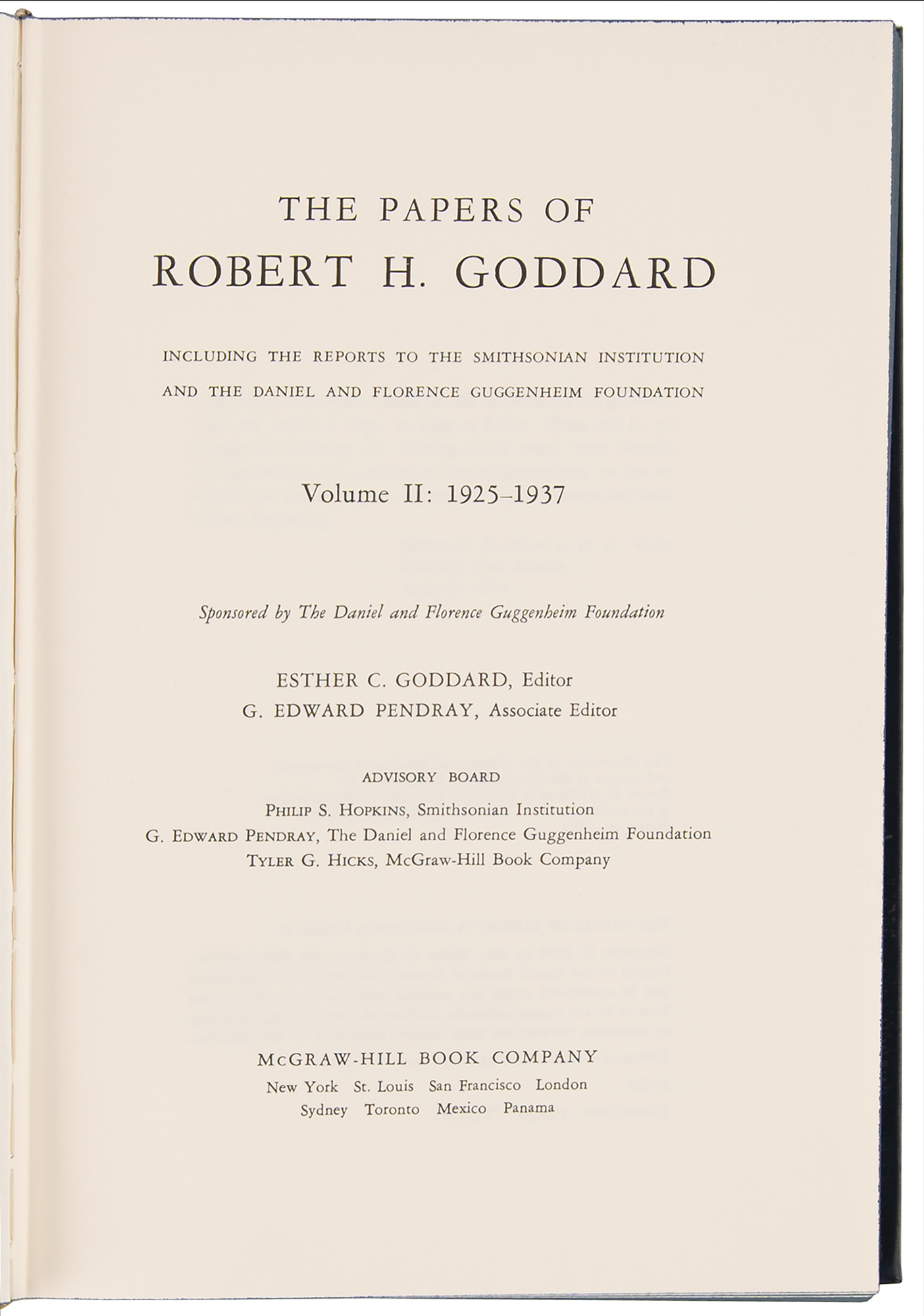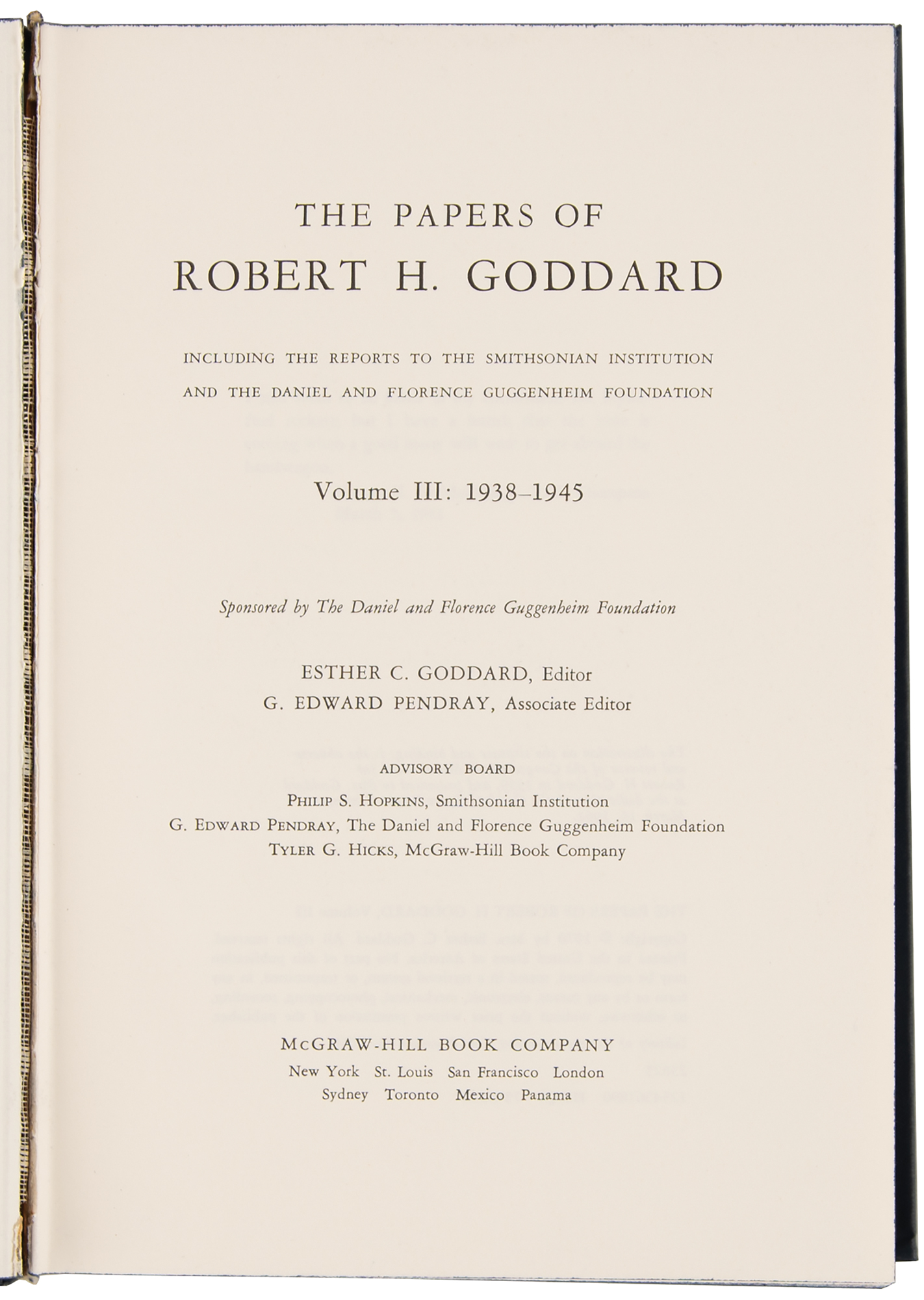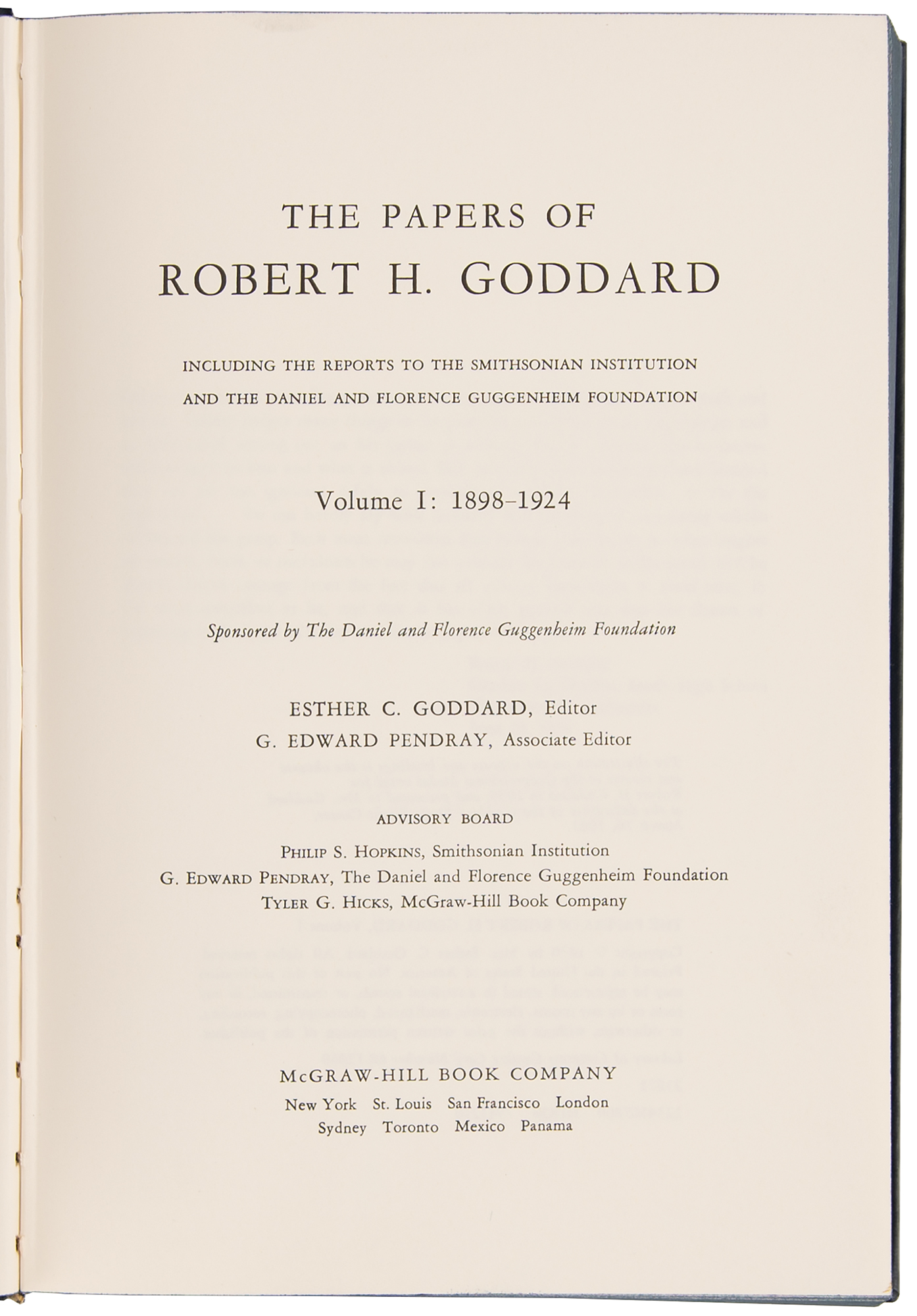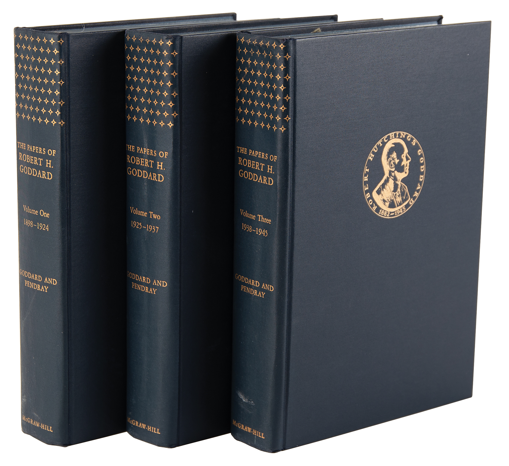 Physicist and inventor (1882-1945) credited with creating and building the world's first liquid-fueled rocket. Scarce complete hardcover three-volume set of The Papers of Robert H. Goddard. NY: McGraw-Hill, 1970. Hardcovers with slipcase, 7 x 10, 1707 total pages. In overall fine condition, with scuffing and wear to slipcase. An impressive collection of Goddard's influential work.