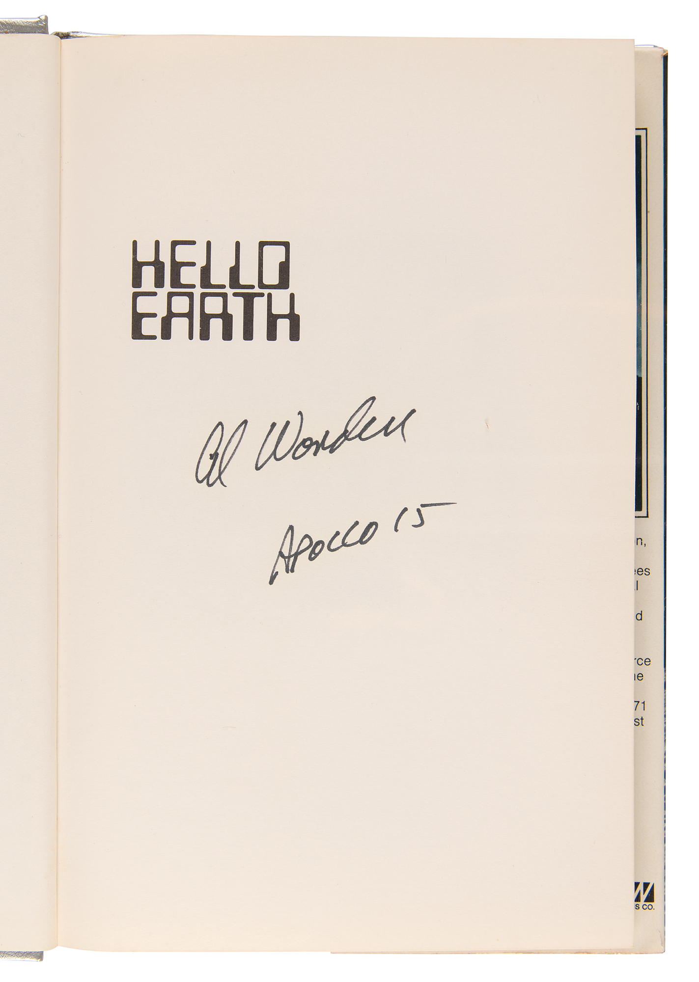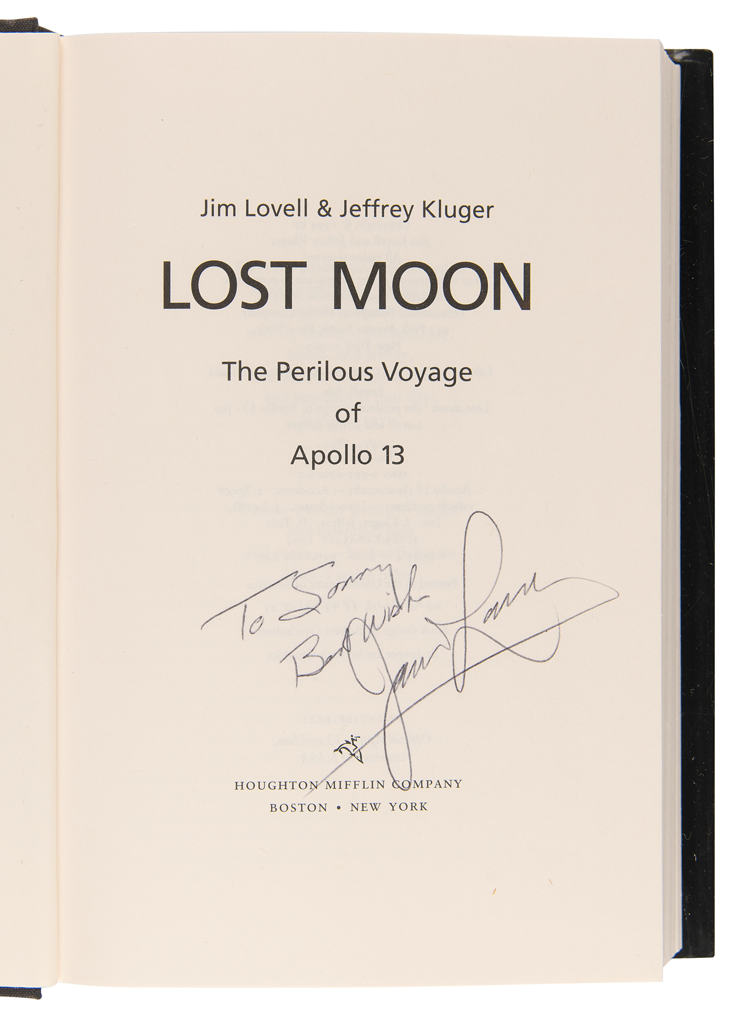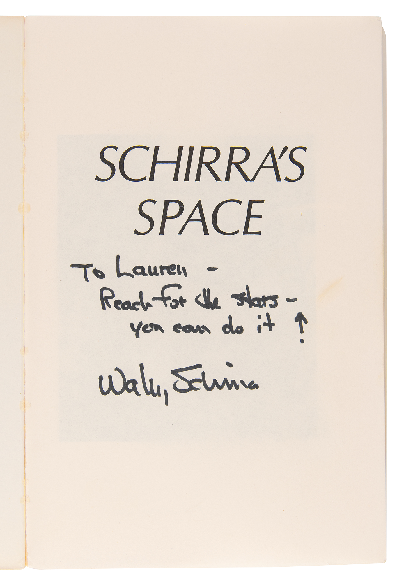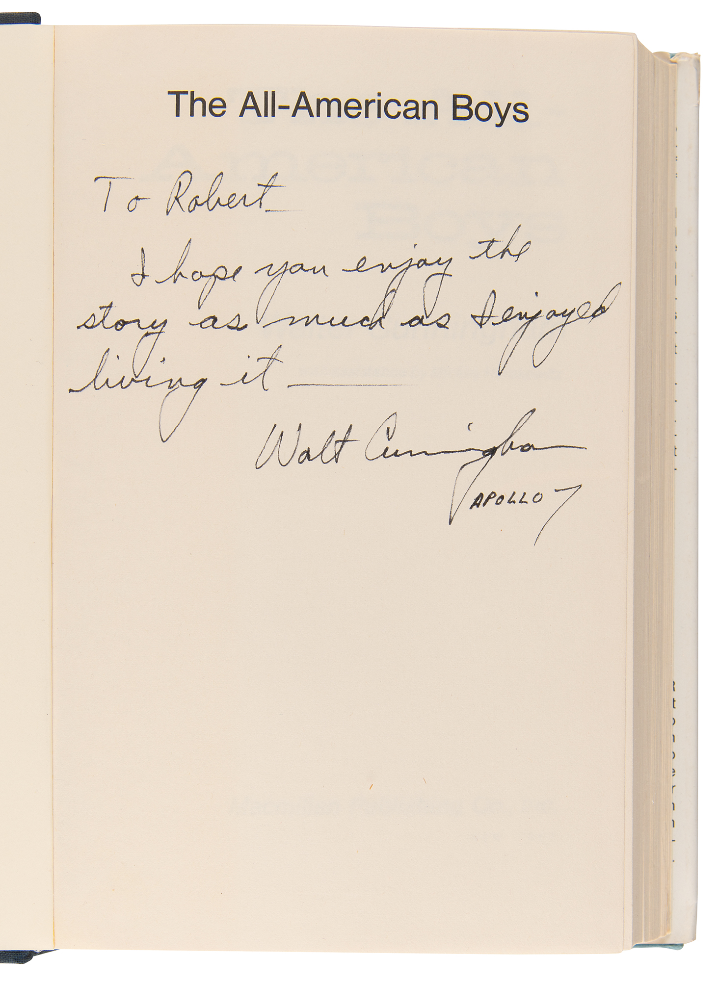Four books signed on an opening page in ink or felt tip by an Apollo astronaut: Walt Cunningham (The All-American Boys), James Lovell (Lost Moon), Wally Schirra (Schirra’s Space), and Al Worden (Hello Earth). Only Worden has not added an inscription, and each book, sans Schirra’s Space, is hardcover with dust jacket. In overall fine condition.
