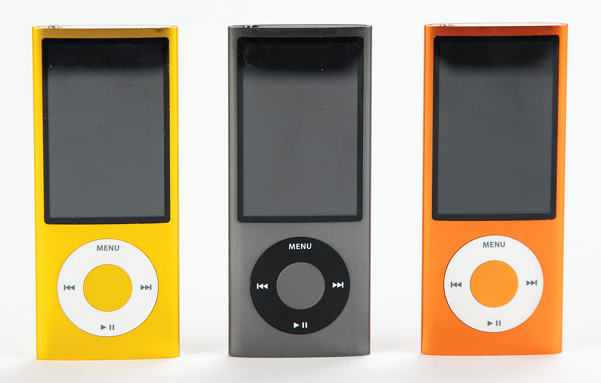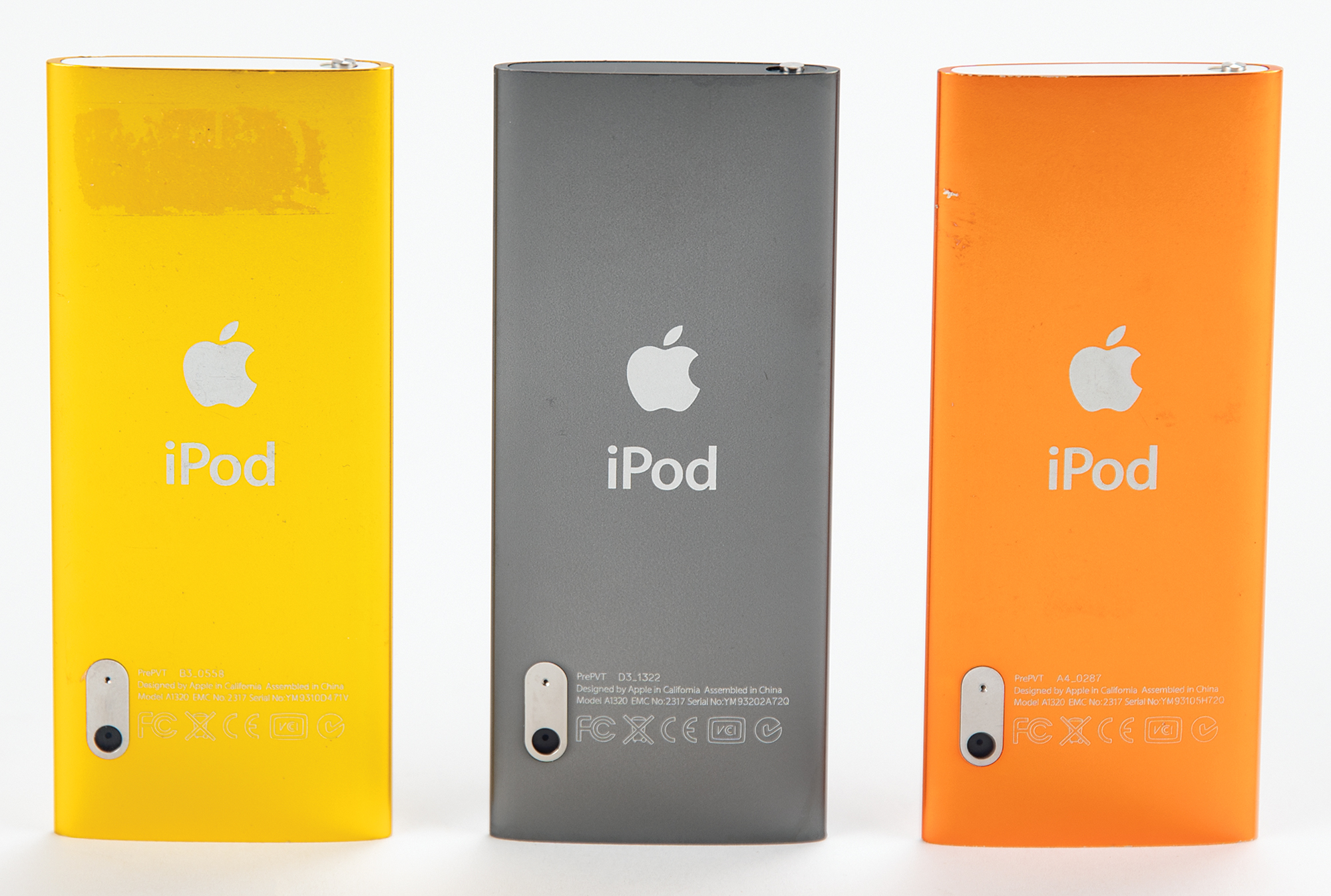 Scarce set of three 5th generation Apple iPod Nano prototypes in orange (A4_0287), yellow (B3_0558), and black (D3_1322), each marked on the lower back as “PrePVT” or ‘Pre Production Validation Test.’ The reverse of each Nano bears an affixed swatch of yellow tape with annotations that read: Orange: “OS 1.0.2 PC, ½ Full ‘Other,’ No Issues”; Yellow: “OS 1.0 (34A052) PC, HD Full ‘Other,’ No Issues”; and Black: “OS 1.0 (341056) PC, Nothing on HD, No Issues.” In overall fine, tested and working condition.
