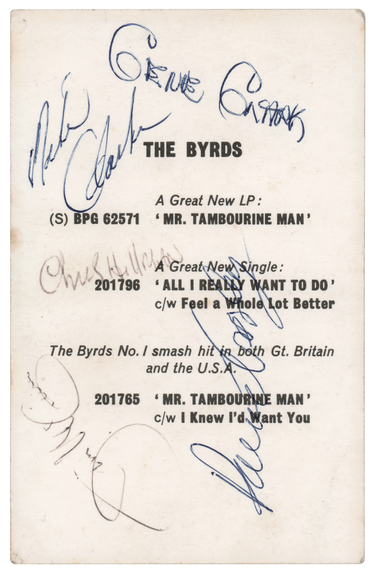 Vintage circa 1965 CBS Records promo card for the Byrds, 3.5 x 5.5, featuring a group photo on the front and new release information on the reverse, which is signed by the original five-piece lineup in blue and black ballpoint, “Jim McGuinn,” “David Crosby,” “Mike Clarke,” “Chris Hillman,” and “Gene Clark.” In fine condition, with some light creasing to the image side.