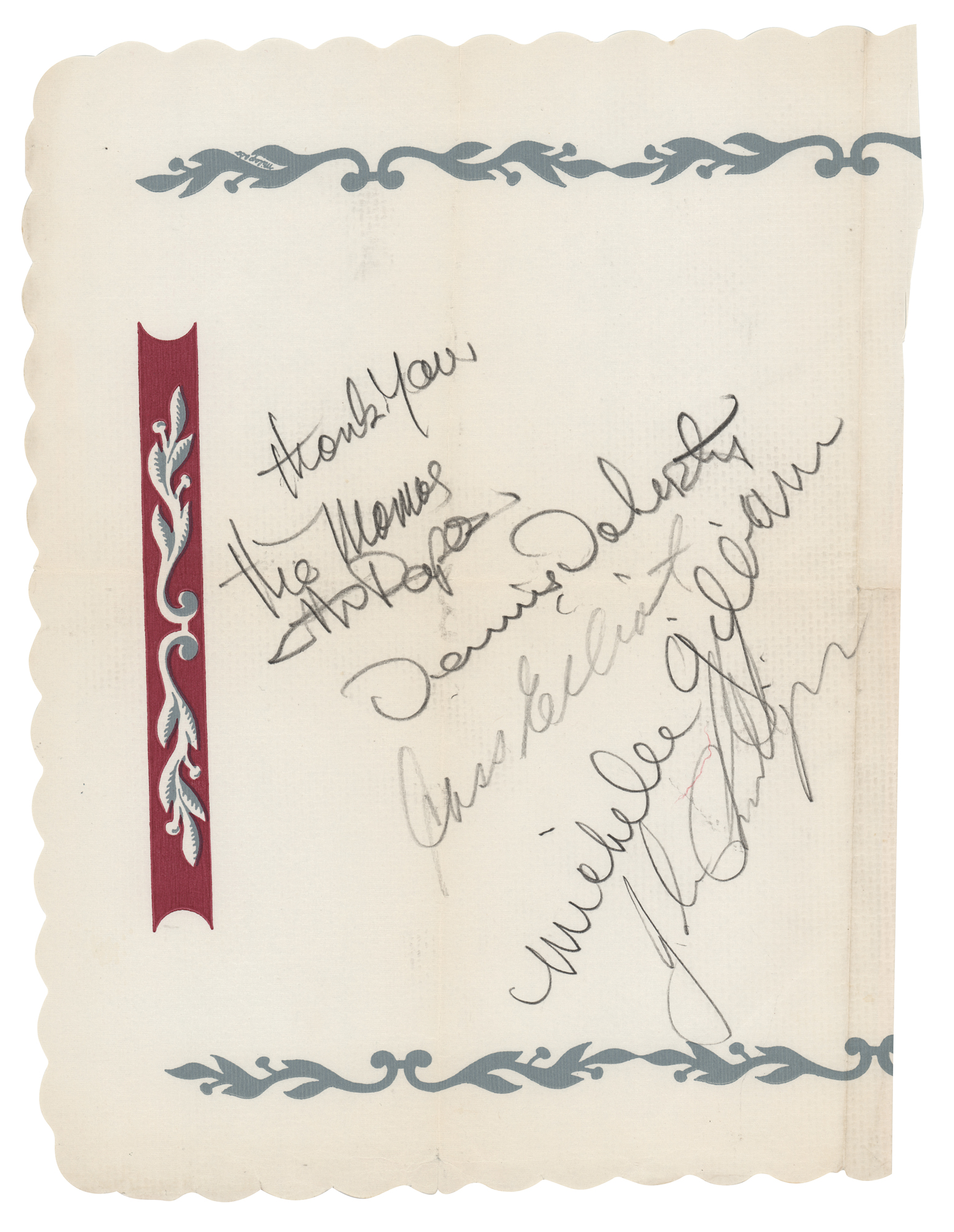 Early vintage pencil signatures, "thank you, the Mamas & the Papas, Dennis Doherty," "Cass Elliot," "Michelle Gilliam," and "John Phillips,” on a 7 x 9.5 partial decorative serviette. In fine condition, with intersecting folds and one trimmed edge. An interesting piece, as Michelle Phillips signs with her maiden name, "Gilliam." While working as a model in San Francisco in 1962, she met and married John Phillips; they went on to co-found the Mamas & the Papas together in 1965.
